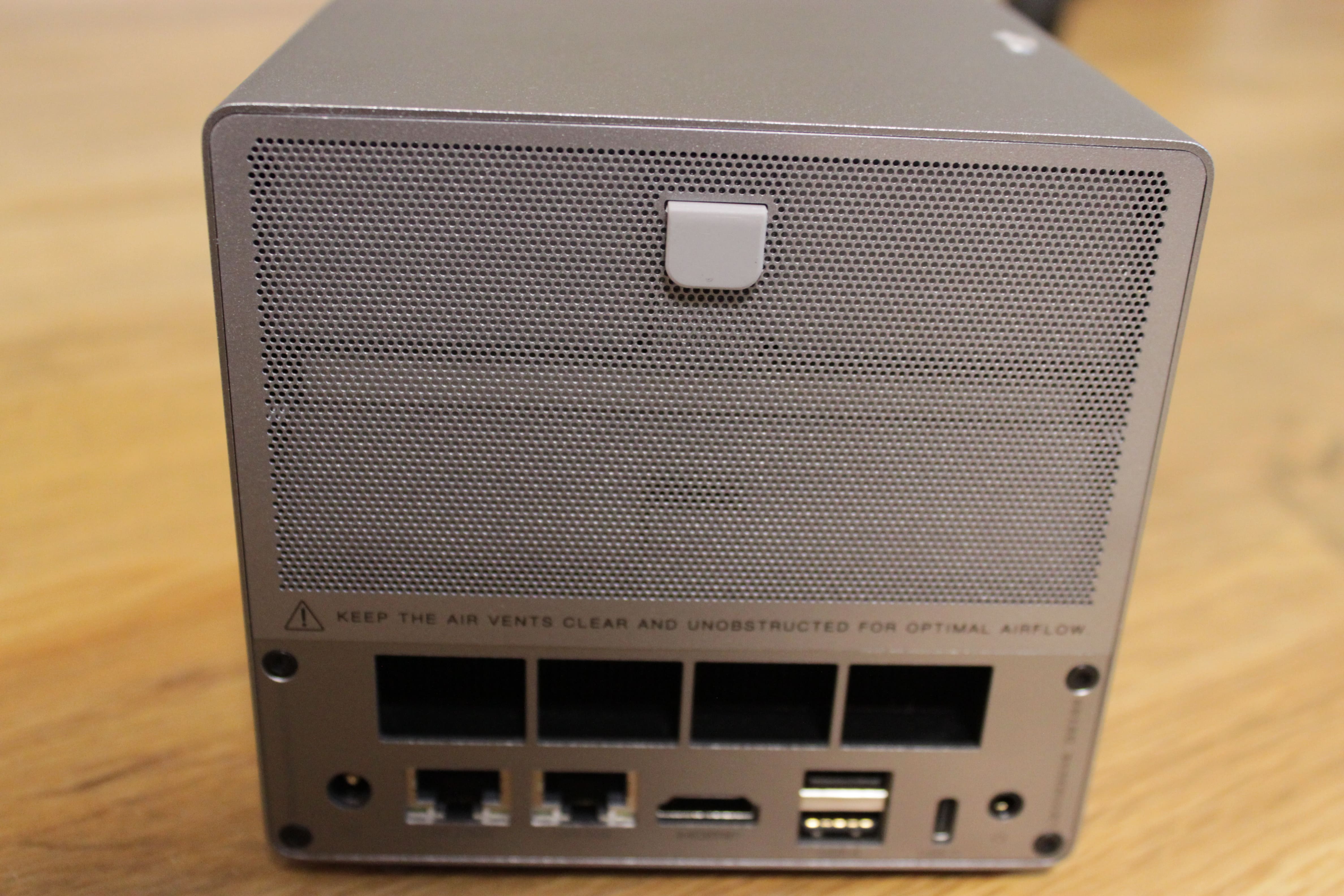 Darunter befinden sich vier größere Lüftungsöffnungen, die für das Mainboardmodul und die Platten darüber einen optimalen Airflow gewährleisten. Unter den Luftlöchern befinden sich die Hauptanschlüsse für das NAS. Dazu gehören zwei Ethernet-Ports, ein HDMI-Anschluss und drei weitere USB-Anschlüsse. Nicht zu vergessen ist der Rundsteckeranschluss für das Netzteil sowie ein für eine NAS-Nutzung ungewöhnlicher 3,5mm-Klinkenanschluss.
