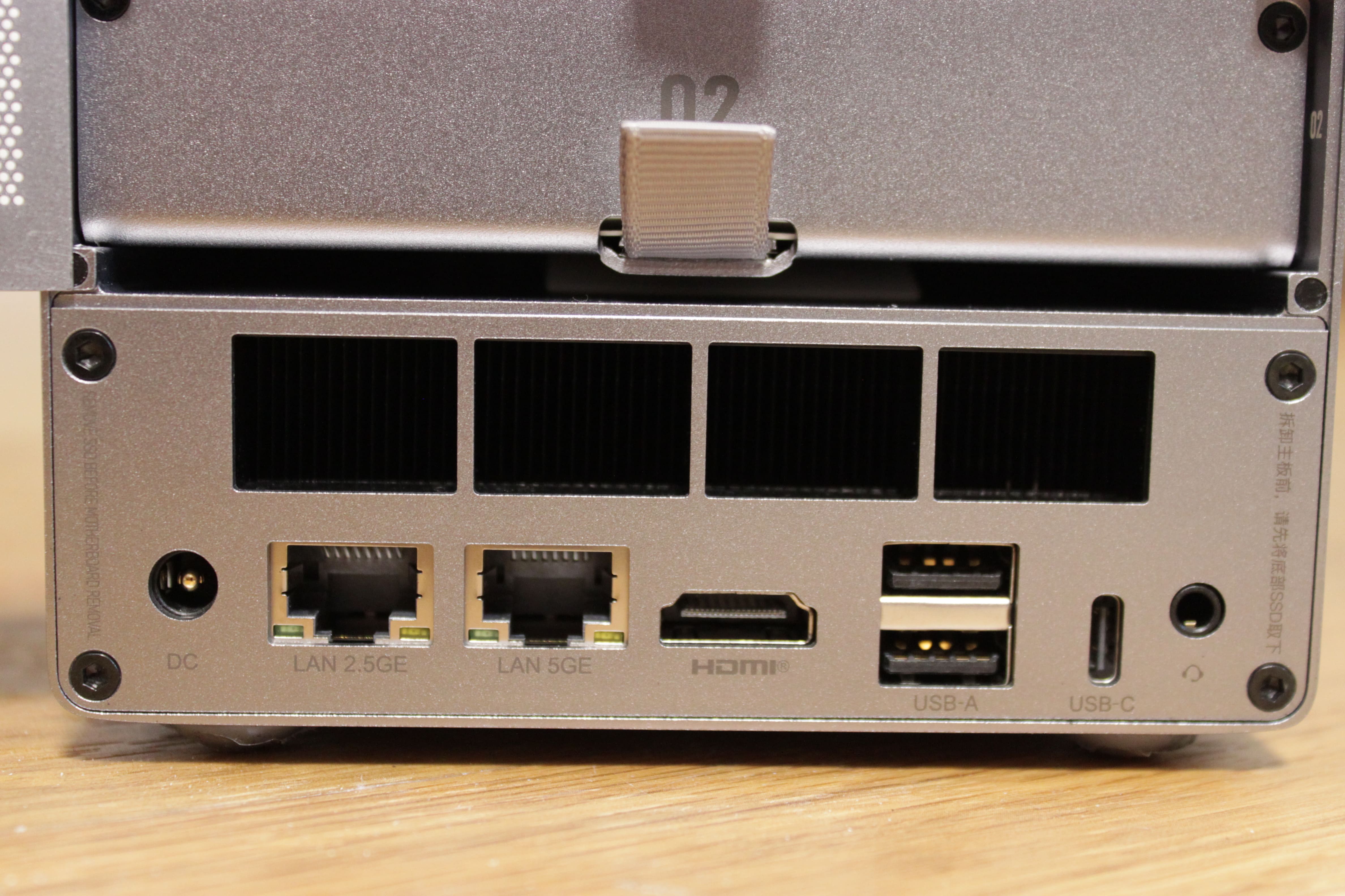 Auf der Rückseite befinden sich zwei USB-A-Anschlüsse, allerdings nur in der 2.0-Version. Daneben befindet sich ein USB-C-Anschluss mit 10Gbit/s, der zusätzlich mit einer Display-Ausgabe glänzt. Den gängigeren Displayanschluss finden wir direkt daneben in Form von HDMI, welcher 4K/60fps unterstützt. Den für mich unnötigen 3,5mm-Klinkenanschluss für ein Headset hatte ich bereits erwähnt. Er passt für einen Mini-PC in einer Windows-Umgebung, aber nicht wirklich zu einer NAS-Umgebung.