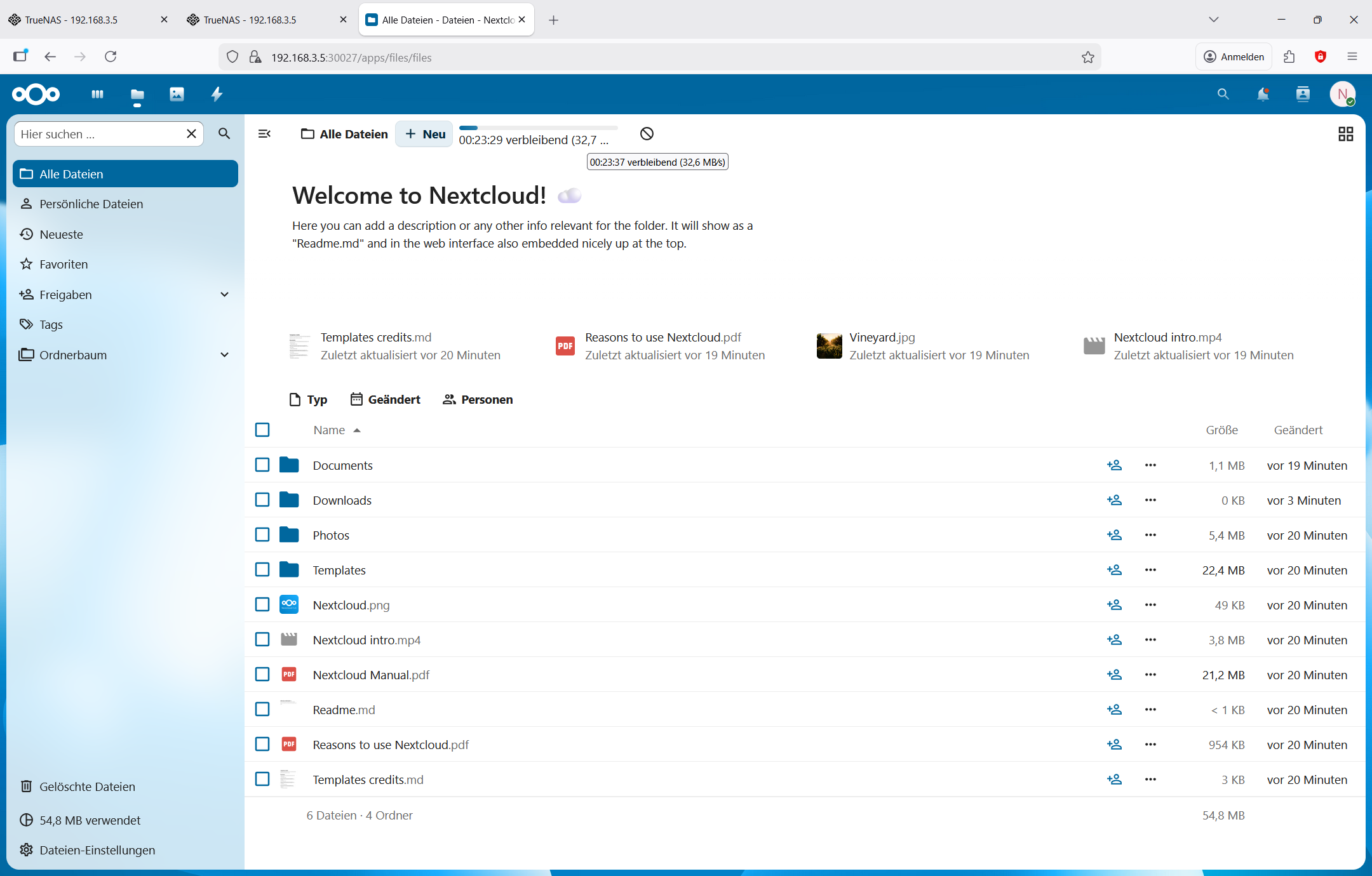 Der Beelink ME Pro wird mit einer vorinstallierten Marken-SSD von Western Digital und aktiviertem Windows 11 geliefert. Die Einrichtung verlief allerdings nicht so reibungslos wie gewohnt. Bei der Onlineeinrichtung hat sich die Installation ständig aufgehängt und konnte nur durch eine Offlineinstallation fortgesetzt werden. Danach lief alles problemlos. Alle Treiber waren installiert und Updates konnten schnell installiert werden. Da Windows für echte NAS-Lover allerdings unattraktiv ist, habe ich nach einigen Benchmarks das System neu aufgesetzt, TrueNAS installiert und die Performance von Nextcloud exemplarisch getestet. Hier lassen sich eine Vielzahl lokaler Applikationen hinzufügen, wie Sortierungen, KI-Funktionen und vieles mehr.
