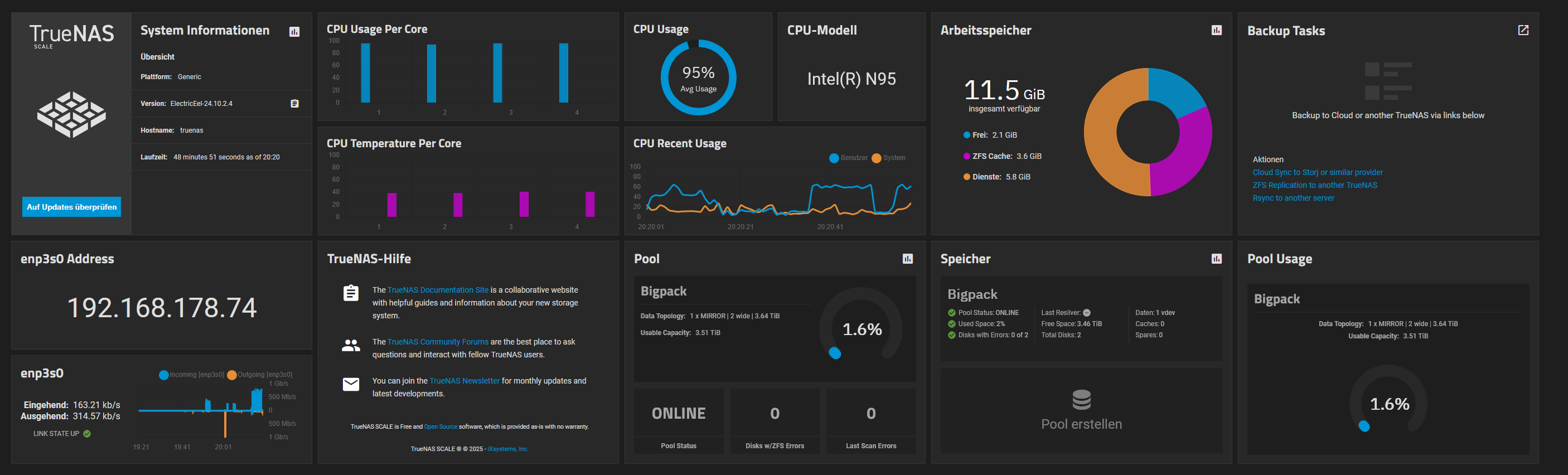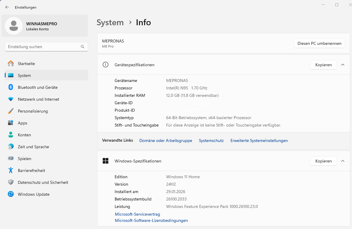 Grundsätzlich hat der Beelink ME Pro nicht viele Probleme verursacht. Die Ersteinrichtung von Windows 11 über ein Onlinekonto sorgte zwar für Schwierigkeiten, konnte aber, wie erwähnt, umgangen werden. Schade ist, dass unter TrueNAS die Treiber für den 5Gbit/s-Ethernet-Anschluss und auch der WLAN-Treiber nicht gefunden wurden. So musste man sich mit dem 2,5Gbit/s-Anschluss begnügen. Ob andere Betriebssysteme dasselbe Problem haben, habe ich noch nicht getestet.