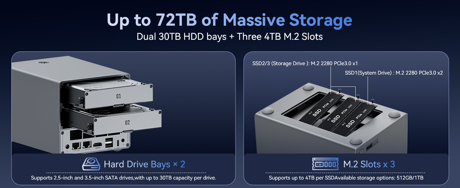 Der Beelink ME Pro ist ein Hybrid für alle, die ein leistungsfähiges NAS suchen, ohne auf die Flexibilität eines Mini-PCs zu verzichten. Das Design ermöglicht trotz kompakter Abmessungen die Nutzung von zwei 3,5 Zoll HDDs und drei NVMe-SSDs, wodurch bis zu 72TB Speicherkapazität realisierbar sind. Dank der Verarbeitung und des Airflows bleiben die Komponenten auch bei Volllast kühl. Daten übertragt ihr über vier USB-Ports, darunter schnelle 3.2-Schnittstellen an der Front.