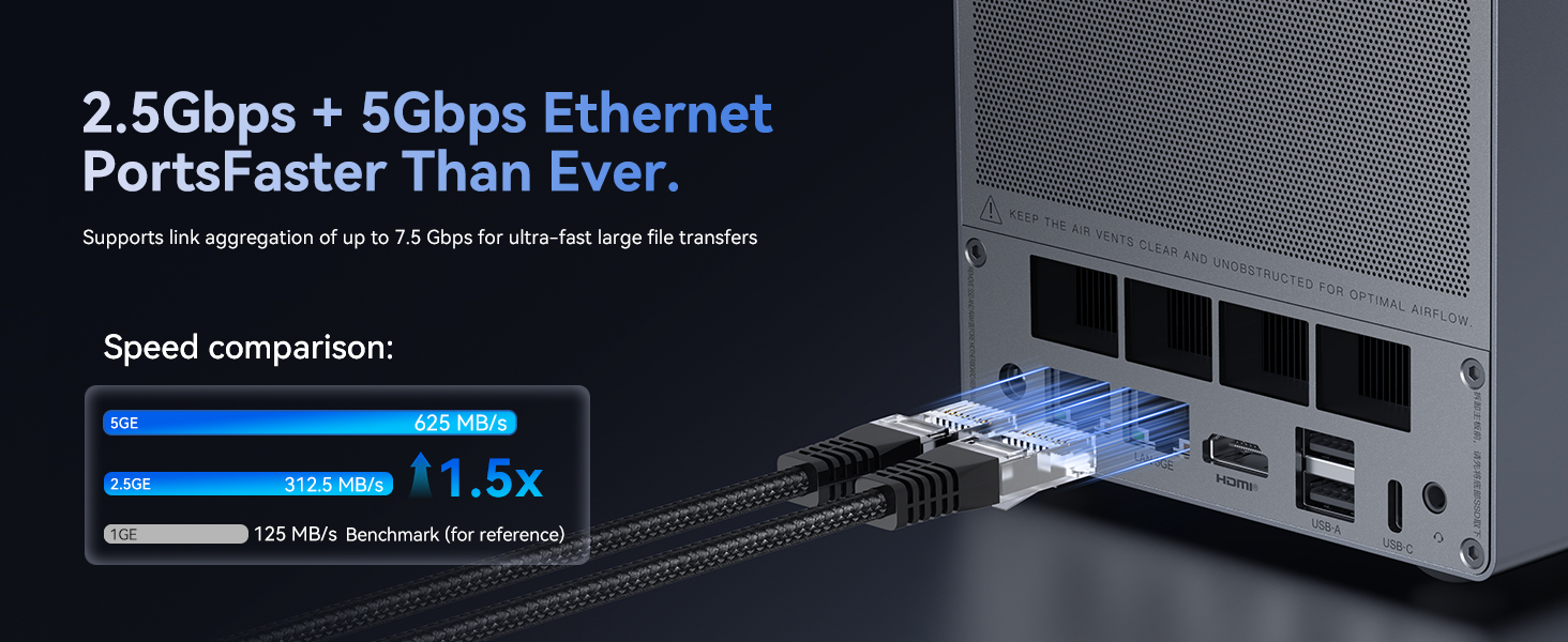 Eine Besonderheit ist die Netzwerkanbindung: Ein 2,5Gbit/s- und ein 5Gbit/s-Port lassen sich via Link Aggregation auf 7,5Gbit/s bündeln. Das modulare Mainboard beherbergt wahlweise einen Intel N95 oder N150 und bis zu 16GB RAM. Ausgeliefert wird das System mit Windows 11, was euch maximale Software-Freiheit bietet.