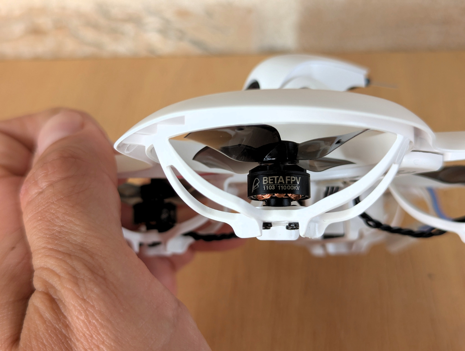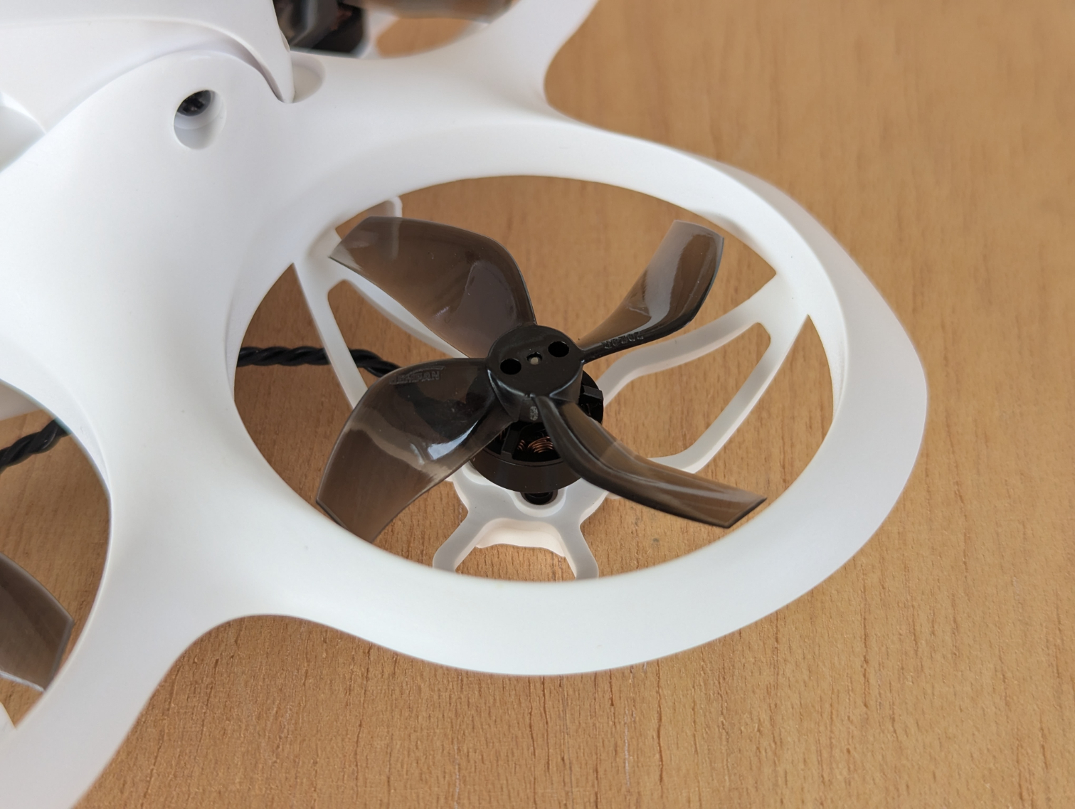 Für den Auftrieb bzw. generell den Flug der Cetus X sorgen die BetaFPV 1103 Brushless-Motoren mit einer Leistung von 11.000KV. Die 1103 steht für die Abmessungen des Stators im Motor, wobei die ersten beiden Ziffern den Stator-Durchmesser (in mm) und die letzten beiden Ziffern die Stator-Höhe (in mm) angeben. Auf den Motoren sind Gemfan 2020 4-Blatt-Propeller verbaut.