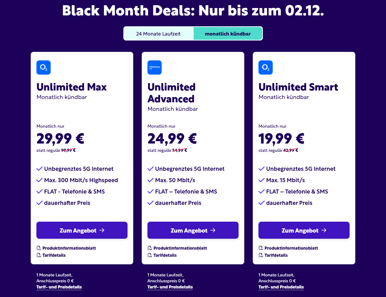 | O2 | Allnet Unlimited Advanced | 50Mbit/s | 24,99€ | 0€ |