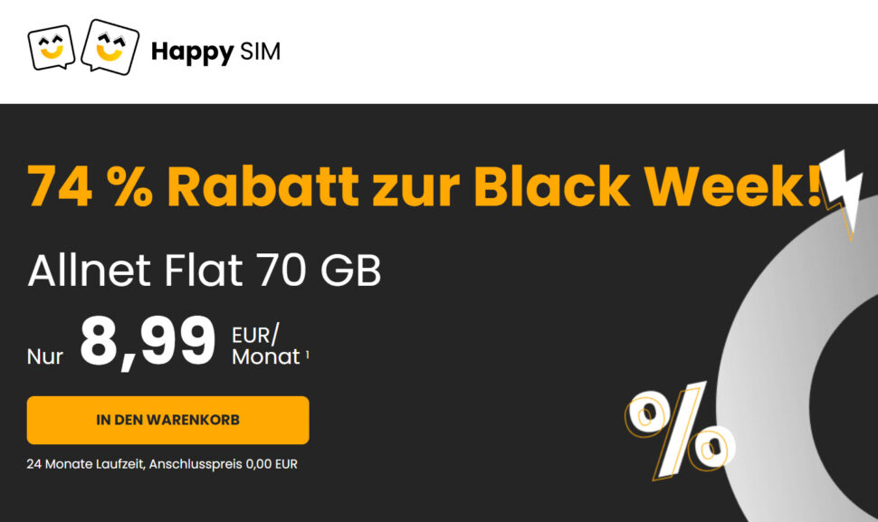 Zu den Tarifen mit 24 Monate Laufzeit Black Week Deals bei Happy SIM (monatlich kündbar)