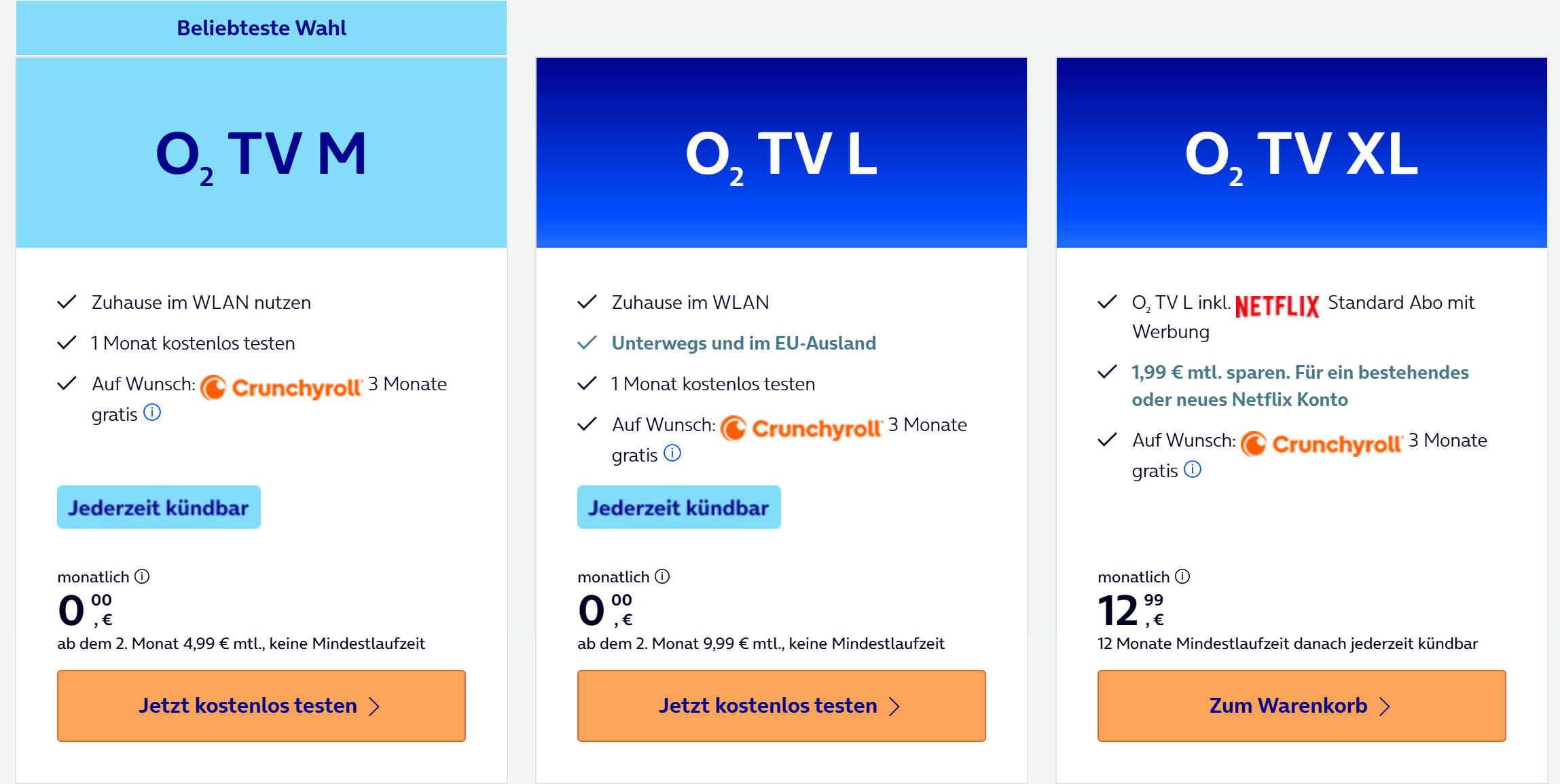 O2 TV M und O2 TV L sind monatlich kündbar, während O2 TV XL mindestens zwölf Monate Laufzeit voraussetzt. Da ist dann aber auch das Netflix-Standard-Abo mit Werbung dabei.
