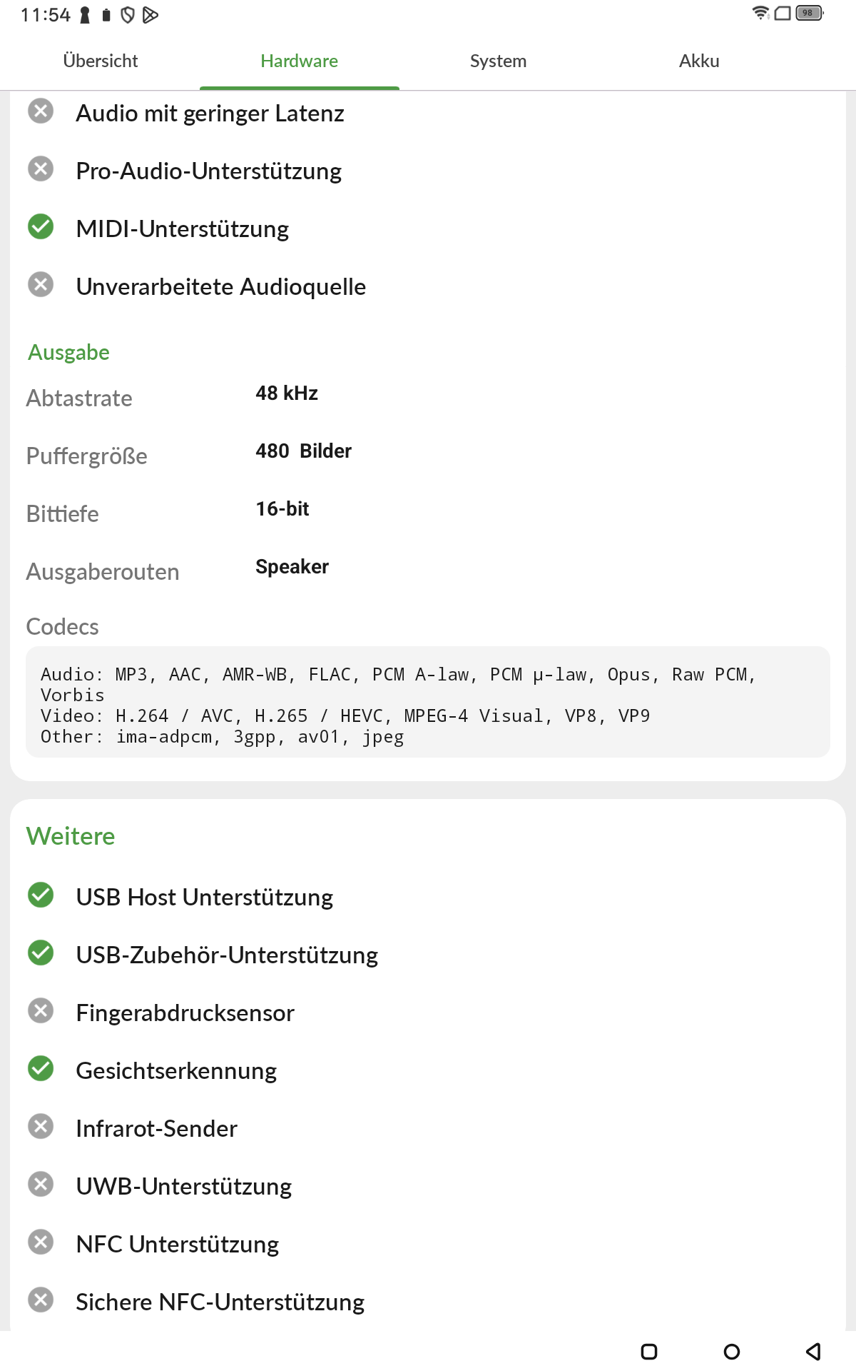 Allerdings verlor das Tablet sporadisch die Verbindung zum Router, stellte sie aber nach kurzer Zeit sofort wieder her. Dafür funktioniert die Gesichtsentsperrung tadellos und gelingt in 9 von 10 Fällen. Ein Fingerabdrucksensor ist nicht vorhanden. Ein 3,5mm-Kopfhöreranschluss steht zur Verfügung. Die beiden Lautsprecher des Tablets produzieren einen guten Klang, allerdings fehlt es ihnen teilweise etwas an Tiefe. Dafür werden sie angenehm laut, ohne an ihre Grenzen zu geraten. Einen Vibrationsmotor besitzt das Tablet auch, dieser wirkt aber sehr billig und ist kaum zu bemerken.