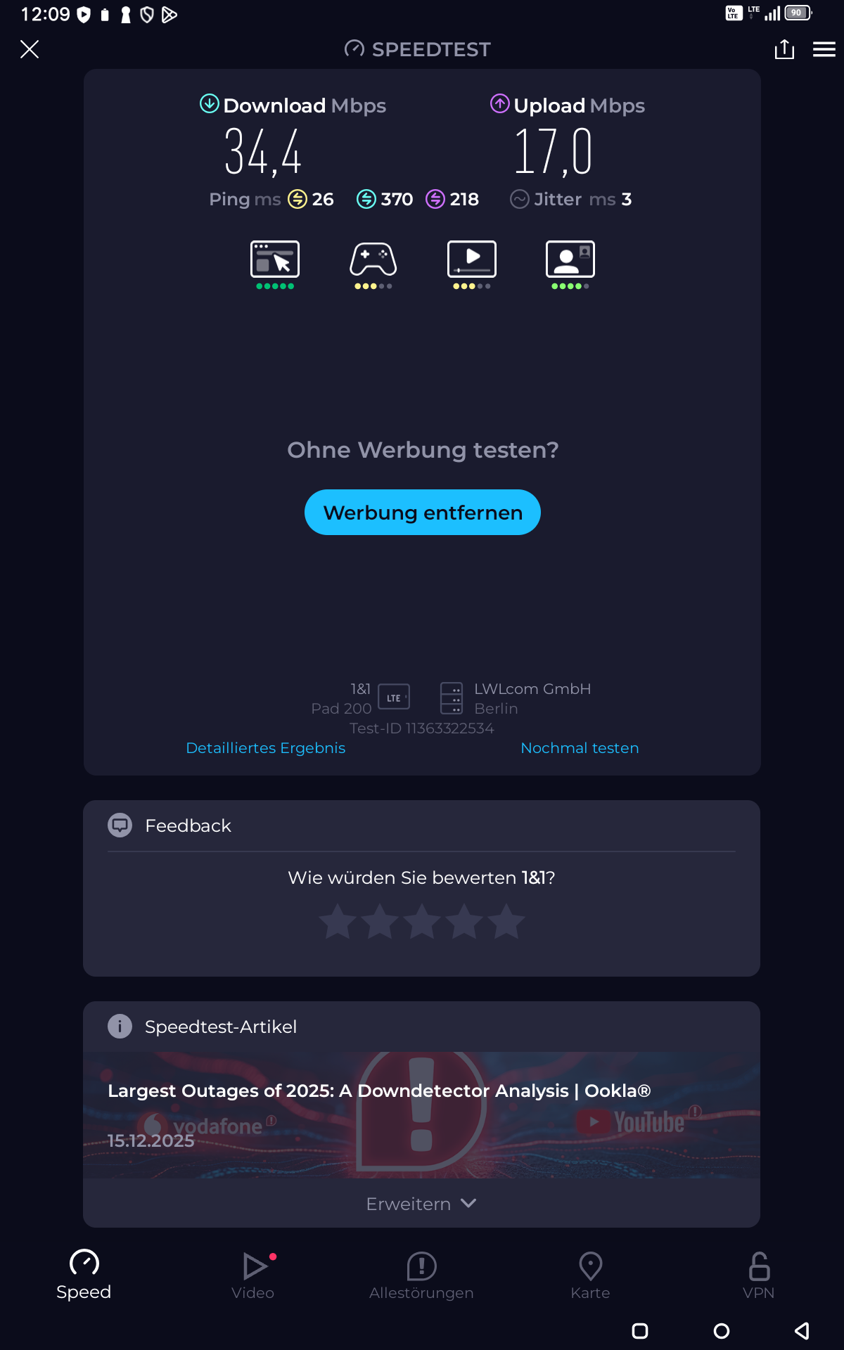 Der Stand-by-Verbrauch ist auch nicht optimal und zog innerhalb von 24 Stunden 9% des Akkus – und das alles ohne SIM-Karte und nur im WLAN. Das Tablet wird mit dem beiliegenden Netzteil in etwa dreieinhalb Stunden aufgeladen, wobei gerade die letzten zehn Prozent wirklich unheimlich lange dauern, was angesichts der Akkulaufzeit nicht gut ist. Die Laufzeit ist nicht schlecht, aber auch nicht gut. Einen langen Tag werdet ihr damit schaffen, einen zweiten nicht. Einmal am Tag das Tablet aufzuladen, ist quasi Pflicht.