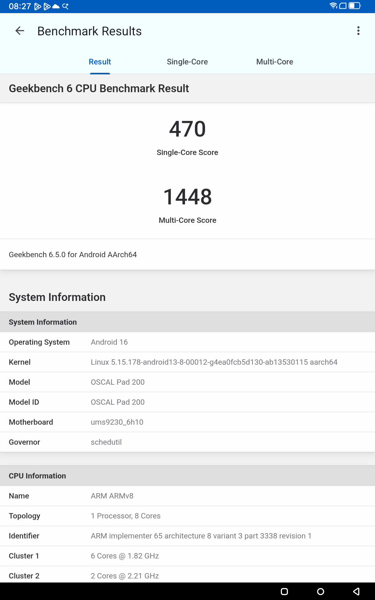 Im Oscal Pad 200 ist der Unisoc T7280 (T620) verbaut, ein Prozessor der unteren Mittelklasse. Er verfügt über zwei große ARM Cortex-A75-Kerne mit einer Taktrate von bis zu 2,2GHz sowie sechs kleinen Cortex-A55-Stromsparkernen mit einer Taktrate von bis zu 1,8GHz. Die GPU ist eine ARM Mali G57 MP1.