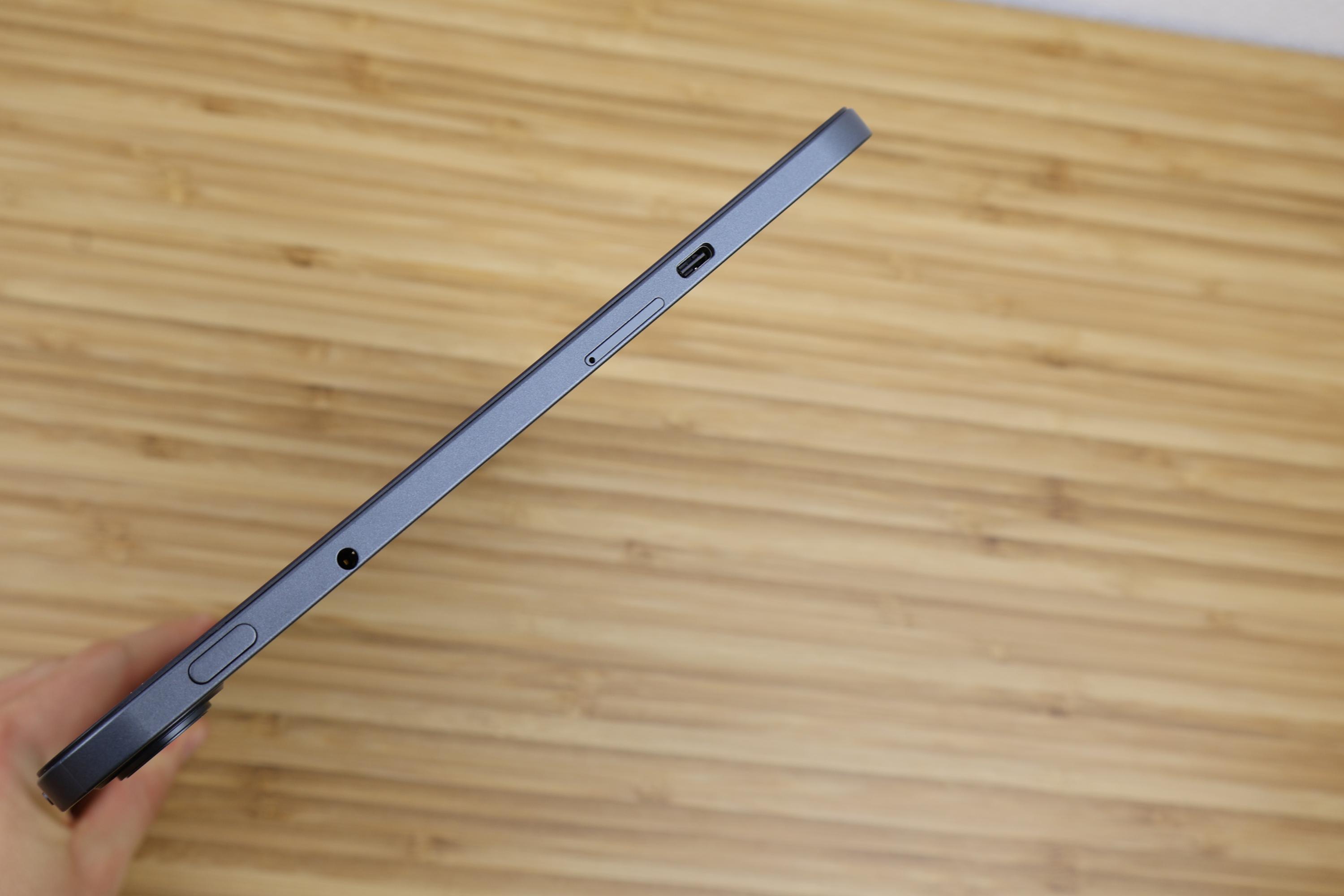 Das Blackview Oscal Pad 200 besteht aus einem Aluminium-Kunststoff-Gehäuse, wobei sich der Kunststoff auf den Rahmen und die Tasten beschränkt. Erwähnenswert ist, dass andere Tablets, auch günstigere, auf einen Aluminiumrahmen setzen. Die Abmessungen betragen 309,41 x 201,49 x 7,9 Millimeter bei einem Gewicht von 708 Gramm. Betrachtet ihr das Tablet von vorn, befinden sich auf der linken Seite die Power-Taste sowie der 3,5mm-Kopfhöreranschluss. Daneben liegt der Einschub für zwei SIM-Karten oder eine SIM-Karte und eine Speicherkarte.