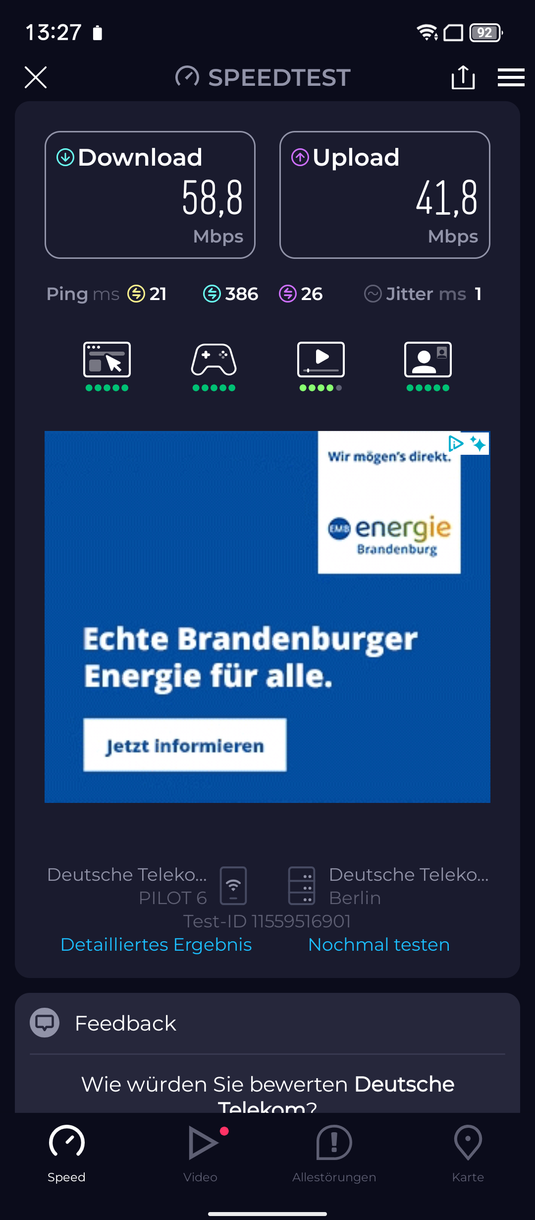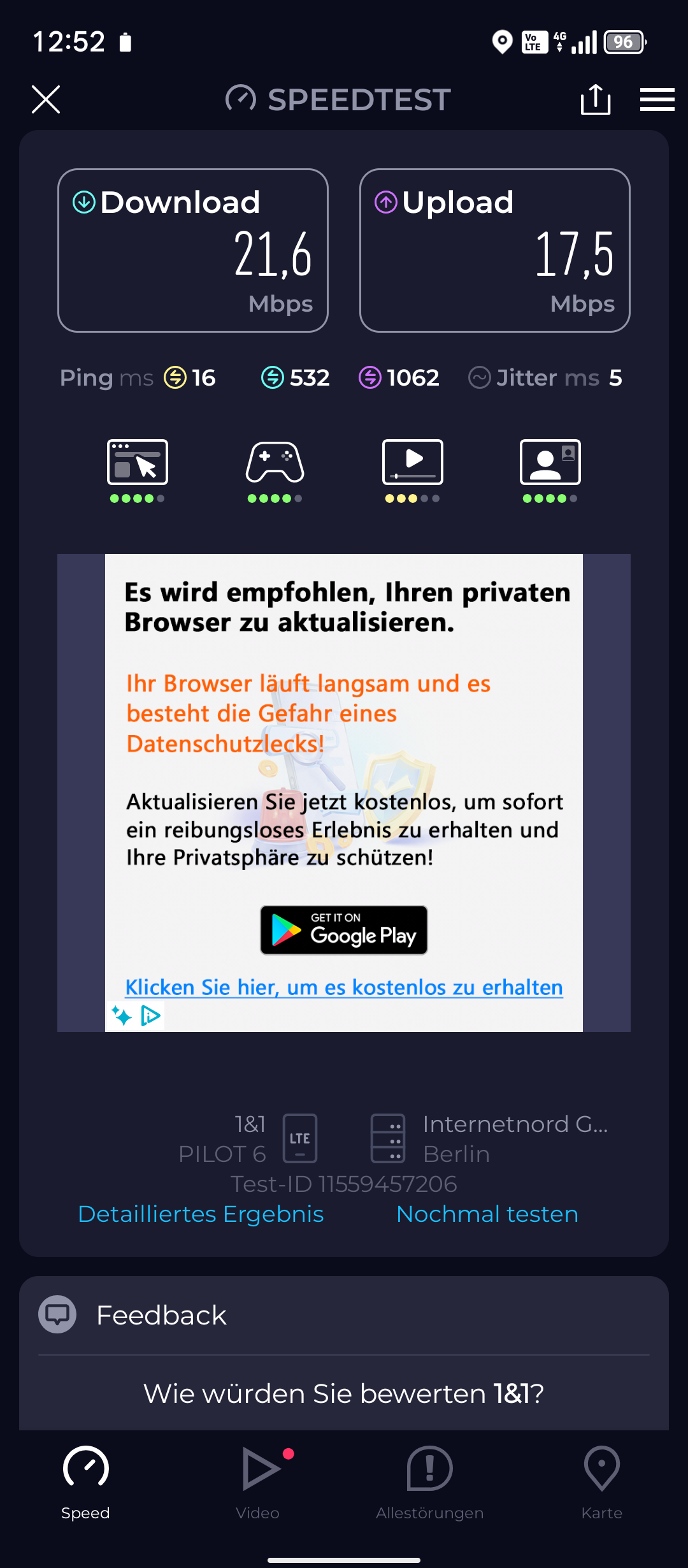 Die Position wurde zügig und präzise bestimmt. NFC ist ebenfalls verfügbar. Der in der Power-Taste integrierte Fingerabdruckscanner sowie die Gesichtsentsperrung reagieren schnell und zuverlässig. Der verbaute Lautsprecher ist ein Highlight und liefert eine für ein Smartphone beeindruckende Klangqualität, die an eine Bluetooth-Box erinnert. Er wird sehr laut, ohne dabei matschig zu klingen. Der Vibrationsmotor ist hingegen nur durchschnittlich.