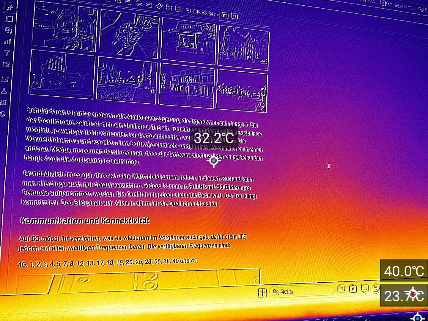 Schuld daran ist unter anderem die Auslöseverzögerung, die teils sehr lang ausfällt. Bei der Frontkamera zeichnet sich ein ähnliches Bild ab. Tagsüber sind damit solide Ergebnisse möglich; je dunkler die Umgebung, desto schwächer werden die Bilder. Die Wärmebildkamera bietet eine Auflösung von 160 x 120 Pixeln, eine Bildrate von 25 Hz sowie einen Messbereich von -15 °C bis 550 °C. In der Praxis zeigt sich die Software jedoch etwas unoptimiert. Wechselt ihr in einen anderen Modus, müsst ihr damit rechnen, dass die Software abstürzt oder einige Sekunden hängt. Auch die Auslösung reagiert sehr träge.