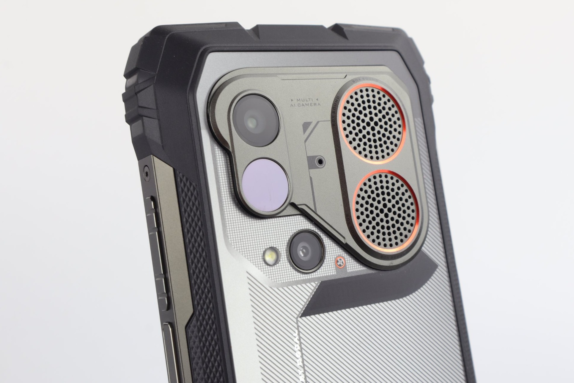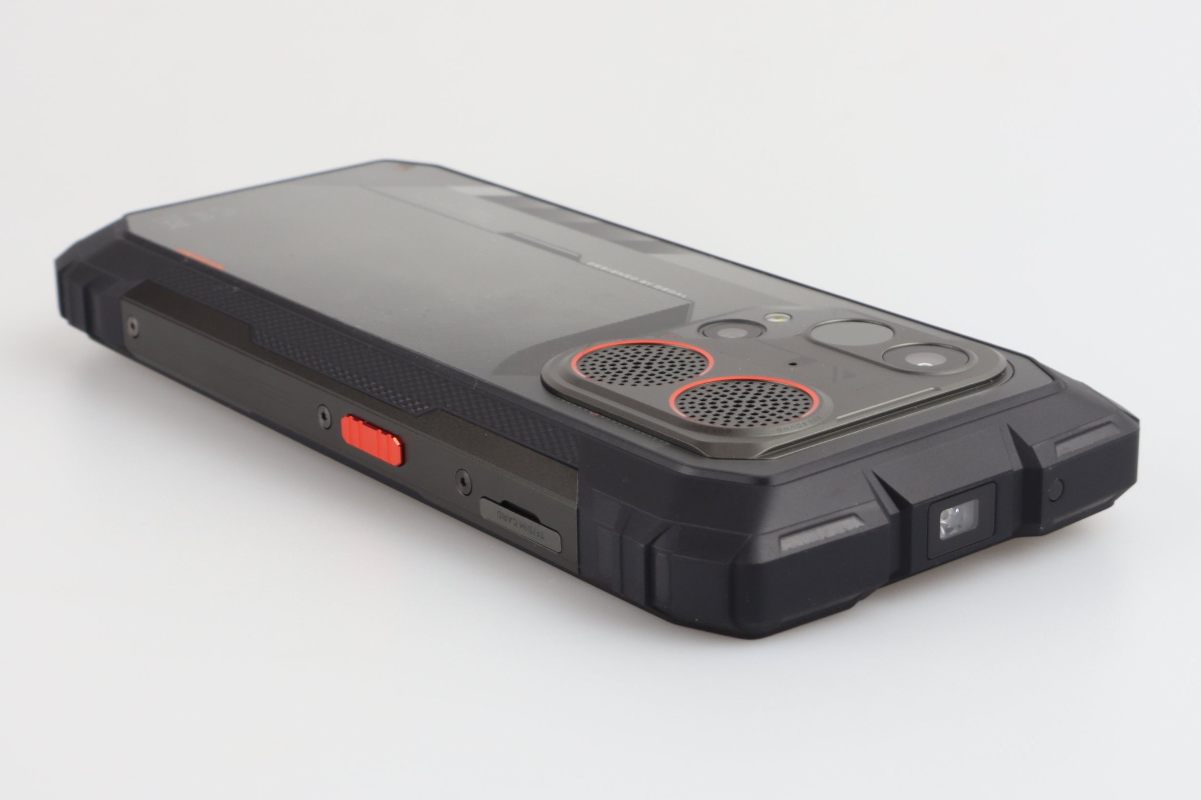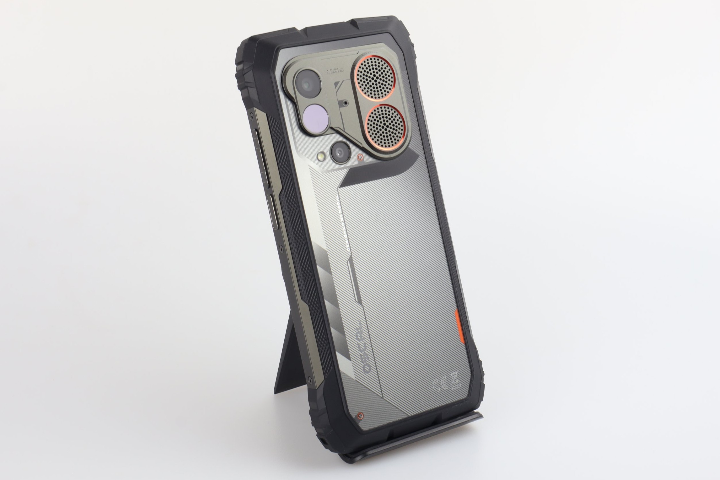Neben einer frei belegbaren Taste und einem USB-2.0-Anschluss befindet sich auf der Rückseite ein 4,5-Watt-Lautsprecher (Smart-PA BOX), der laut Hersteller bis zu 98 Dezibel laut werden kann. Auf der Oberseite befindet sich außerdem eine 93 Lumen starke LED-Taschenlampe. Eine Zertifizierung nach IP68/IP69K und MIL-STD-810H liegt vor; das Gerät ist laut Hersteller für einen Temperaturbereich von -20 °C bis +60 °C ausgelegt und bietet eine Sturzfestigkeit von bis zu 1,5 Metern. Das Glas wird durch Corning Gorilla Glas 5 geschützt. Neben dem Lautsprecher und der Kamera befindet sich noch eine Benachrichtigungs-LED. Diese zeigt zwar zuverlässig die Benachrichtigungen sowie den Ladestand des Akkus an, allerdings so kurz, dass ihr sie leicht verpassen könnt.
