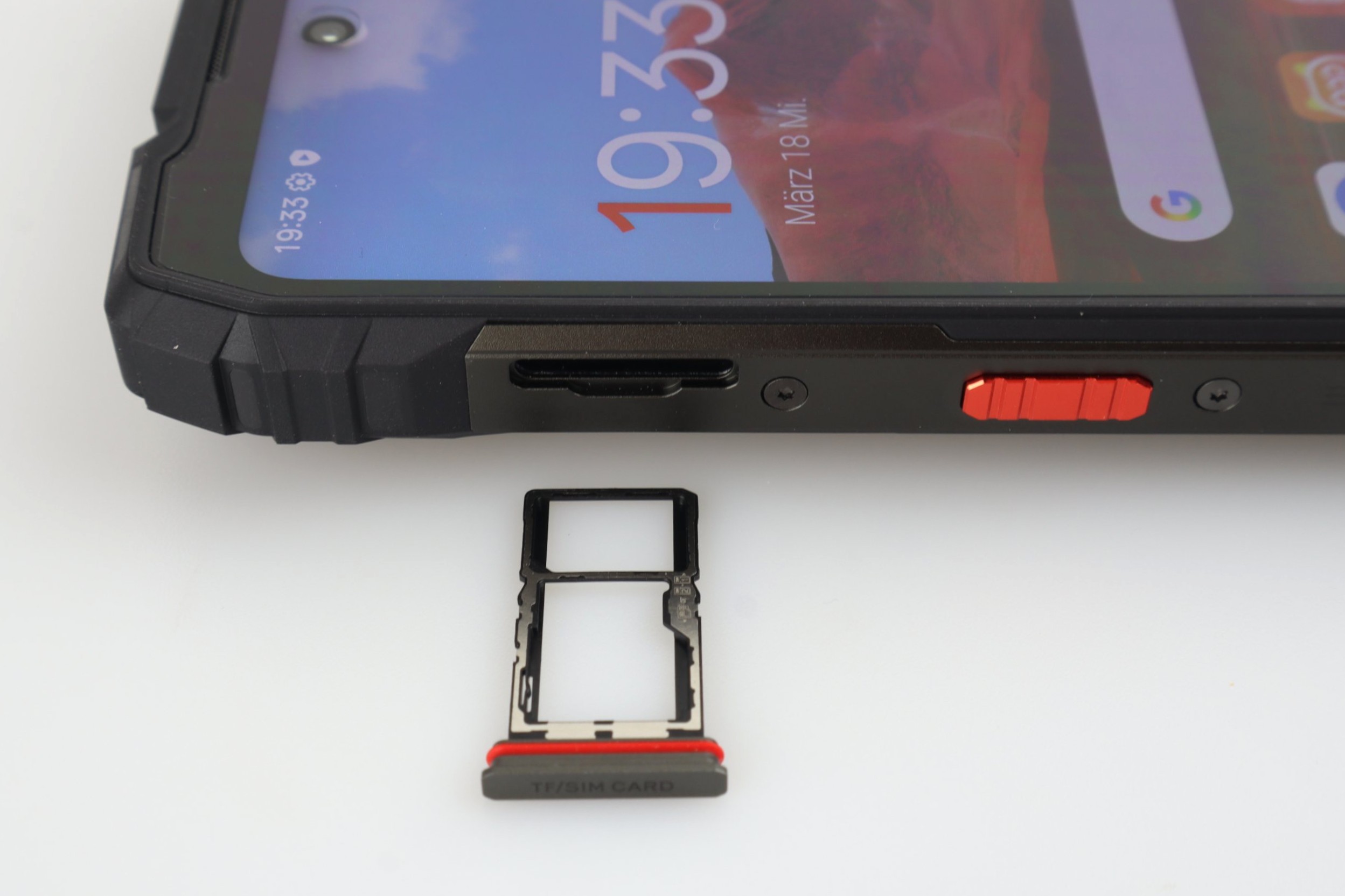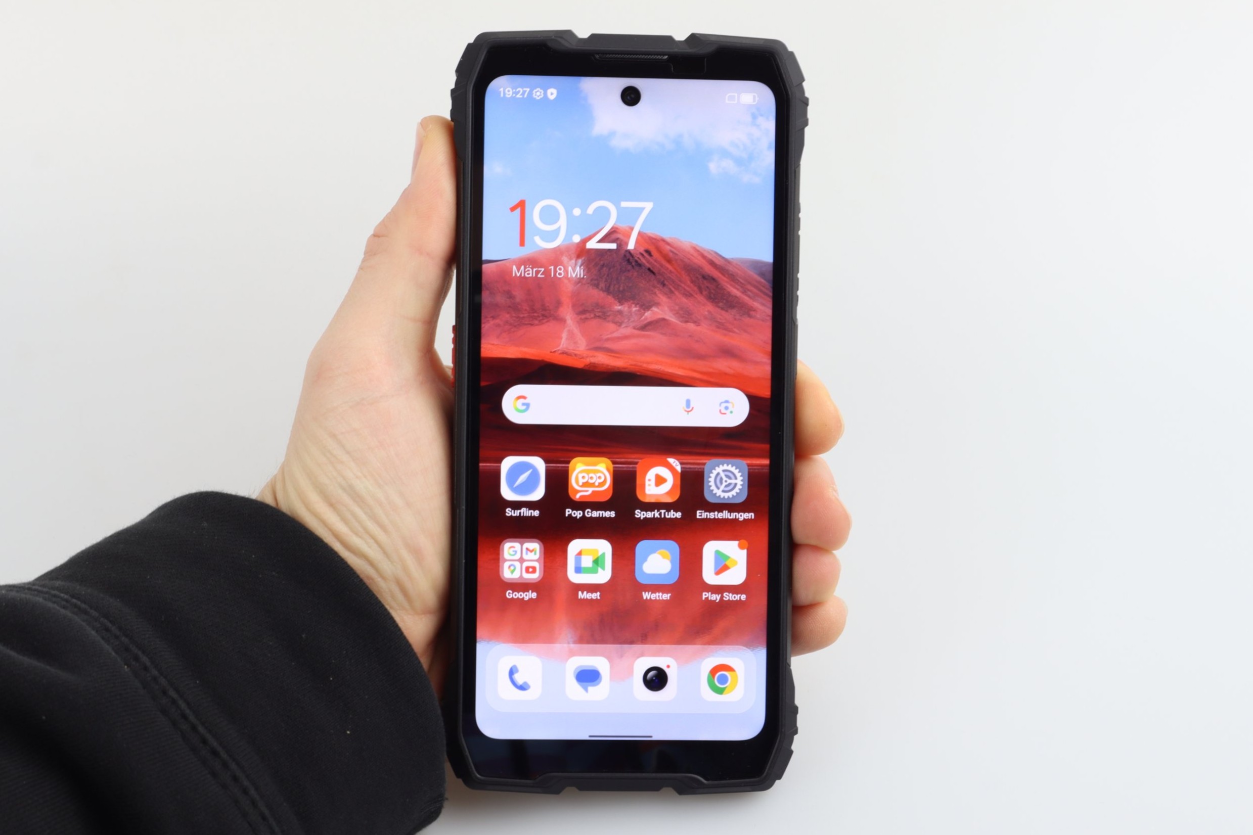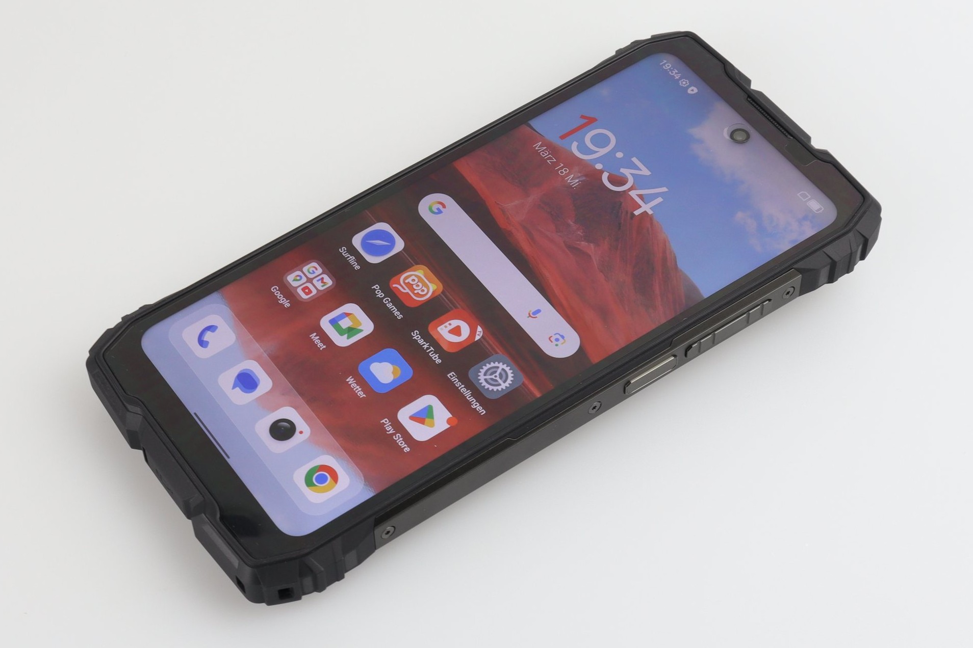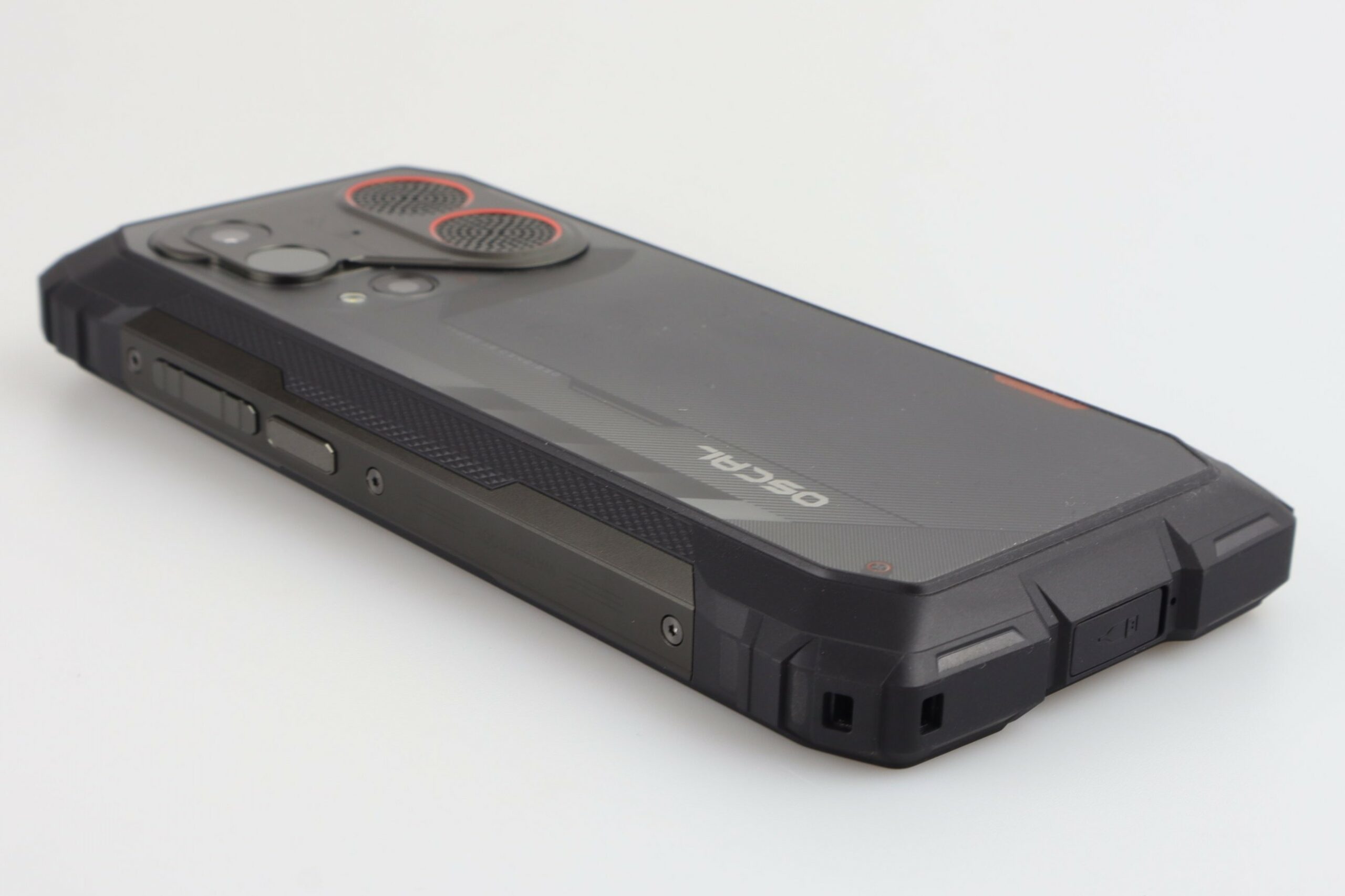Neben einer frei belegbaren Taste und einem USB-2.0-Anschluss befindet sich auf der Rückseite ein 4,5-Watt-Lautsprecher (Smart-PA BOX), der laut Hersteller bis zu 98 Dezibel laut werden kann. Auf der Oberseite befindet sich außerdem eine 93 Lumen starke LED-Taschenlampe. Eine Zertifizierung nach IP68/IP69K und MIL-STD-810H liegt vor; das Gerät ist laut Hersteller für einen Temperaturbereich von -20 °C bis +60 °C ausgelegt und bietet eine Sturzfestigkeit von bis zu 1,5 Metern. Das Glas wird durch Corning Gorilla Glas 5 geschützt. Neben dem Lautsprecher und der Kamera befindet sich noch eine Benachrichtigungs-LED. Diese zeigt zwar zuverlässig die Benachrichtigungen sowie den Ladestand des Akkus an, allerdings so kurz, dass ihr sie leicht verpassen könnt.