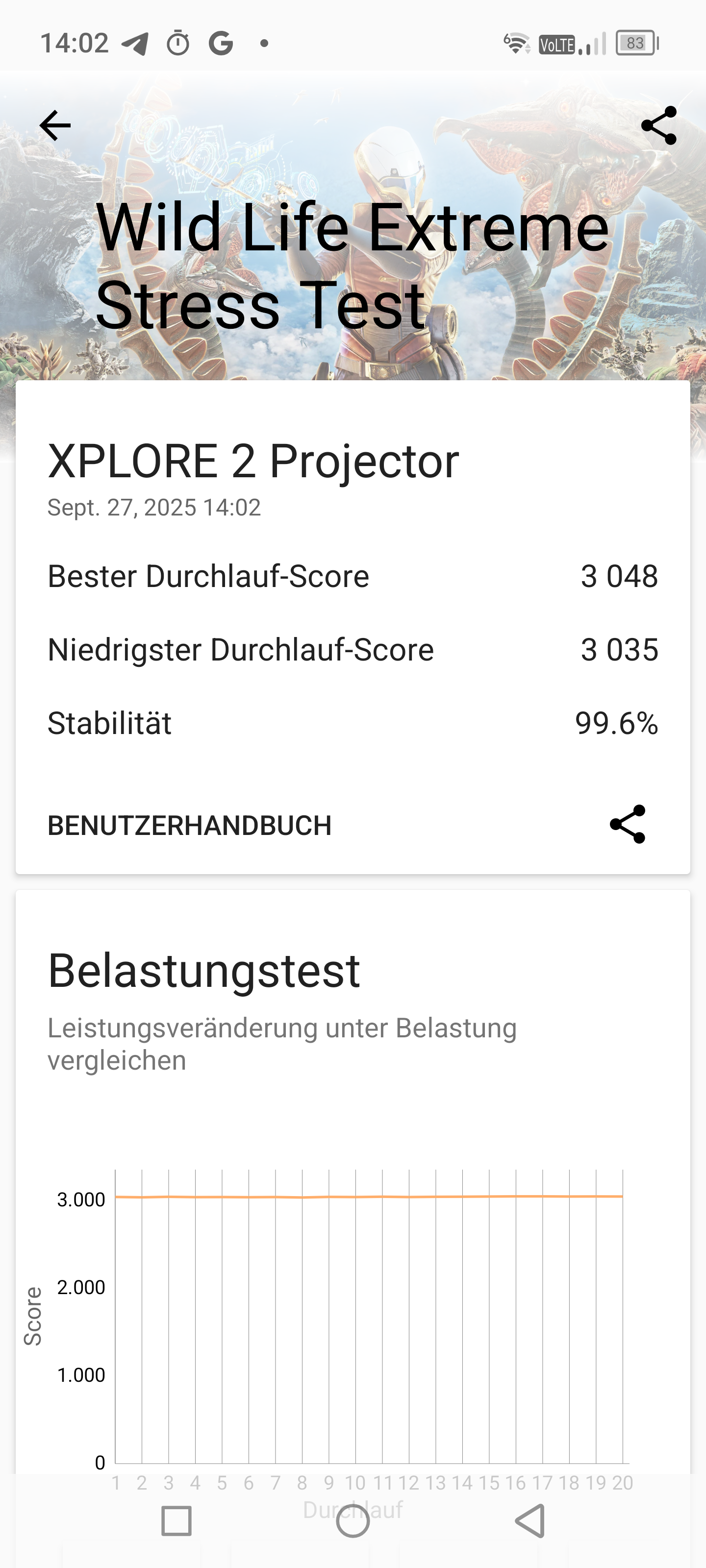 Thermal Throtteling, also die Reduzierung der Leistung unter dauerhafter Last, ist für das Xplore 2 Projector kein Thema. Die Leistung kann auch über längere Zeiträume ohne nennenswerte Einbußen aufrechterhalten werden.