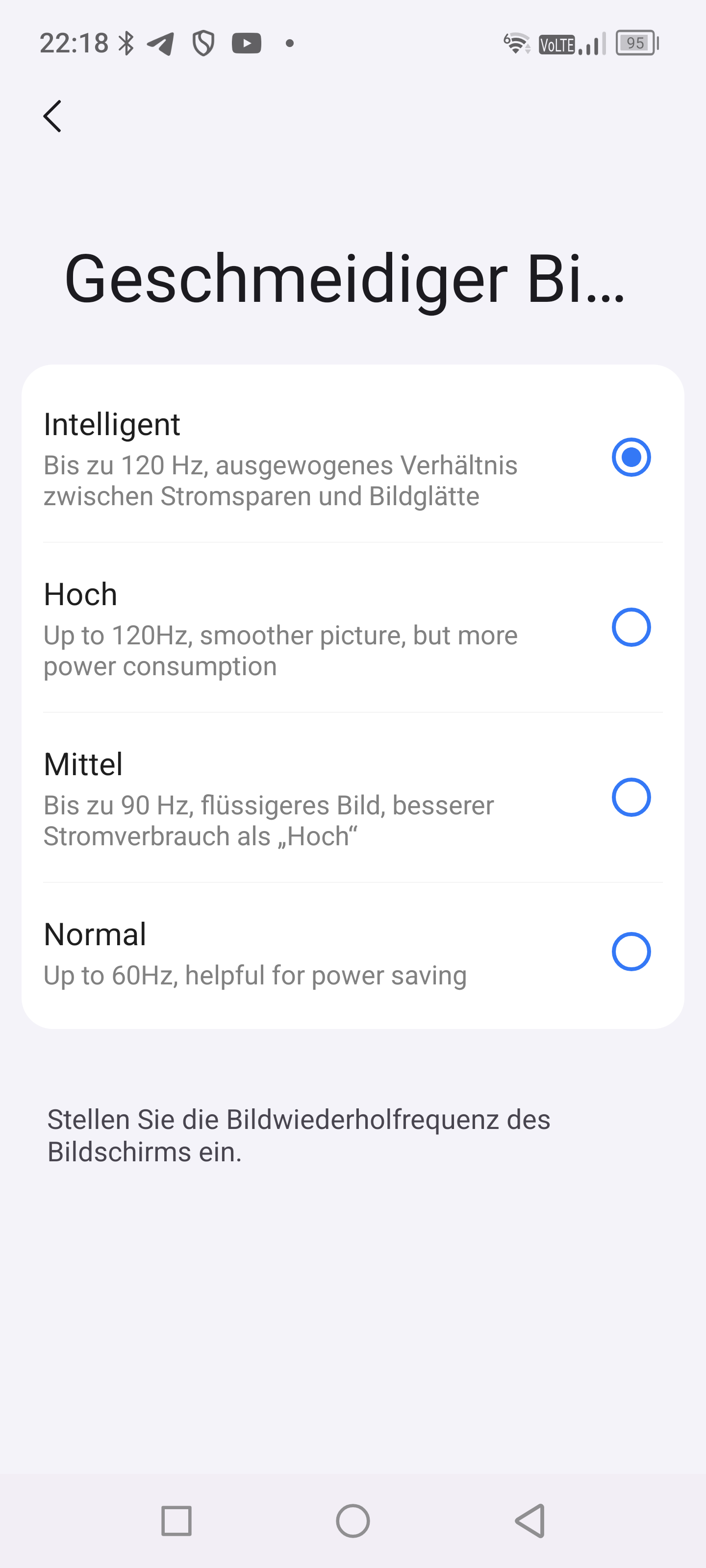 Die LTPO-Technik verspricht eine adaptive Bildwiederholrate von 1Hz bis 120Hz, die für eine flüssige Darstellung bei gleichzeitiger Akkuersparnis sorgen soll. In der Praxis funktionierte die intelligente Reduzierung jedoch nicht wie erwartet. Selbst im intelligenten Modus fiel die Frequenz nie unter 60Hz, wodurch die Vorteile der LTPO-Technik verloren gehen. Positiv ist hingegen, dass sich die Bildwiederholrate manuell auch auf 90Hz oder 60Hz festlegen lässt.