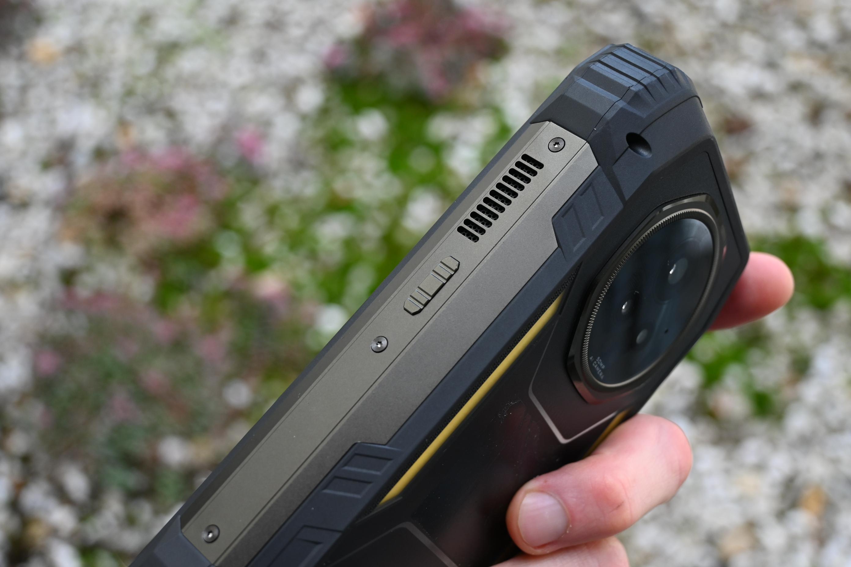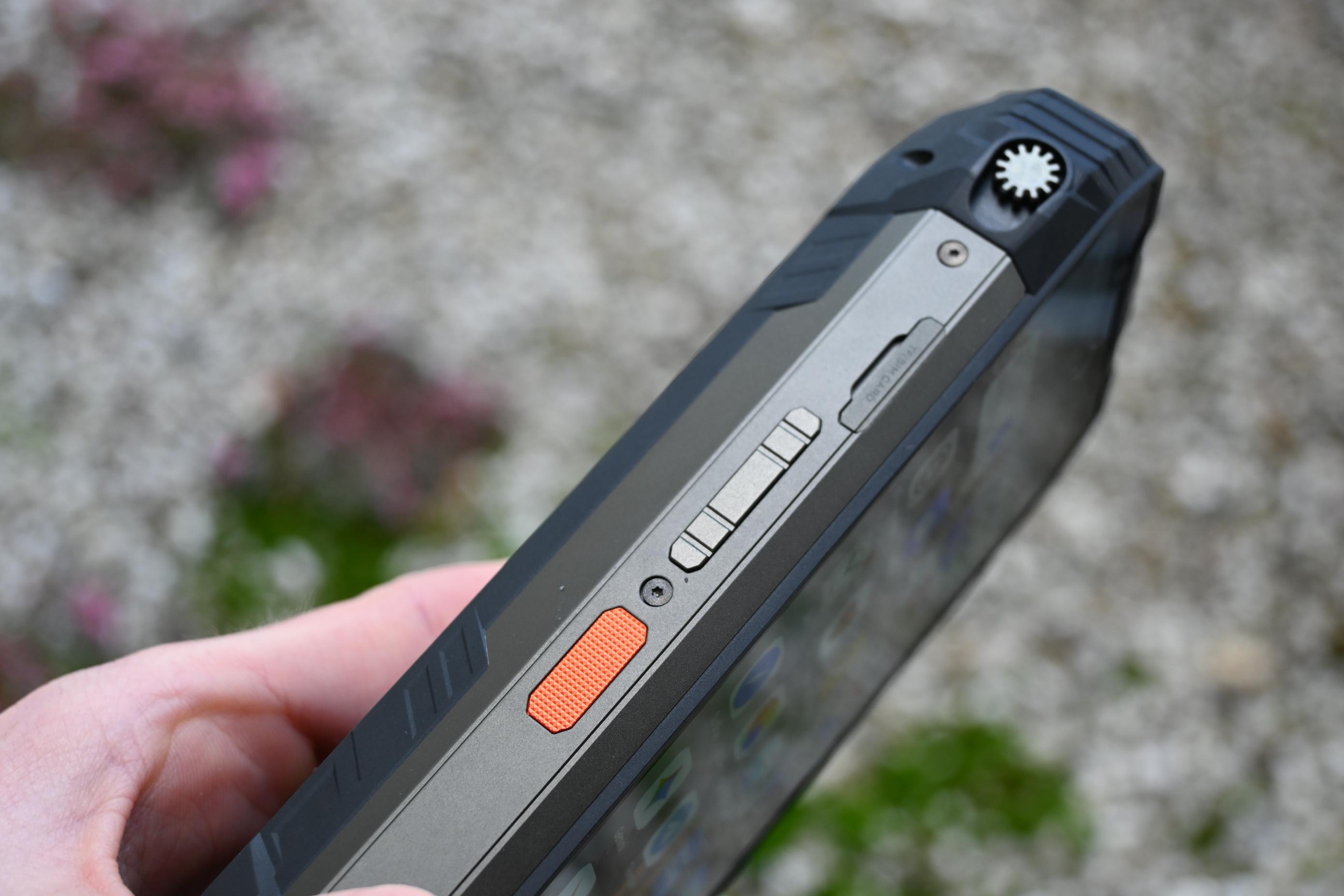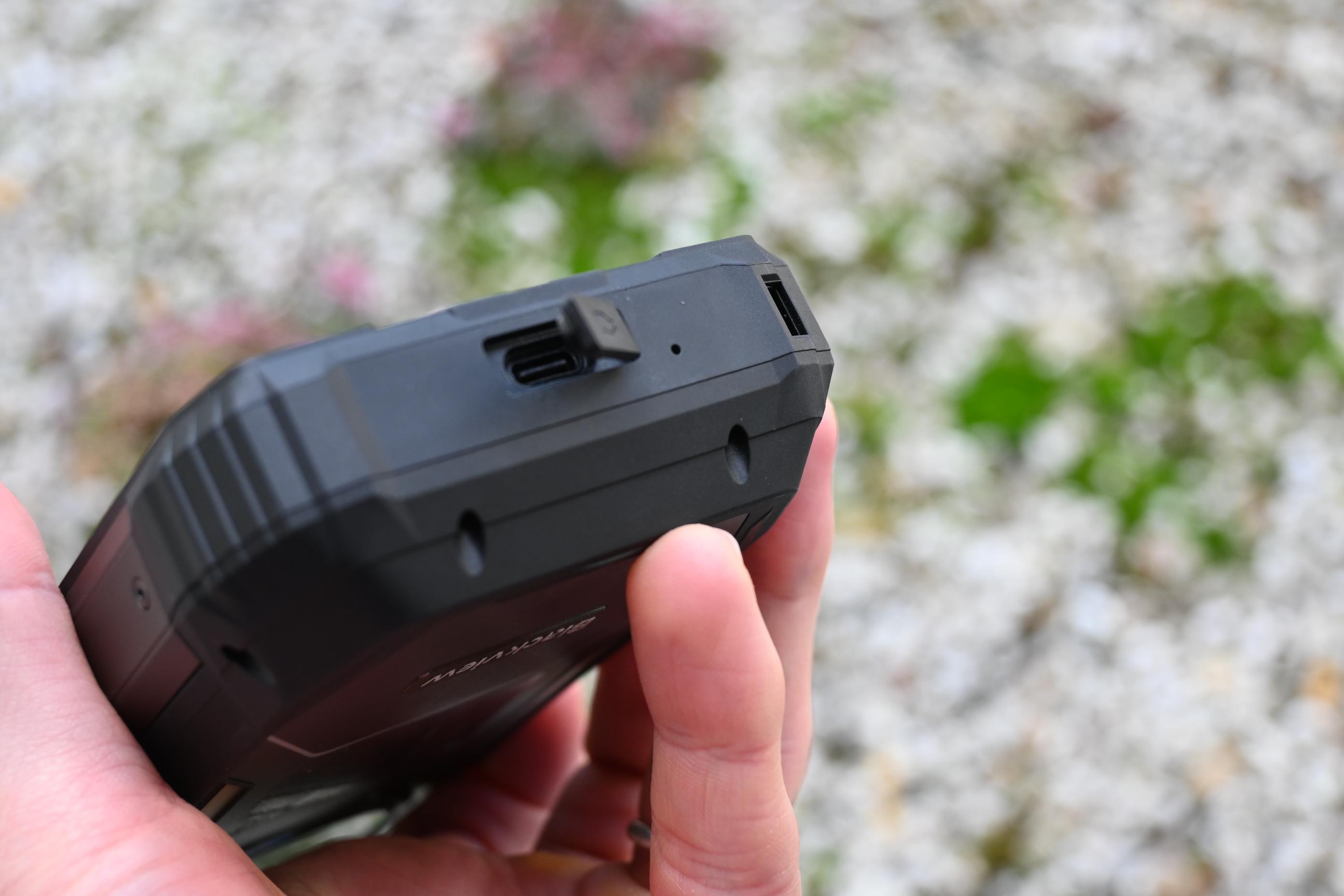 Die Rückseite aus Kunststoff unterstreicht den Outdoor-Charakter, wobei das von Metall umrandete Kameramodul die Linsen schützt. Geschickt sind auch die hellen LED-Lampen in die Rückseite integriert, die sich nahtlos in den robusten Look einfügen. An der Oberseite findet die Linse für den integrierten Beamer Platz, direkt neben einem kleinen Lüfter. Typisch für Outdoor-Smartphones fallen die Displayränder recht breit aus, dennoch hat sich Blackview für eine kleine Punch-Hole-Notch für die Frontkamera entschieden. Der USB-C 2.0 Anschluss ist durch eine Gummikappe vor Wasser und Staub geschützt. Natürlich gibt es auch eine IP68- & IP69K-Zertifizierung. Zusätzlich ist das Gerät nach dem Militärstandard MIL-STD-810H gegen extreme Bedingungen gewappnet. Praktische Extras wie ein frei belegbarer Sonder-Button an der linken Seite und eine Infrarot-Fernbedienung runden das Paket ab. Der Fingerabdruck-Scanner ist ins Display integriert. Er leistet im Test zufriedenstellende Arbeit, ist aber etwas langsamer als bei aktuellen Smartphones. Es wäre uns lieber gewesen, wenn Blackview ihn klassisch in den Powerbutton integriert hätte.