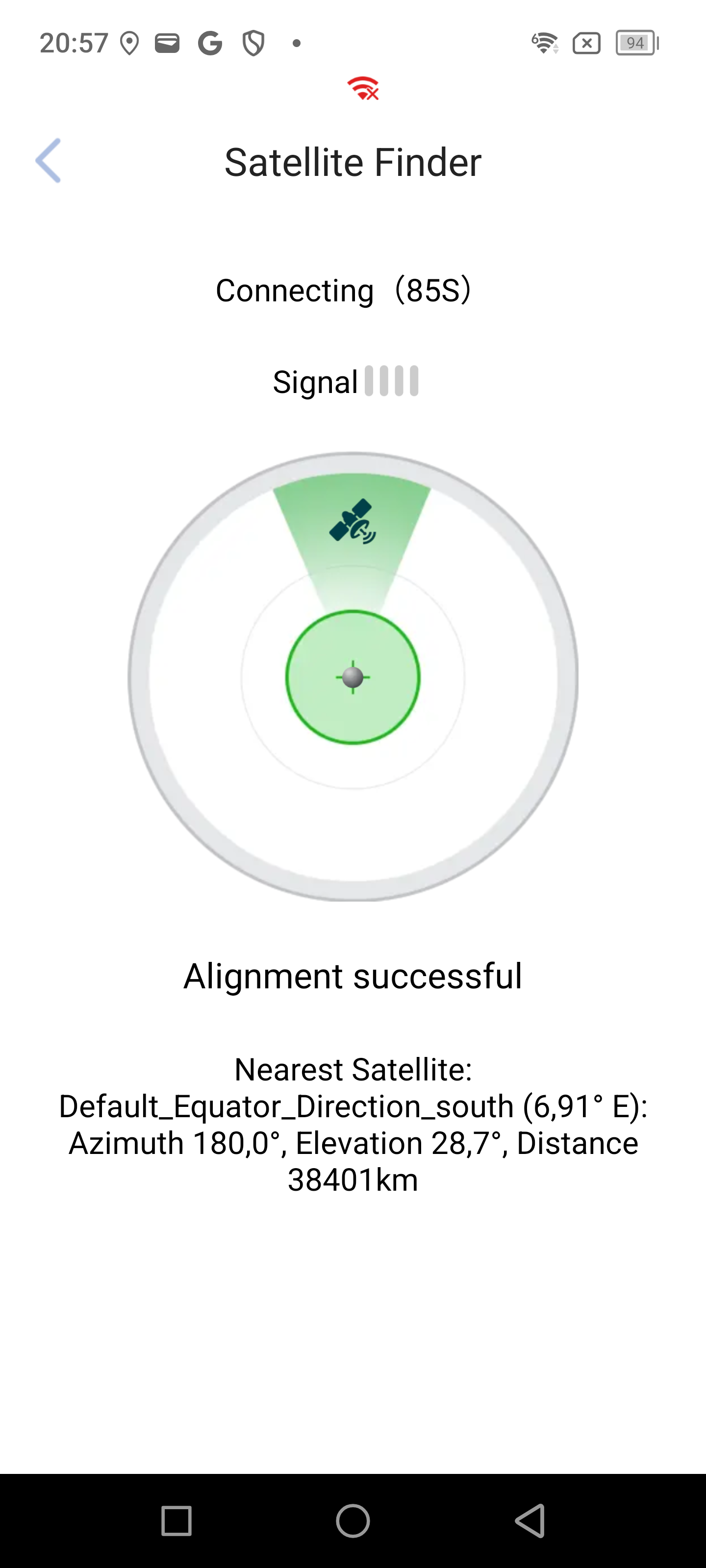 Im Praxistest zeigte sich die Technik sehr wählerisch. Über den „Satellite Finder“ muss das Smartphone exakt ausgerichtet werden – in unserem Test in Köln bedeutete das eine Ausrichtung genau nach Süden (180°) bei einem Neigungswinkel von knapp 29°. Obwohl die App „Alignment successful“ meldete, kam keine Verbindung zustande. Das Signal der geostationären Satelliten wird durch Gebäude sofort blockiert.