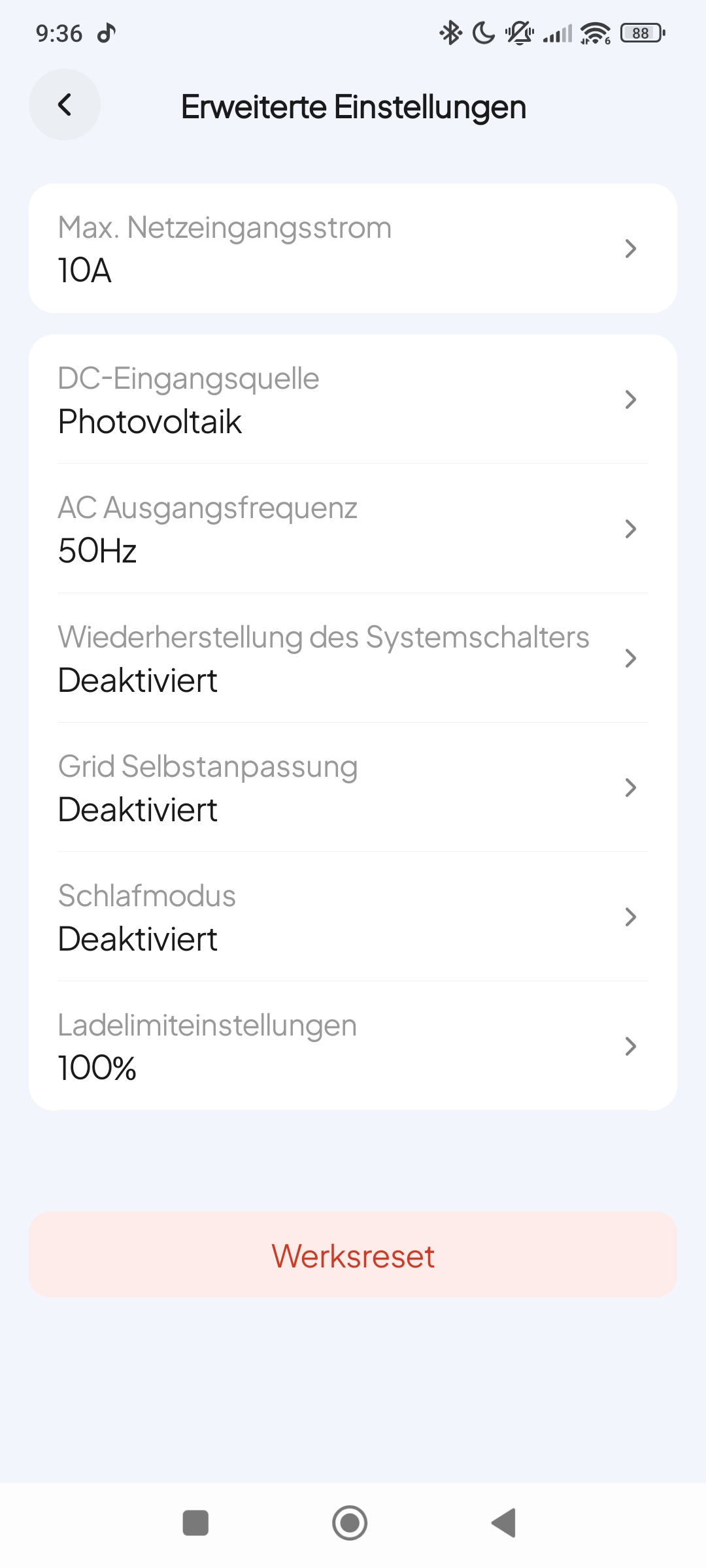 Im Anschluss wird die Powerstation über Bluetooth gesucht und ins heimische WLAN integriert. Der Startbildschirm bietet euch alle Informationen, die ihr auch auf dem Display erhalten könnt. Neben Eingangs- und Ausgangsleistungen stehen auch Informationen über den PV-Ertrag, die geladene Energie und historische Daten zur Verfügung. Ihr könnt mittels der Schiebeschalter die AC- und DC-Eingänge mit einem Klick aktivieren und bei Bedarf die Powerstation komplett abschalten. Klickt ihr auf die Symbole für Photovoltaik/Stromnetz/DC/AC, dann erhaltet ihr genauere Informationen zur Spannung der PV-Module oder Netzspannung, Stromstärke und den Leistungen.