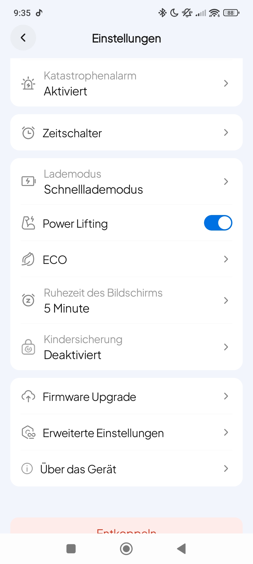 In den Einstellungen lassen sich eine ganze Menge Parameter konfigurieren. Neben Netzwerkeinstellungen, Firmwareupdates und Zugriffsrechten ist vor allem der Menüpunkt „Lademodus“ interessant. Hier könnt ihr die Ladegeschwindigkeit und die damit verbundene Lautstärke der Powerstation im Ladebetrieb festlegen. Bluetti bietet hier die Wahl zwischen „Schnelllademodus“ (2.400W), „Standardmodus“ (1.200W) und dem „Ruhemodus“ (800W). Erstmals lassen sich auch die Ausgänge der Powerstation zeitgesteuert ein- und ausschalten. Diese könnt ihr wie smarte Steckdosen mittels Zeitplan minutengenau schalten.