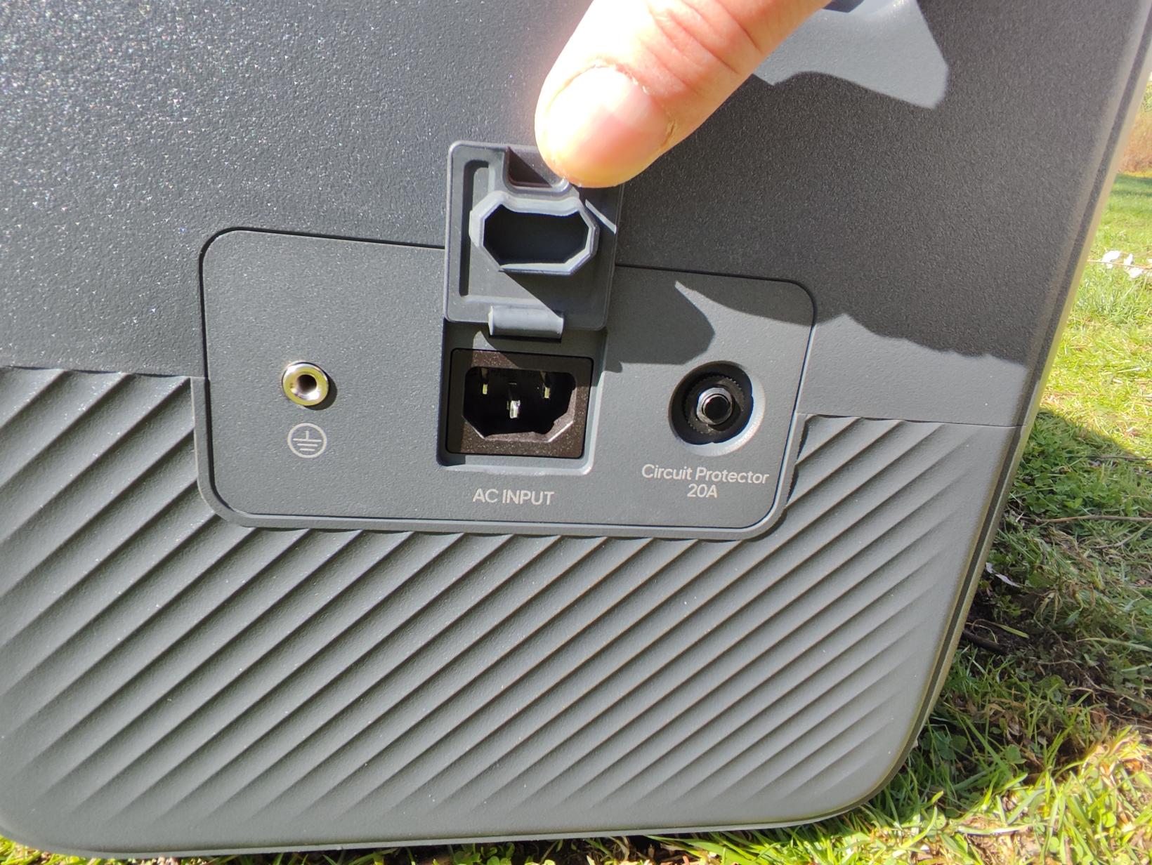 Belüftungslöcher an den Seiten sucht man bei der Bluetti Elite 300 vergeblich. Das komplette Kühlsystem wurde auf die Rückseite der Powerstation verlagert. Auf der rechten Seite findet ihr lediglich eine Schraube für den Potenzialausgleich, die AC-Ladebuchse und einen Sicherungsautomaten (20A), den ihr nach dem Fehlerfall manuell zurücksetzen könnt.