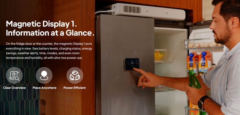 Dank des flachen Designs lässt sich die FridgePower auf dem Kühlschrank verstauen oder mittels der Halterung an der Wand verbauen. Die Steuerung erfolgt über die Bluetti App oder erstmals mittels eines externen Displays. Dieses verfügt über einen eingebauten Akku und eine Magnethalterung. Dementsprechend kann es auf allen magnetischen Untergründen befestigt werden und kommuniziert drahtlos mit der FridgePower.