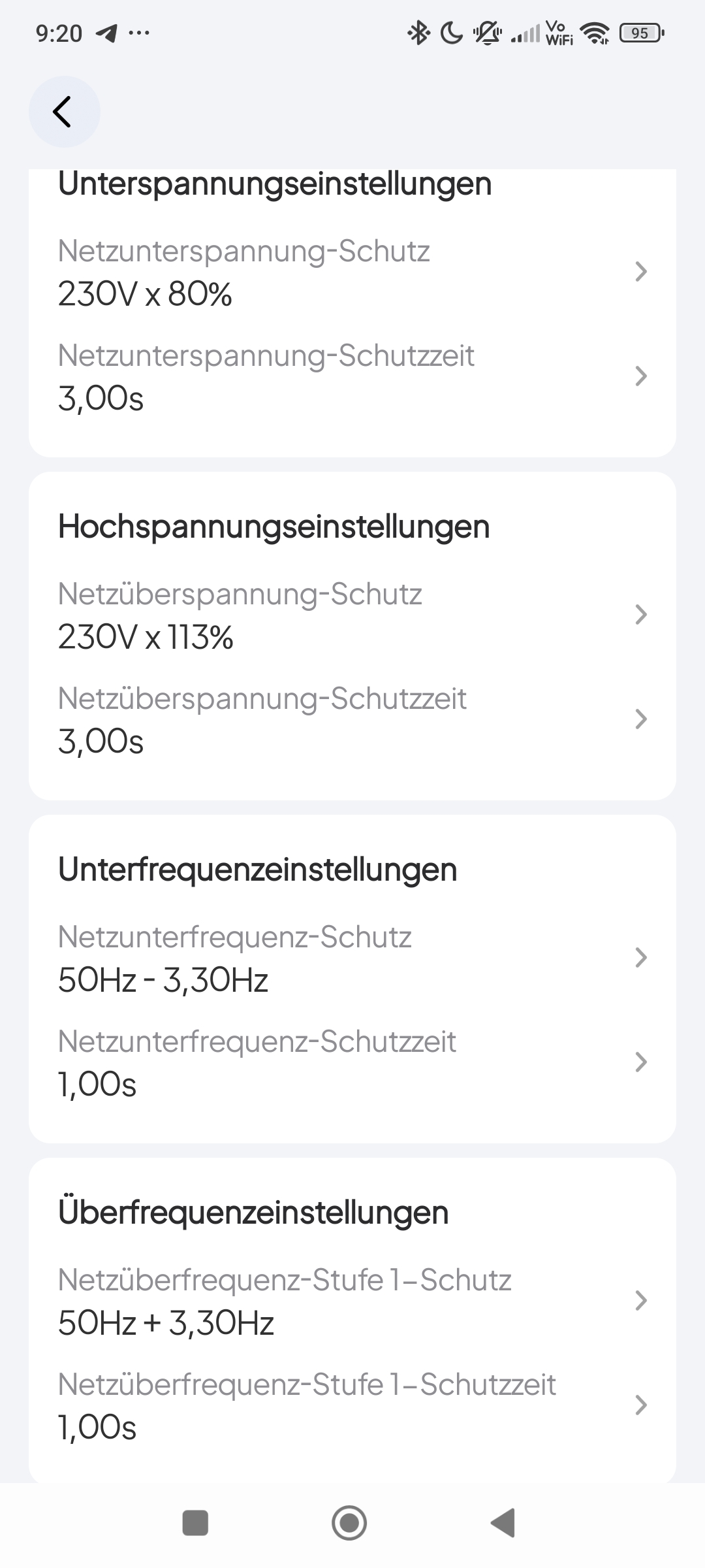 In den Geräteeinstellungen lassen sich weitere Optionen aktivieren, darunter der Power-Lifting-Modus, der eine maximale Ausgangsleistung von bis zu 2.250W ermöglicht. Unter dem Menüpunkt Lademodus kann die Ladegeschwindigkeit angepasst werden. Bluetti bietet dafür drei Varianten: Schnellladen (1.400W), Standard (500W) und den leisen Ruhemodus (200W mit reduzierter Geräuschentwicklung). Weiterhin kann die Ladegeschwindigkeit auch manuell im Bereich von 230-1.400W (in 230W-Schritten) eingestellt werden. Über die Eco-Einstellungen lässt sich steuern, wann sich die AC/DC-Ausgänge bei zu geringer Last automatisch abschalten, um den Akku zu schonen. Neben Firmwareupdates und der Einstellung des Display-Timeout können Schutzmaßnahmen für die Gerätesicherheit eingestellt werden. So lässt sich die maximale/minimale Netzspannung und Frequenz einstellen, bei der die Bluetti Elite die Ladung aus dem Netz zulässt.