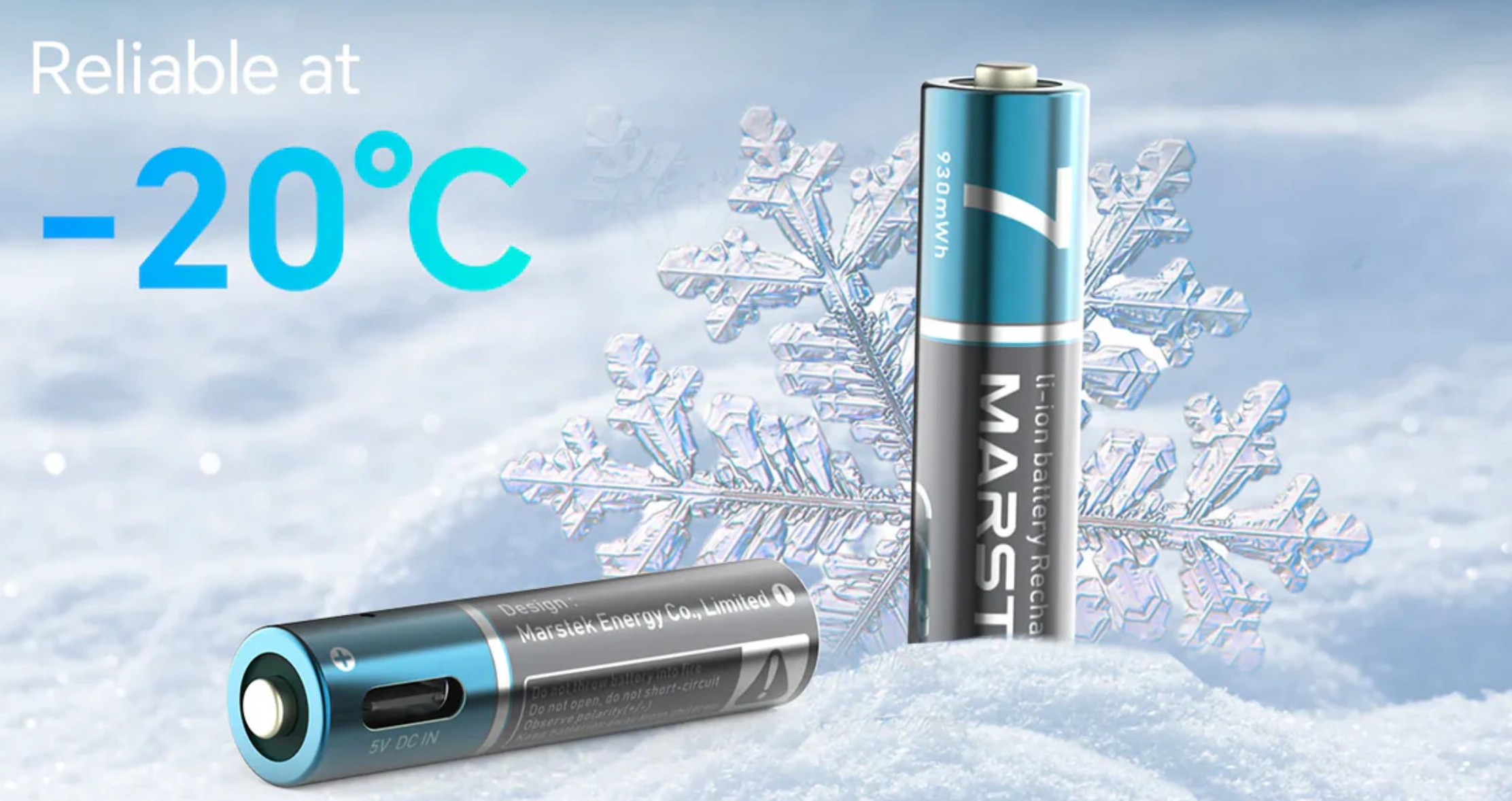Genau hier setzen die Marstek Lithium-Ionen-Akkus an. Diese bieten eine zuverlässige Spannung von 1,5V, können bis zu 1.500-mal aufgeladen werden und sind kompatibel mit allen handelsüblichen AA- und AAA-Batterien. Die 1,5V werden bis zum Erreichen der unteren Entladegrenze konstant gehalten. Somit werden eure Geräte selbst mit fast leeren Akkus noch mit der vollen Leistung betrieben. Geladen werden die AA- und AAA-Akkus ganz einfach über den integrierten USB-C-Port. Zusätzlich zeigt ein LED-Indikator den Ladestand an. Mit einer Kapazität von 930mWh/3.700mWh (AA/AAA) liegen die Marstek-Akkus in etwa gleichauf mit handelsüblichen NiMH-Akkus, bieten aber eine wesentlich höhere Lagerdauer (bis zu 3 Jahre bei 80% Ladung) und können selbst bei extrem niedrigen Temperaturen von bis zu -20°C eingesetzt werden.
