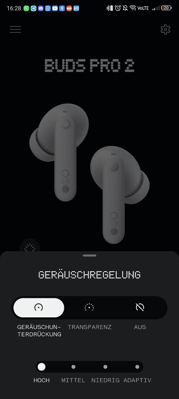 Bleibt noch ANC. Wie üblich gibt es einen Transparenzmodus und verschiedene Stufen der Rauschunterdrückung. Von hoch bis niedrig kann man die Stärke frei wählen oder den Kopfhörer adaptiv entscheiden lassen. Letzteres funktioniert recht gut. Der Eingriff in die Klangabstimmung ist minimal, eine leichte Bassanhebung ist hörbar. Die Qualität des ANC ist nicht schlecht, aber auch nicht überragend. Die meisten Störgeräusche werden gut erfasst und reduziert. Bei den üblichen Problemfällen versagen aber auch die CMF Buds Pro 2.