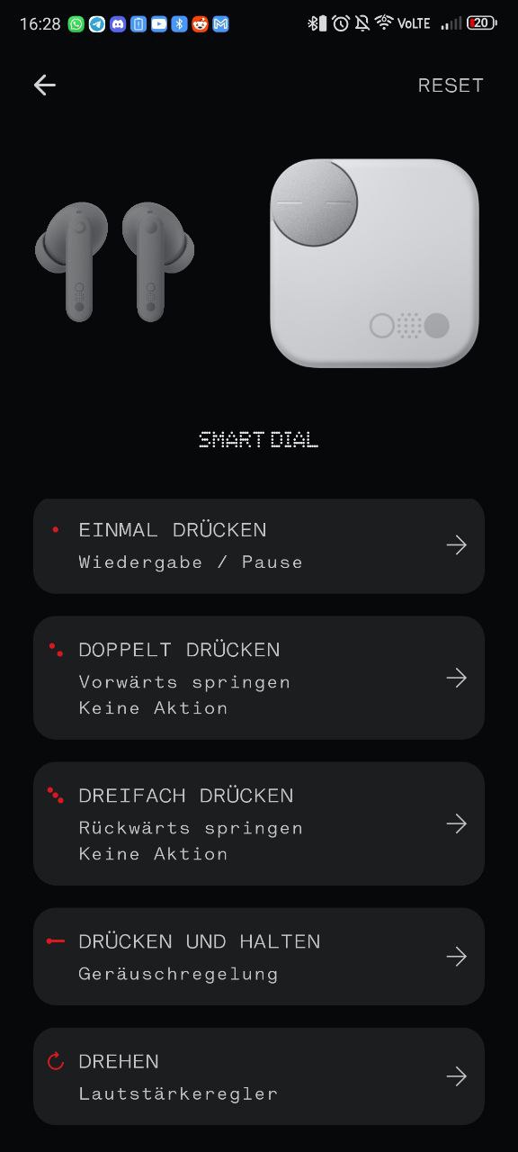 Im Standard sind einige Optionen nicht belegt. Unter anderem das komplette Smart Dial. Insgesamt gibt es genügend Möglichkeiten alles abzudecken, allerdings kann man nicht alles jedem Befehl zuweisen. Eine Lautstärkenregelung über die Buds ist beispielsweise nur bei zweimaligem Antippen und Halten möglich.