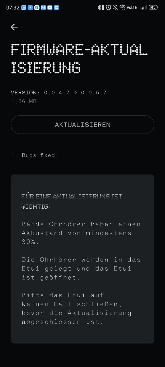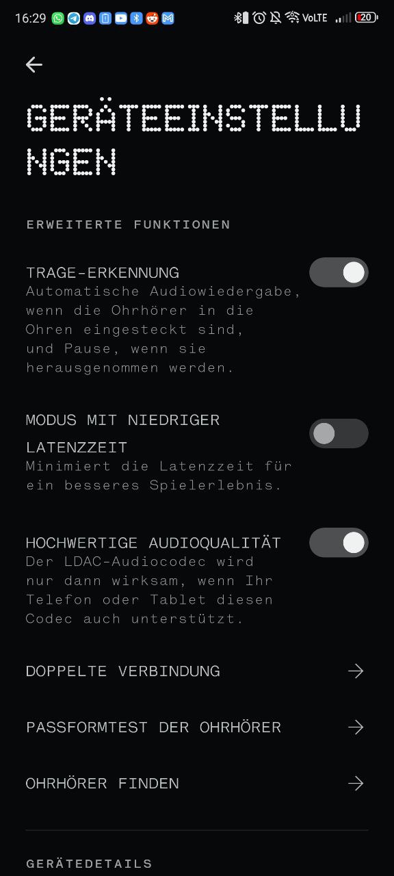 Nach wie vor finde ich es schade, dass der integrierte Equalizer lediglich „Bass“, „Mitten“ und „Höhen“ regeln lässt, statt einzelne Frequenzbänder. Aber es bleibt dadurch natürlich sehr simpel. Auf der zweiten Seite finden sich die Einstellung für die duale Verbindung, die Trageerkennung, die LDAC Aktivierung, den Modus für niedrige Latenz und noch einiges mehr. Natürlich lassen sich über die App auch Firmwareupdates einspielen. Unser Testgerät war auf dem Stand 0.0.5.7 und hat während des Tests ein Update erhalten.