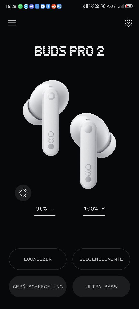 Wir kennen die App bereits von den anderen Nothing Kopfhörern, sowie von der ersten Generation der CMF Buds. Im Kern hat sich weder der Aufbau noch der Umfang stark geändert. Ein Konto ist nicht notwendig. Auf der Hauptseite finden sich die wichtigsten Optionen und das Bild der Buds ist gleichzeitig ein Shortcut zur Touchsteuerung.