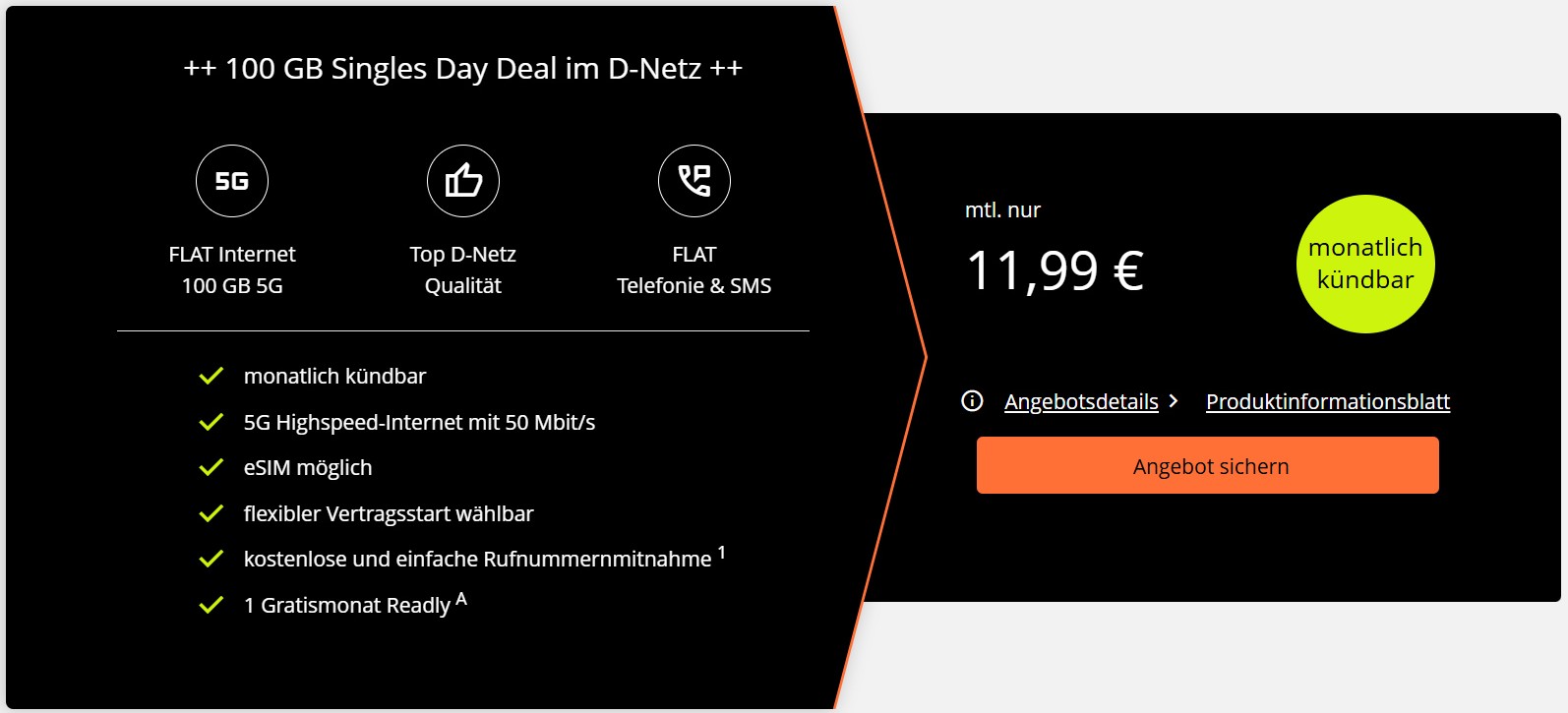 Crash haut zum Singles Day einen absoluten Kracher-Tarif im Vodafone-Netz raus! Statt der bisherigen 40GB gibt es jetzt satte 100GB Datenvolumen mit 5G. Das Beste daran: Der Tarif ist monatlich kündbar und kostet trotzdem nur 11,99€ pro Monat! Lediglich ein geringer Anschlusspreis von 9,99€ fällt einmalig an.