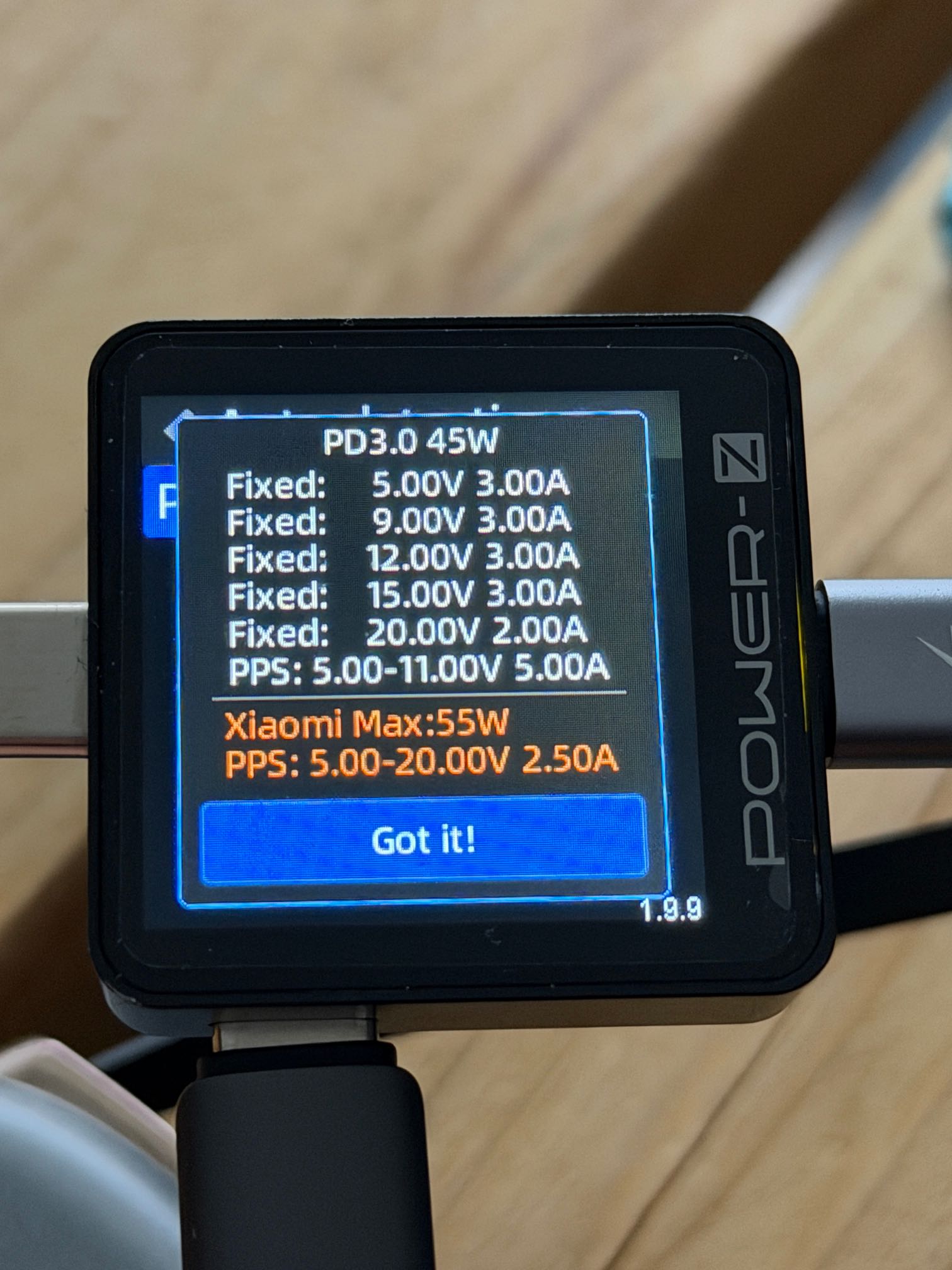 Die Cuktech 10 Mini Powerbank verfügt über einen Eingang mit 55W. Hier wird überraschenderweise PPS genutzt, denn die 11V/5A-Spanne wird komplett ausgenutzt. Mit einem Power-Delivery-Ladegerät ohne PPS sind immerhin noch 45W Input möglich. Einen wirklichen Unterschied macht das in der Realität jedoch nicht.