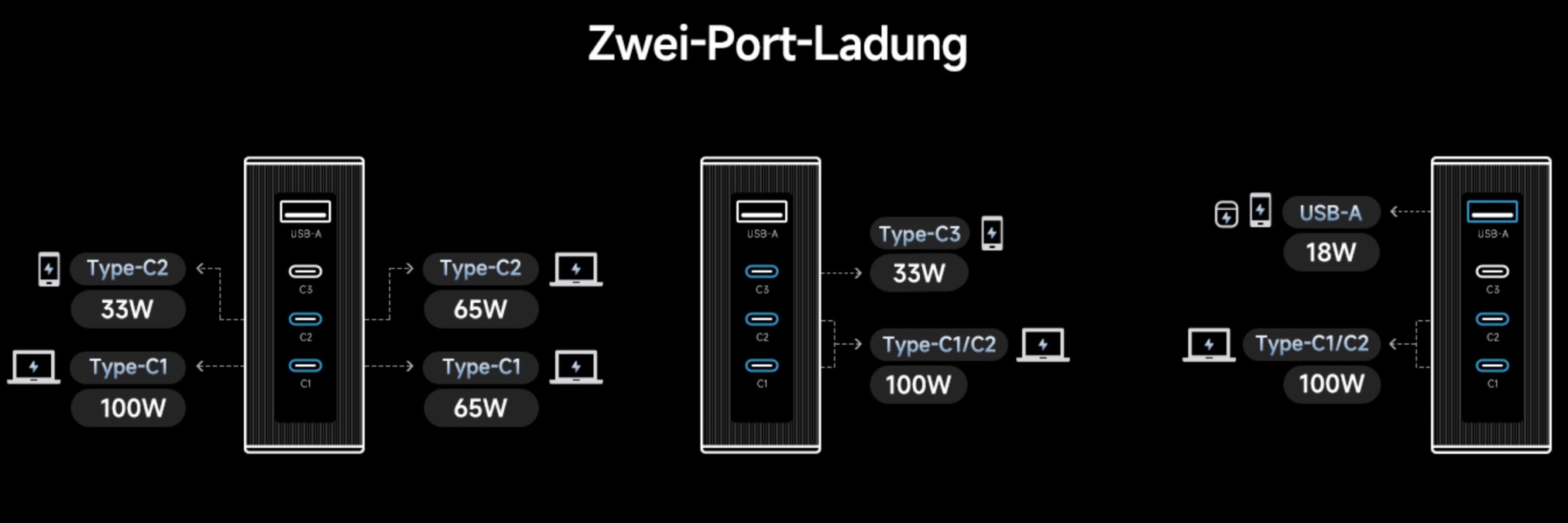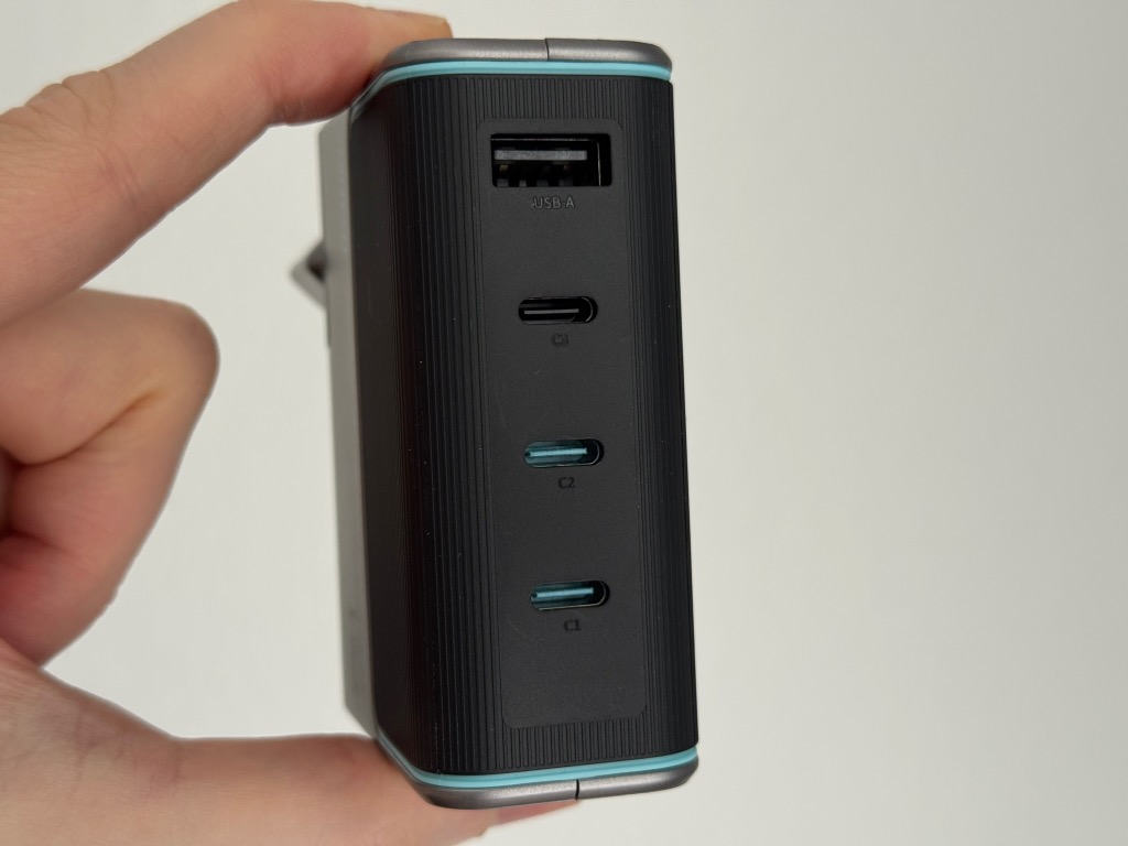 Bei den ersten beiden USB-C-Ports kann das Ladegerät erkennen, ob z.B. ein leistungsstarker Laptop geladen werden möchte, priorisiert diesen mit 100W und gibt auf C2 dann nur noch 30W frei. Werden zwei Smartphones angeschlossen, erfolgt die Aufteilung dieser beiden Ports jedoch auf bis zu 65W jeweils. Das ist optimal gelöst und bedient somit jedes Ladeszenario.
