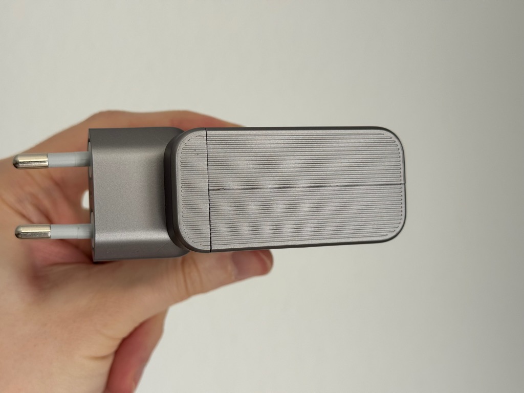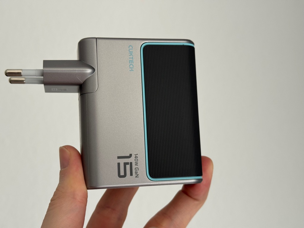 Cuktech setzt auf ein pragmatisches und vergleichsweise simples Gehäuse, dessen Verarbeitung aber keinen Anlass zur Kritik gibt. Der Charger wirkt sehr wuchtig und massiv, ohne Hohlräume oder sonstige Anzeichen einer billigen Fertigung. Während der silberne matte Kunststoff einen Großteil des Geräts überzieht, ist die Front mit den Ports mit einer geriffelten Textur versehen, was einen zusätzlichen Grip beim Ein- und Ausstecken des Ladegeräts bietet.