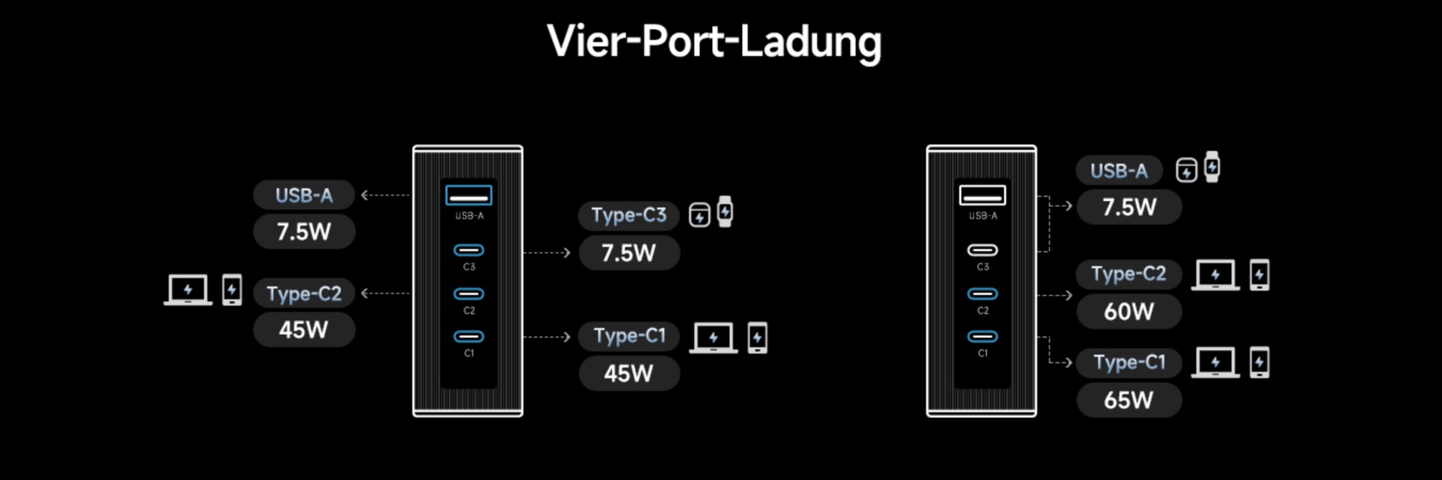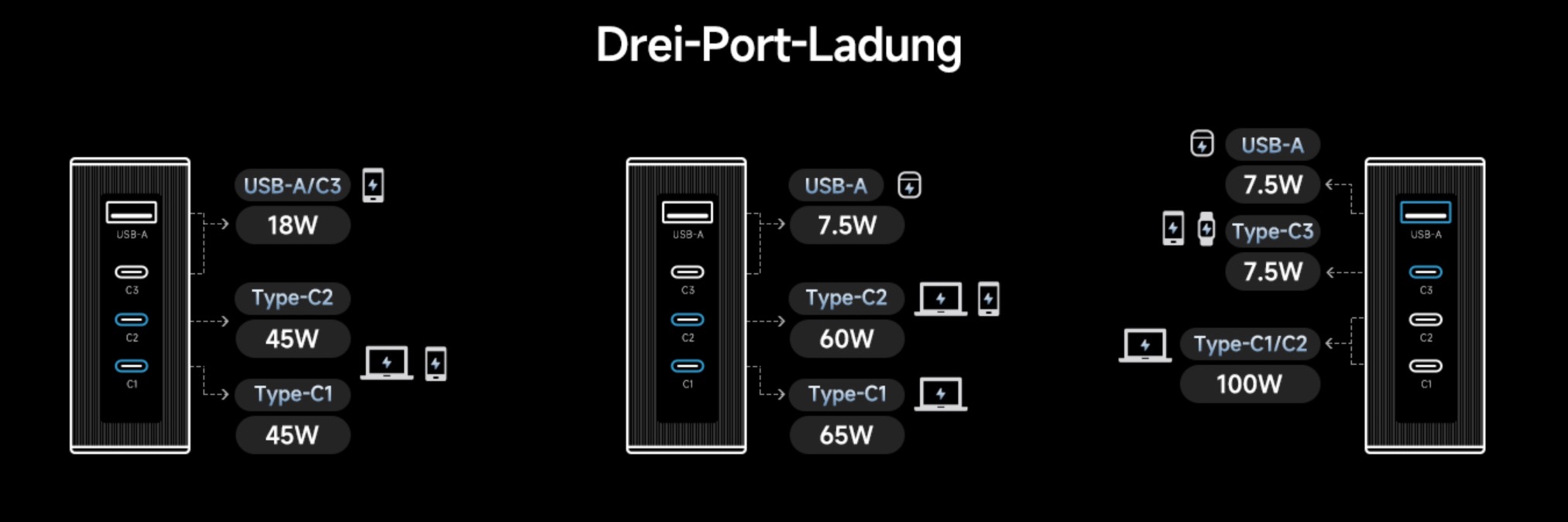 Möchtet ihr nun mehrere Geräte parallel an das Ladegerät anschließen, verteilt sich die Leistung nach folgendem Schema: