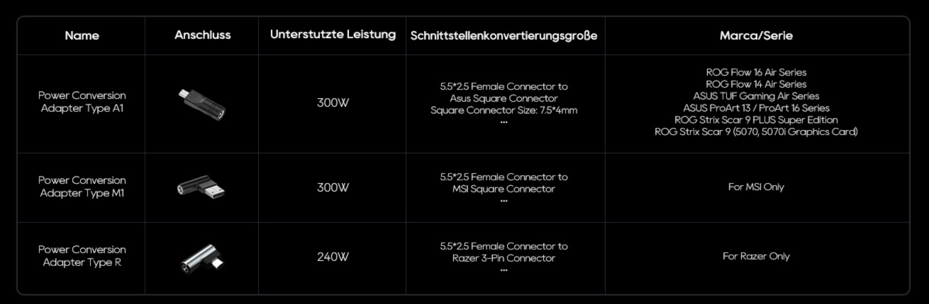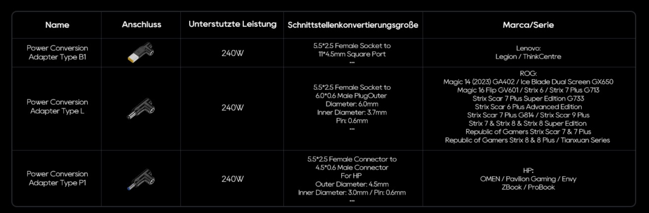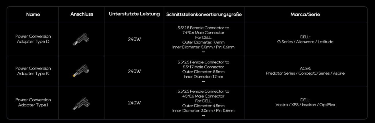 Für das DC-Kabel liegen 9 Adapter in einer zusätzlichen Zubehörbox bereit, damit ihr den Anschluss für Laptops verschiedener Hersteller nutzen könnt. Zu guter Letzt dürfen zwei Anleitungen nicht fehlen. Hier seht ihr alle Adapter für die verschiedenen Hersteller: