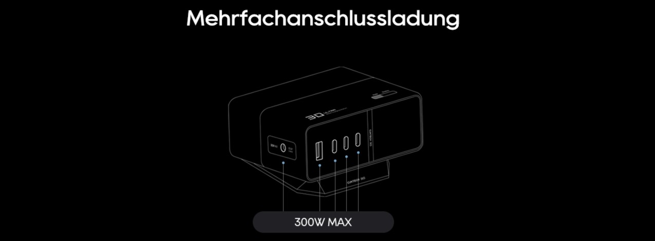 Die Gesamtleistung des Ladegeräts beläuft sich auf 300W. Diese erreicht ihr allein über den DC-Ausgang oder in der Summe der USB-Ports. C1 und C2 liefern jeweils 140W, C3 bietet 33W und A1 erreicht 22,5W.