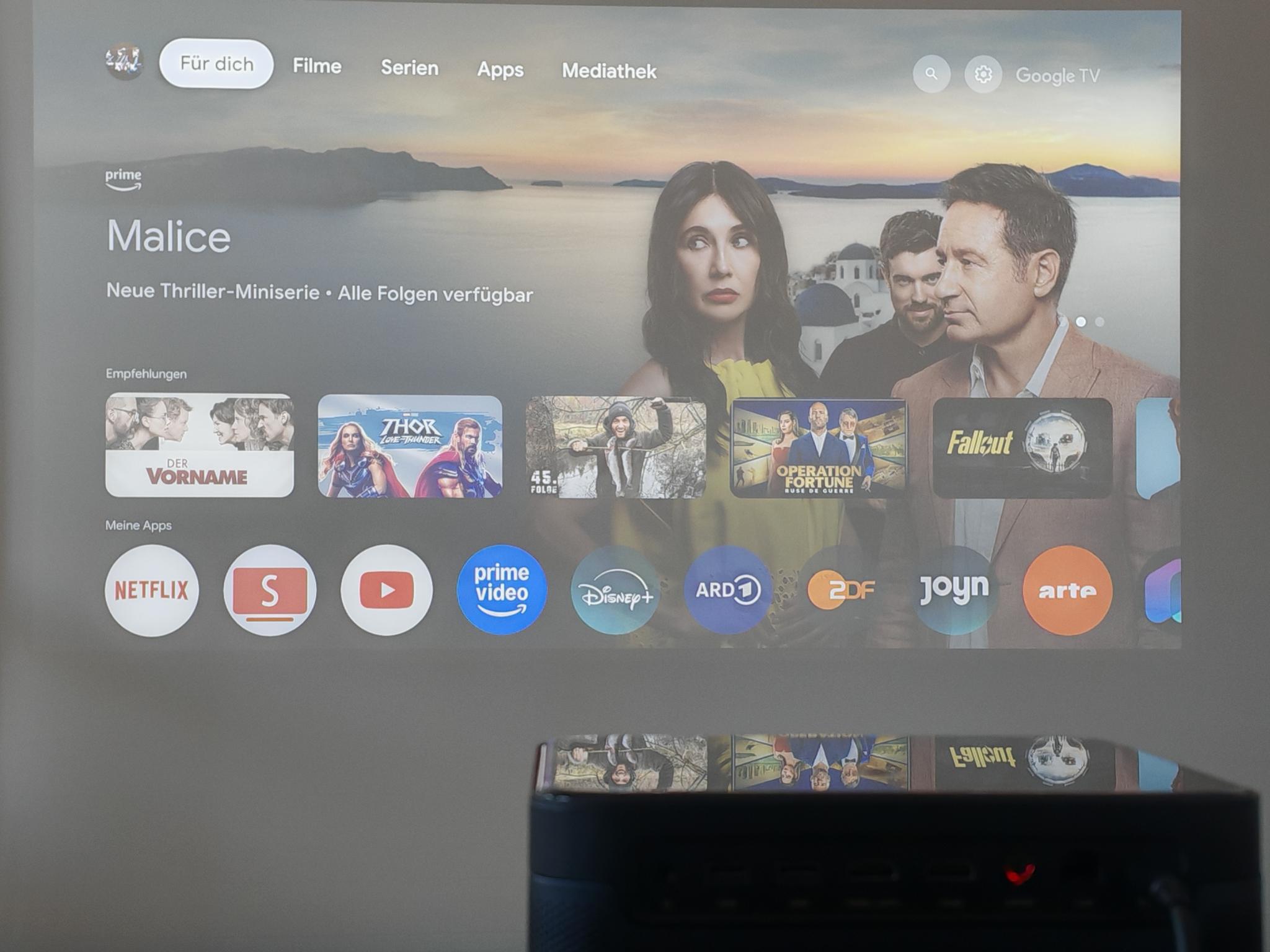 Eines der größten Kaufargumente des getesteten Projektors ist die Softwareumsetzung. Der Dangbei Mars Pro 2 läuft mit Google TV in der Version 11. Nach dem ersten Start wählt ihr, ob ihr euch mit einem Google-Account für alle Funktionen von Google TV anmelden wollt oder ob ihr nur Live-TV sehen und den Projektor für die Darstellung anderer Medien nutzen möchtet. Als ich versuchte, den Projektor in meinem Netzwerk und mit meinem Google-Account einzurichten, wirkte zunächst alles etwas fehlerhaft. Nachdem ich meine Benutzerdaten eingegeben hatte, erschien endlich der ersehnte Google-TV-Startbildschirm. Google TV ist immer eine gute Wahl als Betriebssystem, da es alle möglichen Apps zum Streamen und Anpassen des Projektors bietet. Zusätzlich ist der Dangbei Mars Pro 2 mit Widevine L1 ausgestattet, sodass ihr auch Inhalte von Pay-to-Watch-Anbietern in bestmöglicher Auflösung genießt. Die Benutzeroberfläche des Dangbei Mars Pro 2 ist sehr aufgeräumt und intuitiv zu bedienen. Leider gibt es vereinzelt Übersetzungsfehler bei den Einstellungen.