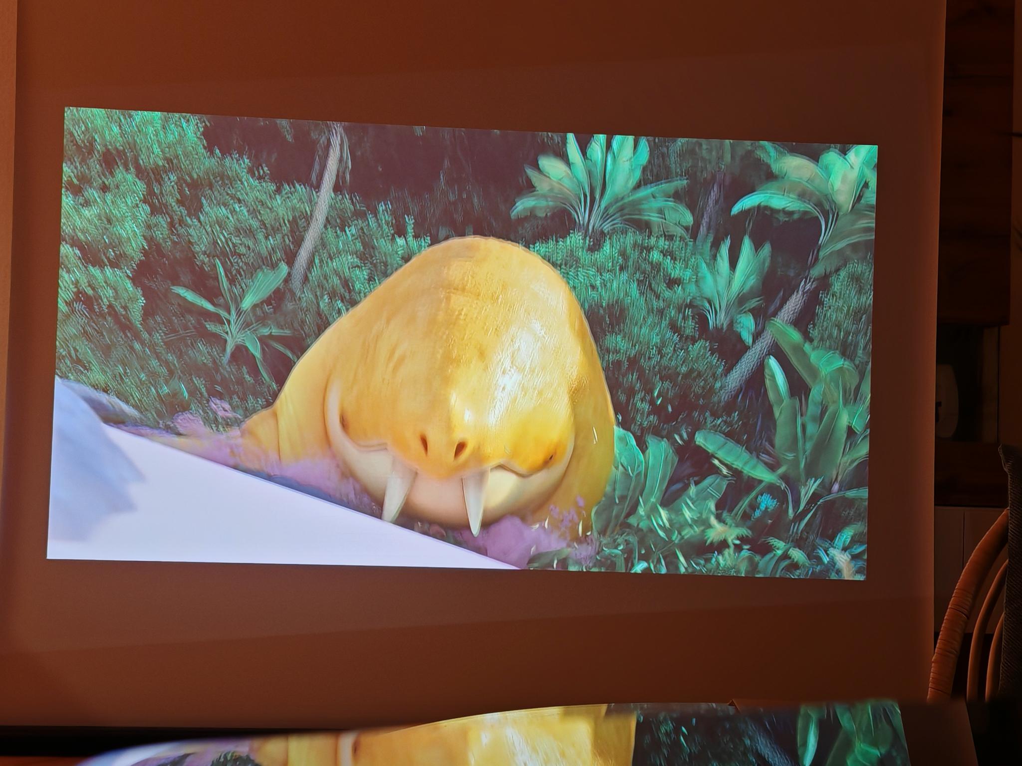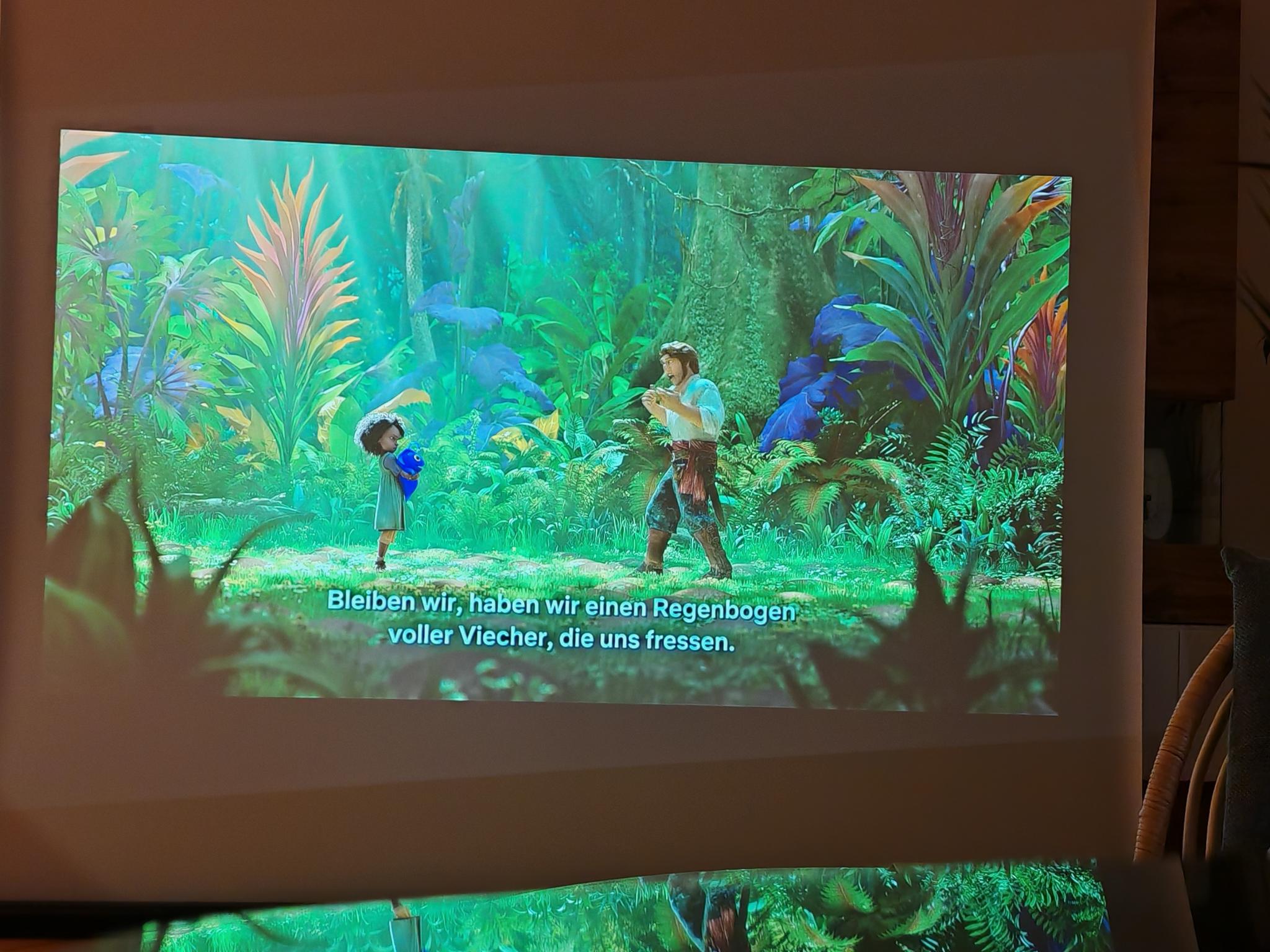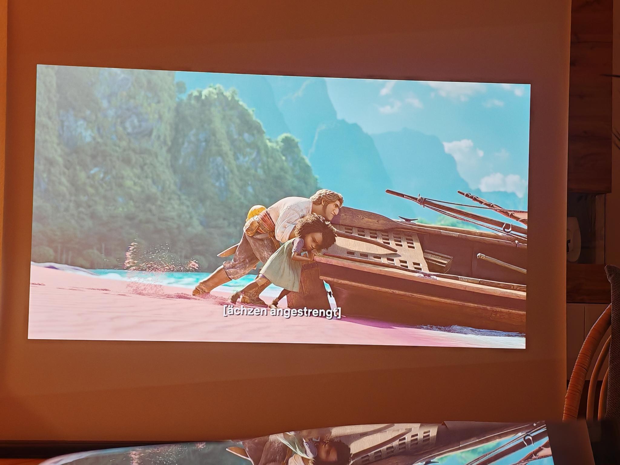 Ist das Bild eingestellt, erzeugt der Beamer eine sehr helle und scharfe Projektion, die auch in schwierigen Situationen (z. B. bei schrägen Projektionen) im richtigen Format erscheint. Der Dangbei Mars Pro 2 schafft eine sehr natürliche und kontrastreiche Projektion. Damit macht es richtig Spaß, einen cineastischen Film mit über 80 Zoll anzuschauen. Vor allem größere Projektionen sind durch die 4K-Schärfe ein wahrer Augenschmaus – selbst bei einem 100 Zoll großen Bild wirkt alles noch gestochen scharf. Dank MEMC stellt der Beamer schnelle Bewegungen und Kamerafahrten auch butterweich dar. Der Dangbei Mars Pro 2 verfügt zudem über eine natürlichere Bildkonfiguration als das neuere Modell DBOX02 Pro und ist trotz der kompakteren Bauform heller.