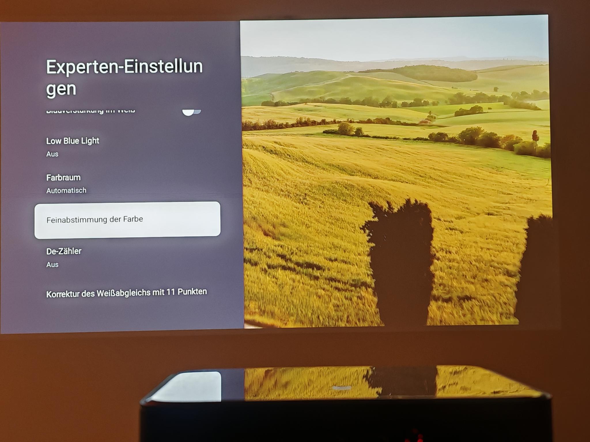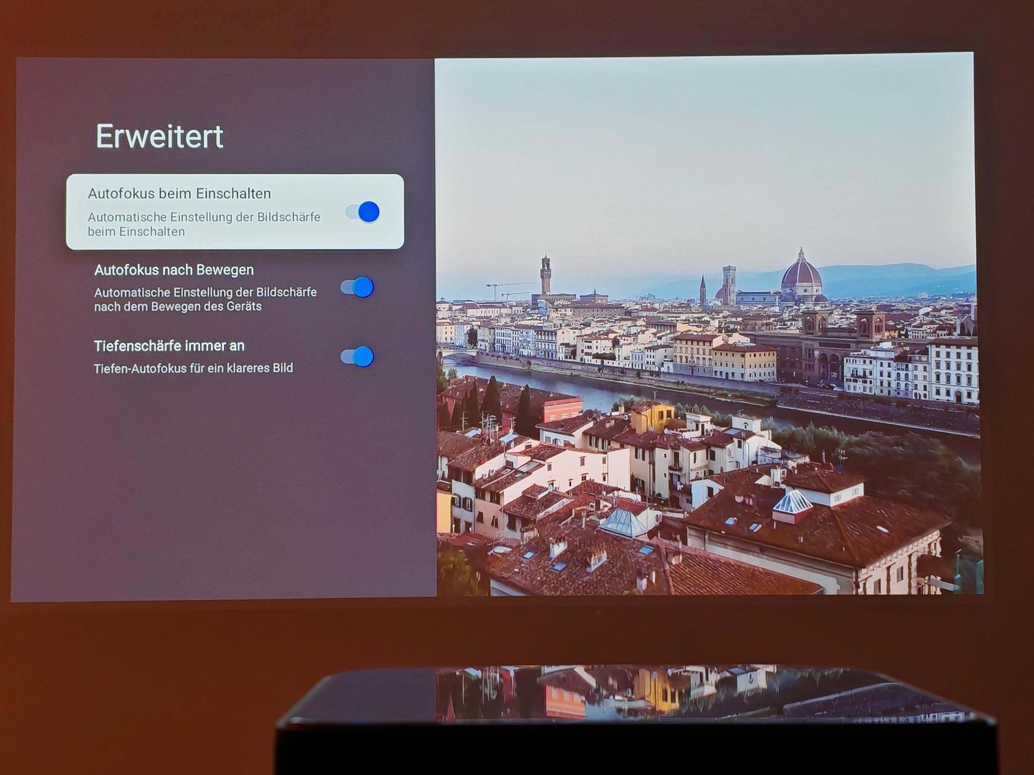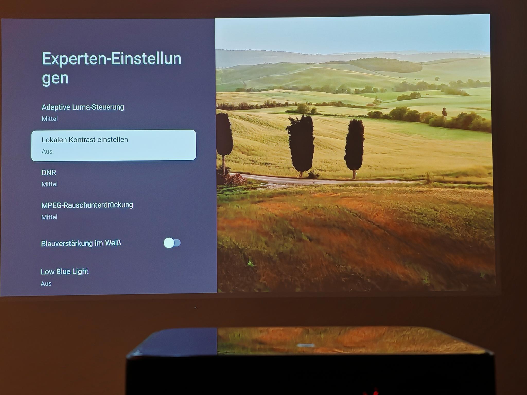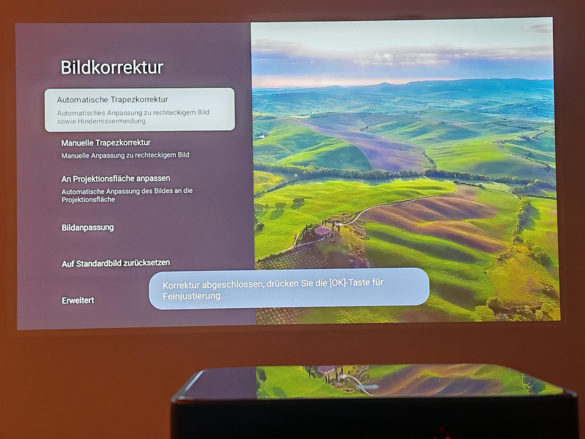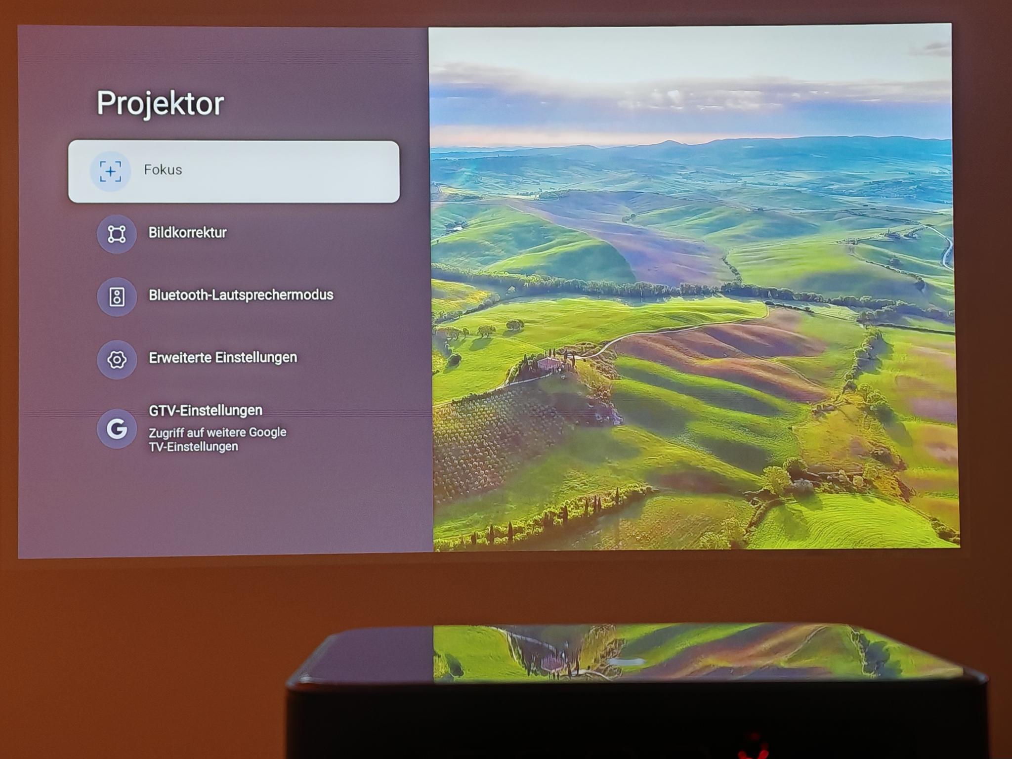 Nach dem ersten Einschalten führt der Dangbei Mars Pro 2 eine automatische Bildanpassung durch. Diese funktionierte direkt nach dem Anschalten schon sehr gut, sodass die Einstellung der Tiefen nicht erforderlich ist. Die automatische Bildanpassung greift jedoch nicht so direkt wie bei JMGO-Projektoren. Der Mars Pro 2 benötigt rund vier Sekunden für eine akkurate Bildanpassung.