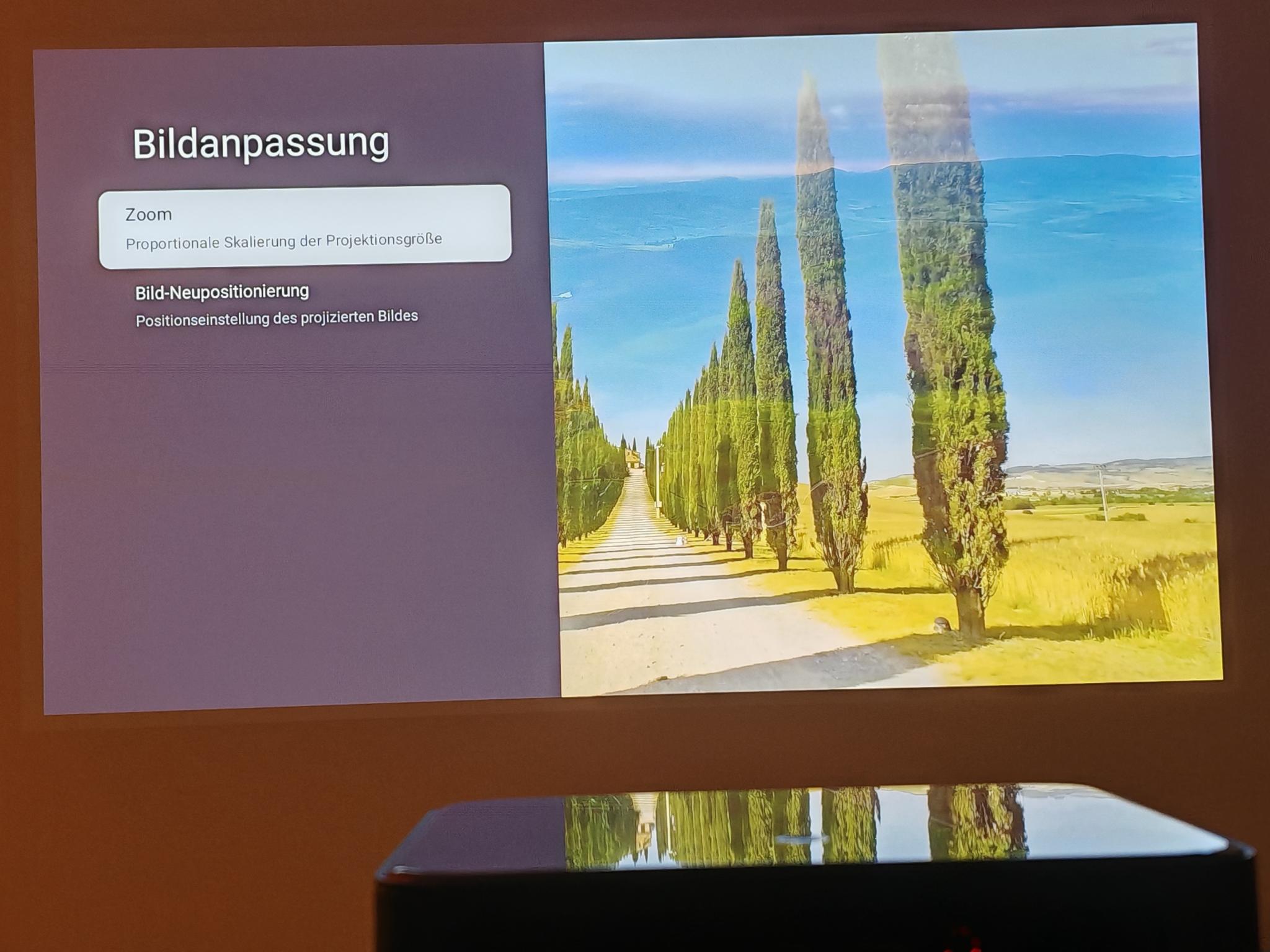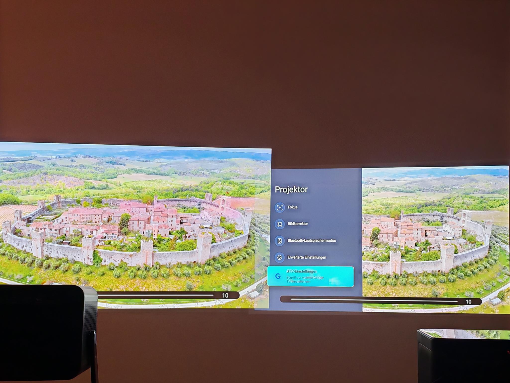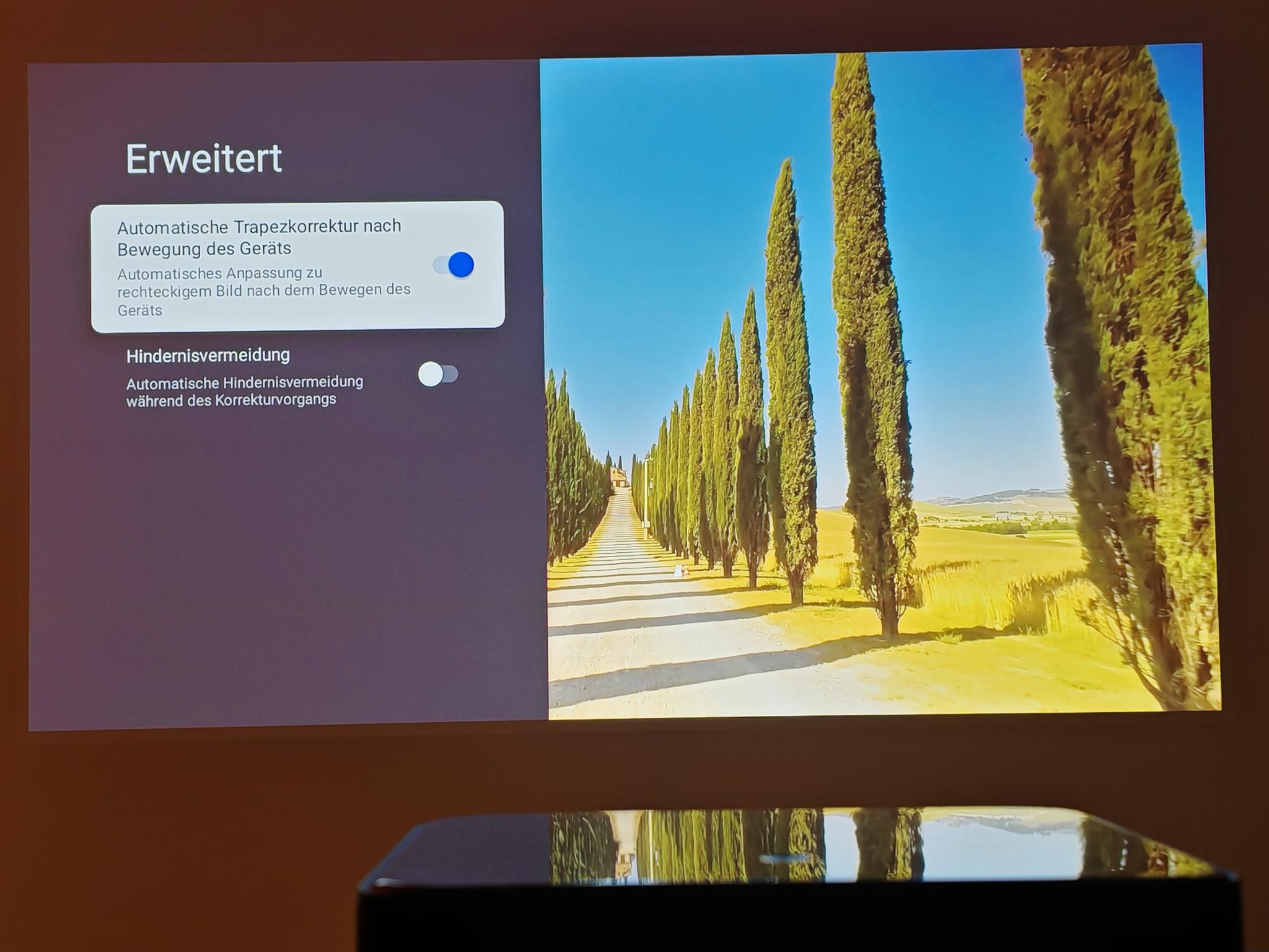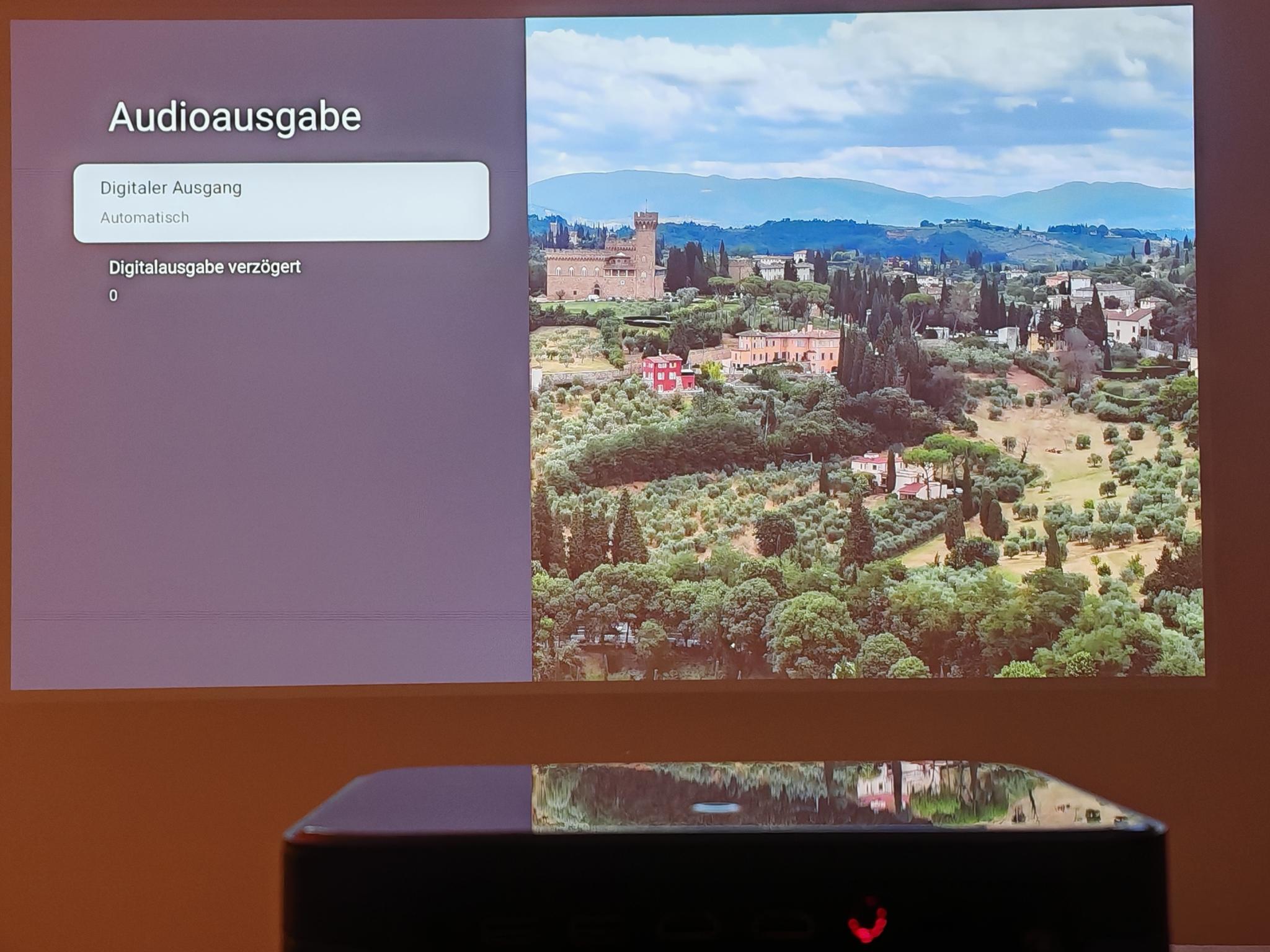 Nach dem ersten Einschalten führt der Dangbei Mars Pro 2 eine automatische Bildanpassung durch. Diese funktionierte direkt nach dem Anschalten schon sehr gut, sodass die Einstellung der Tiefen nicht erforderlich ist. Die automatische Bildanpassung greift jedoch nicht so direkt wie bei JMGO-Projektoren. Der Mars Pro 2 benötigt rund vier Sekunden für eine akkurate Bildanpassung.