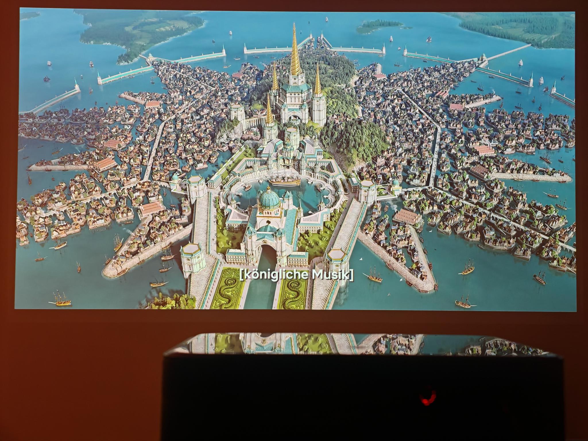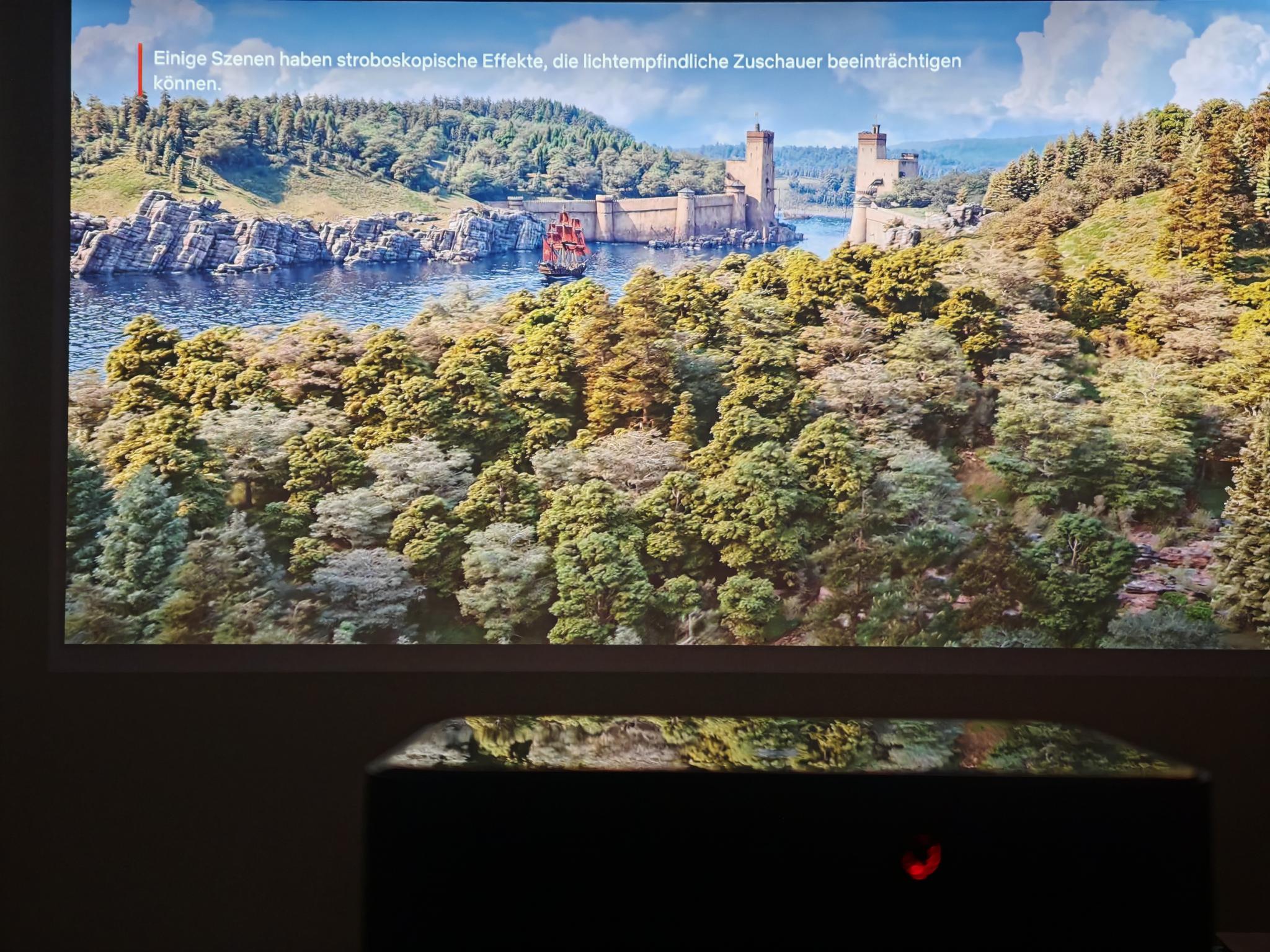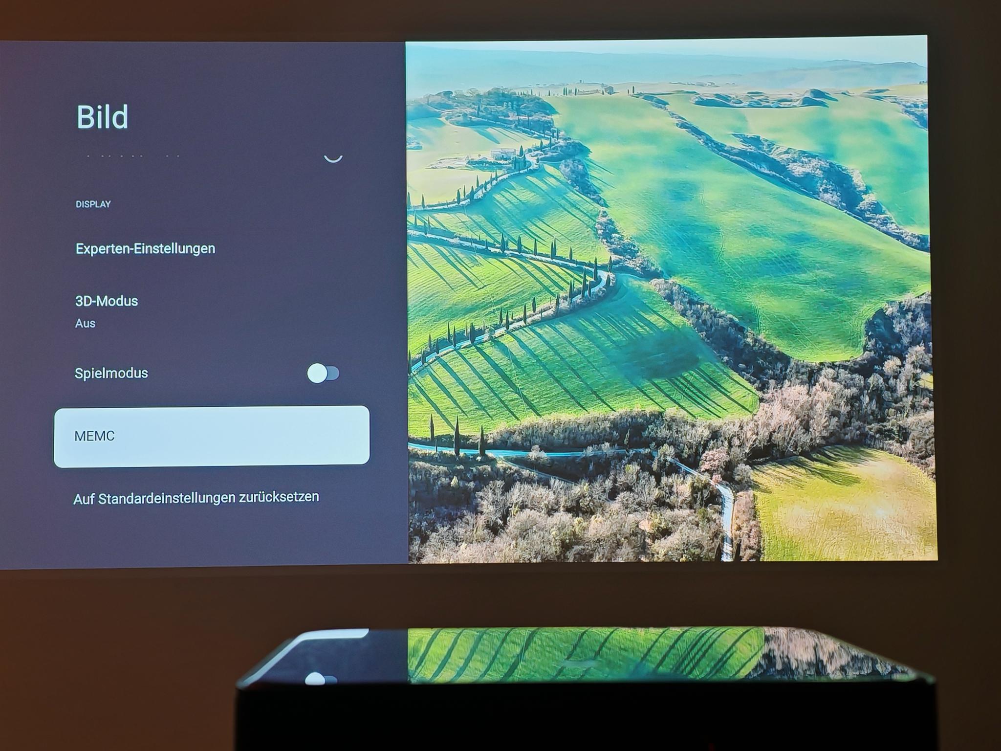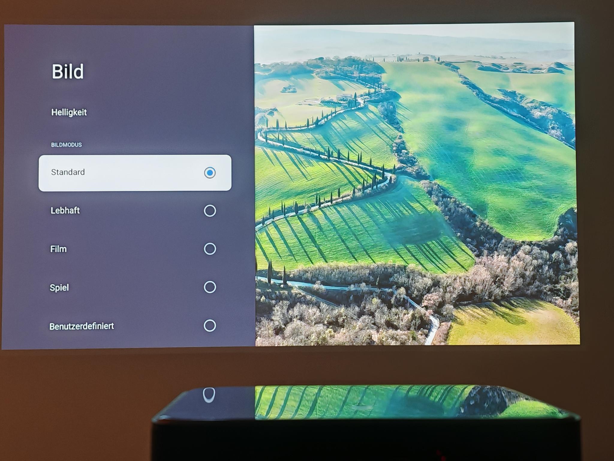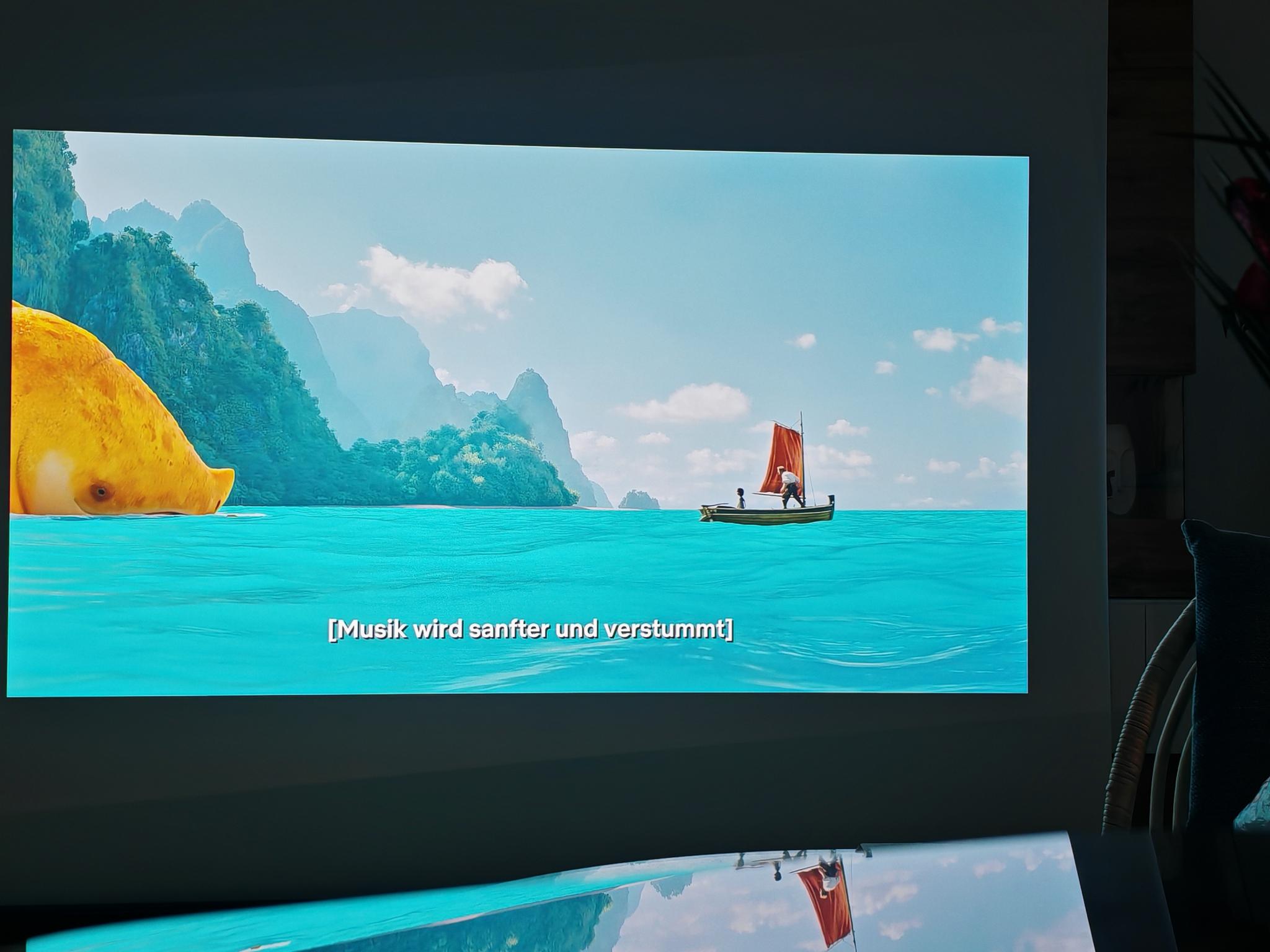 Nach dem ersten Einschalten führt der Dangbei Mars Pro 2 eine automatische Bildanpassung durch. Diese funktionierte direkt nach dem Anschalten schon sehr gut, sodass die Einstellung der Tiefen nicht erforderlich ist. Die automatische Bildanpassung greift jedoch nicht so direkt wie bei JMGO-Projektoren. Der Mars Pro 2 benötigt rund vier Sekunden für eine akkurate Bildanpassung.