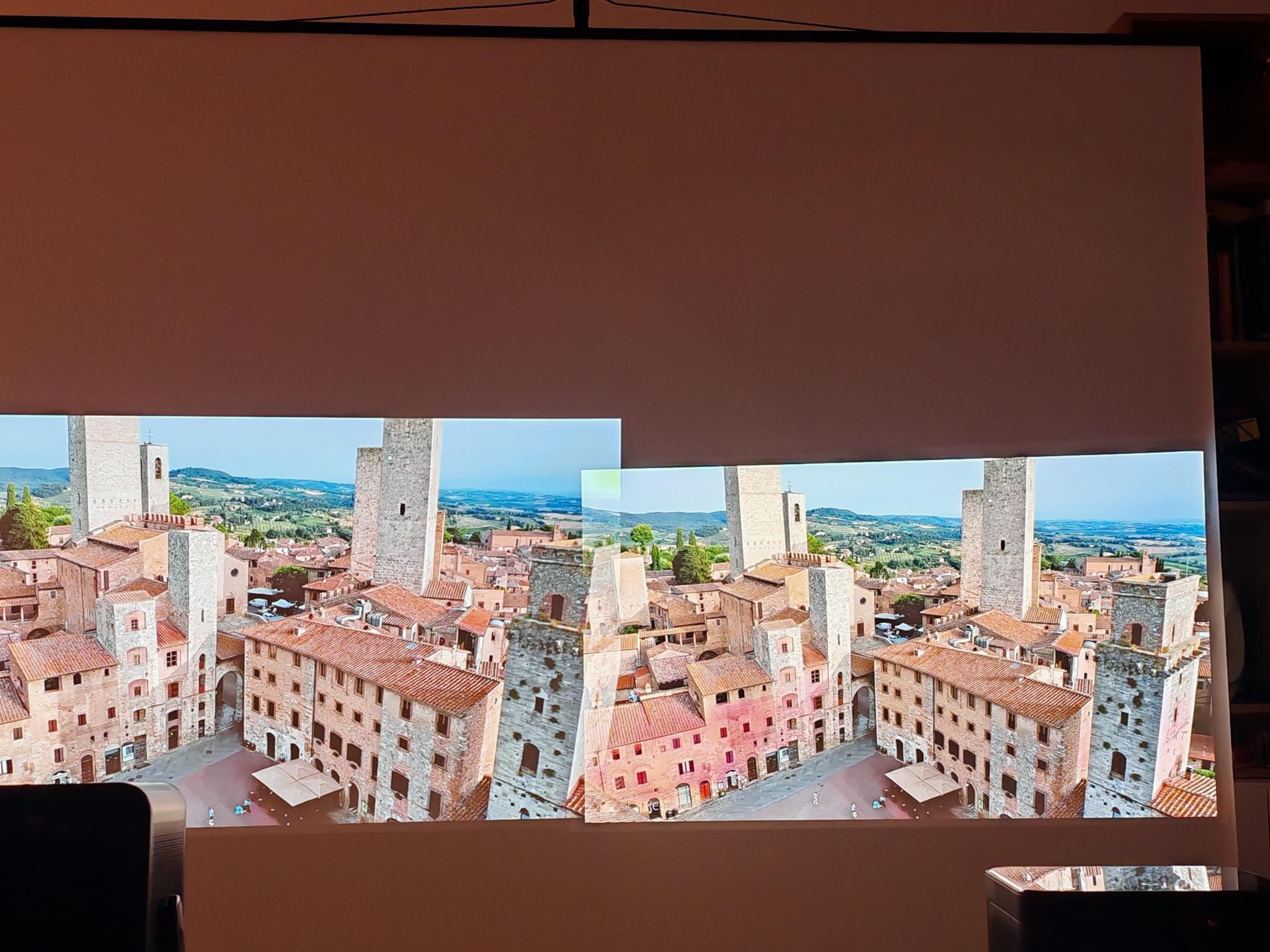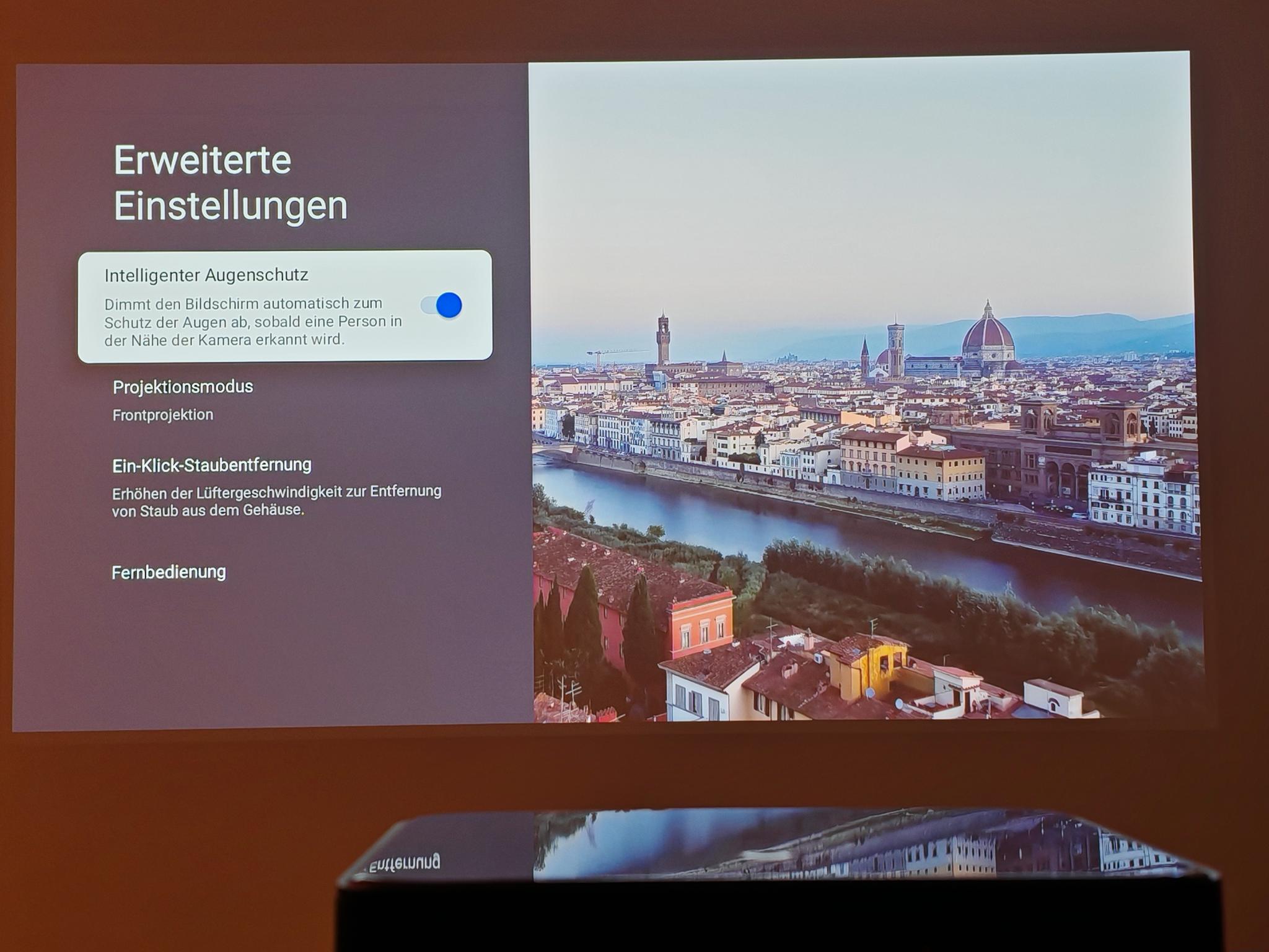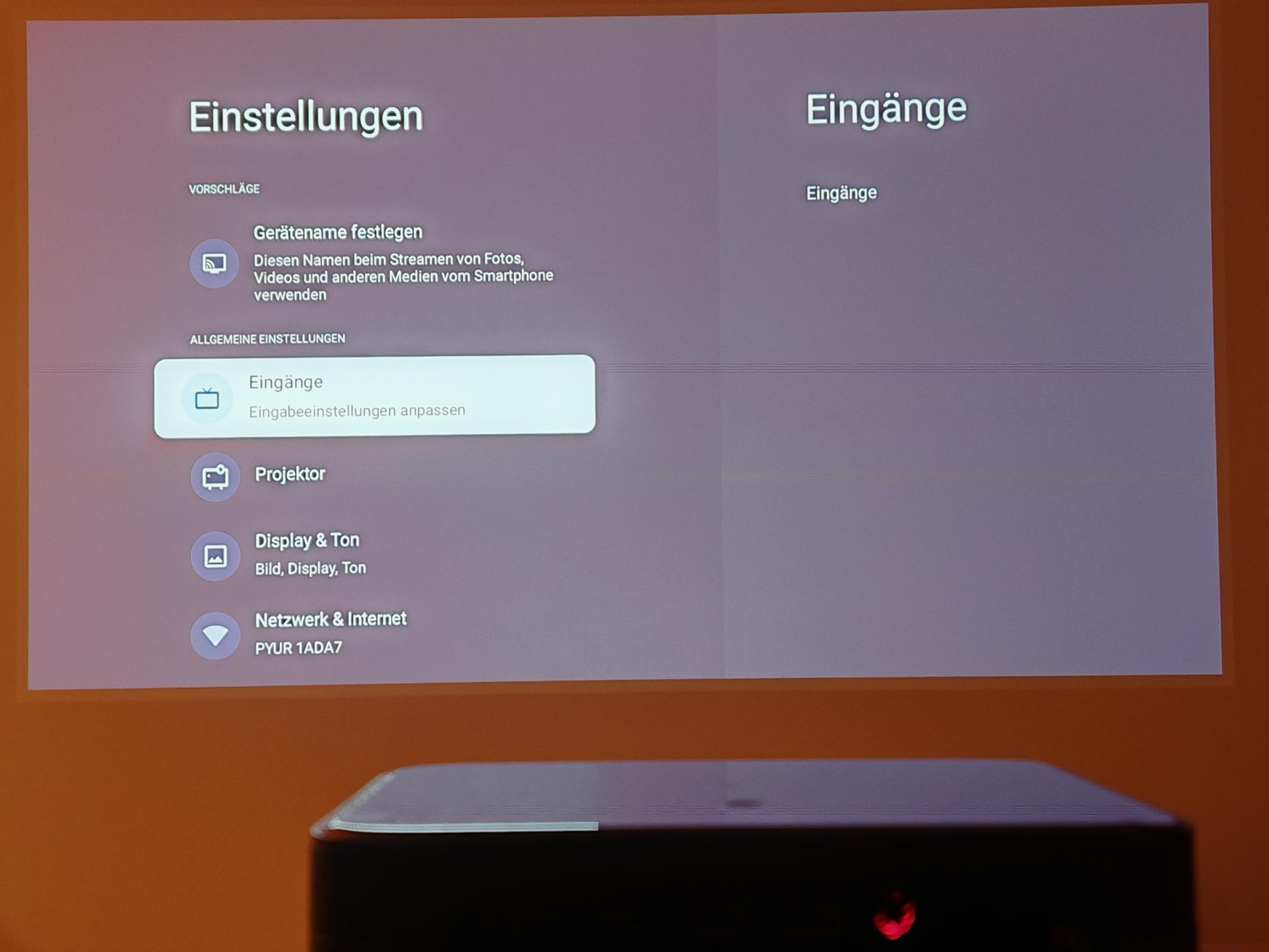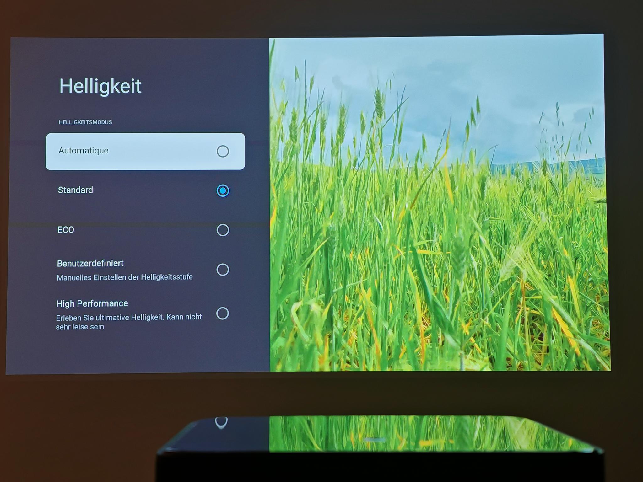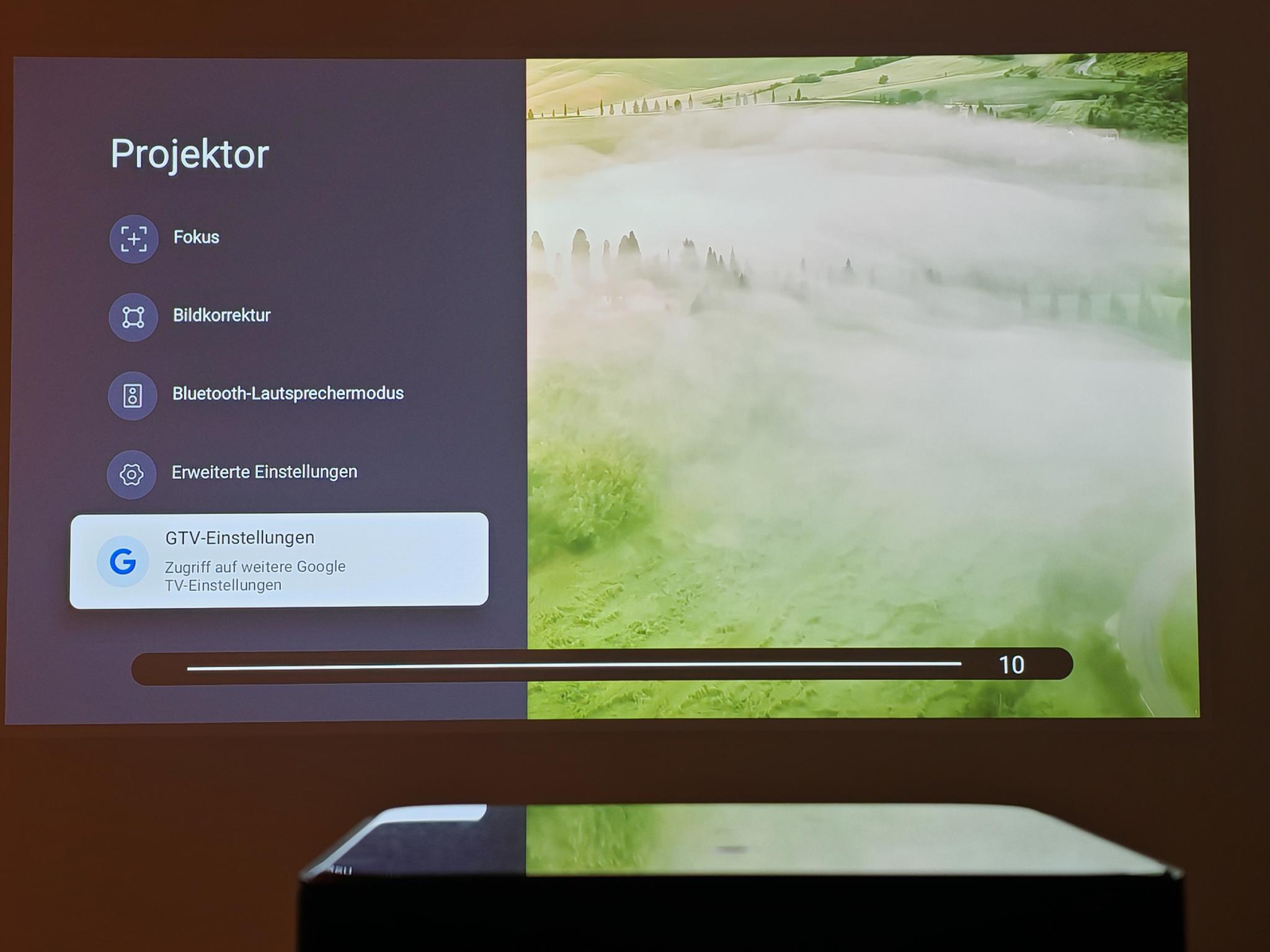 Nach dem ersten Einschalten führt der Dangbei Mars Pro 2 eine automatische Bildanpassung durch. Diese funktionierte direkt nach dem Anschalten schon sehr gut, sodass die Einstellung der Tiefen nicht erforderlich ist. Die automatische Bildanpassung greift jedoch nicht so direkt wie bei JMGO-Projektoren. Der Mars Pro 2 benötigt rund vier Sekunden für eine akkurate Bildanpassung.