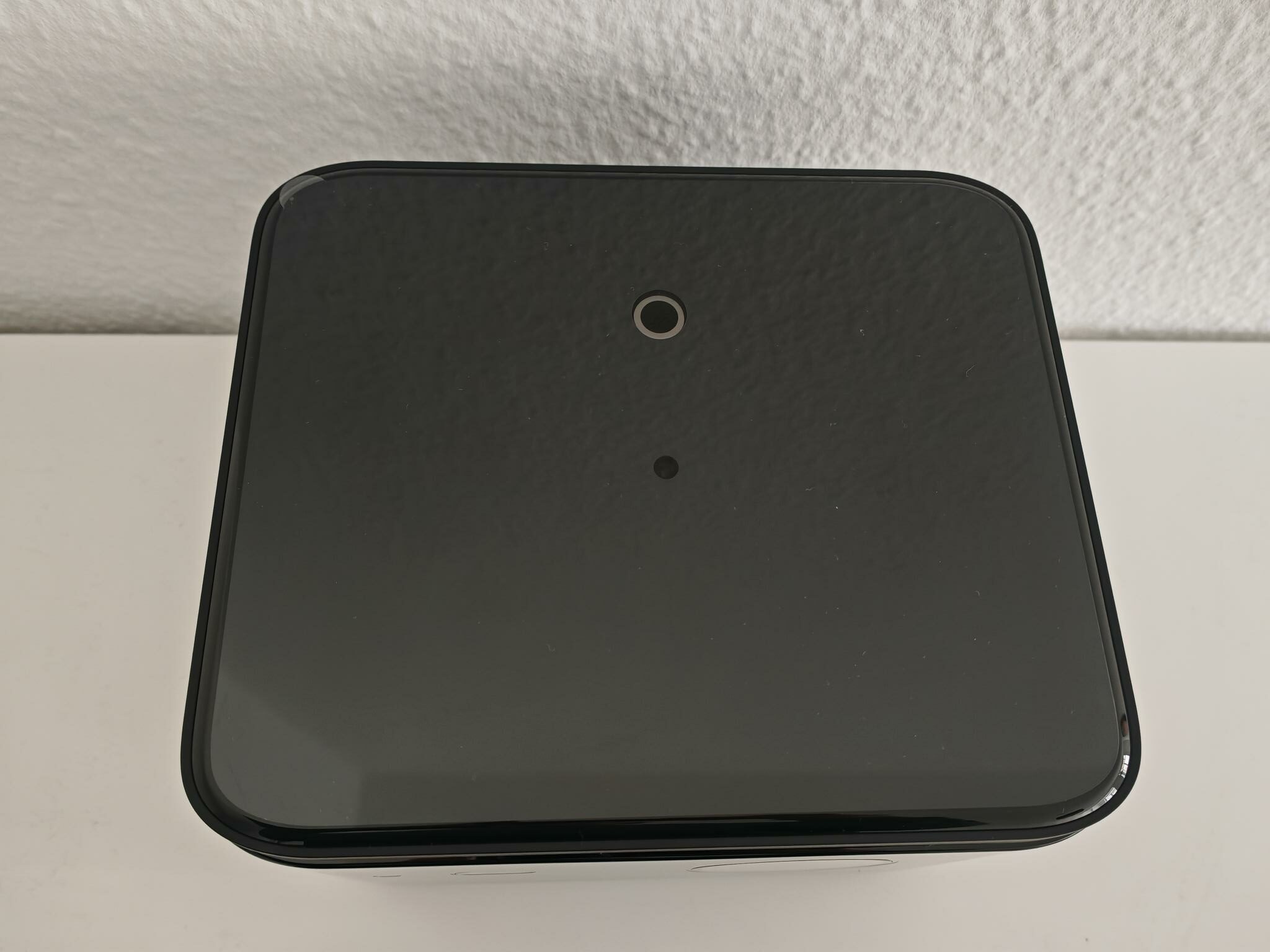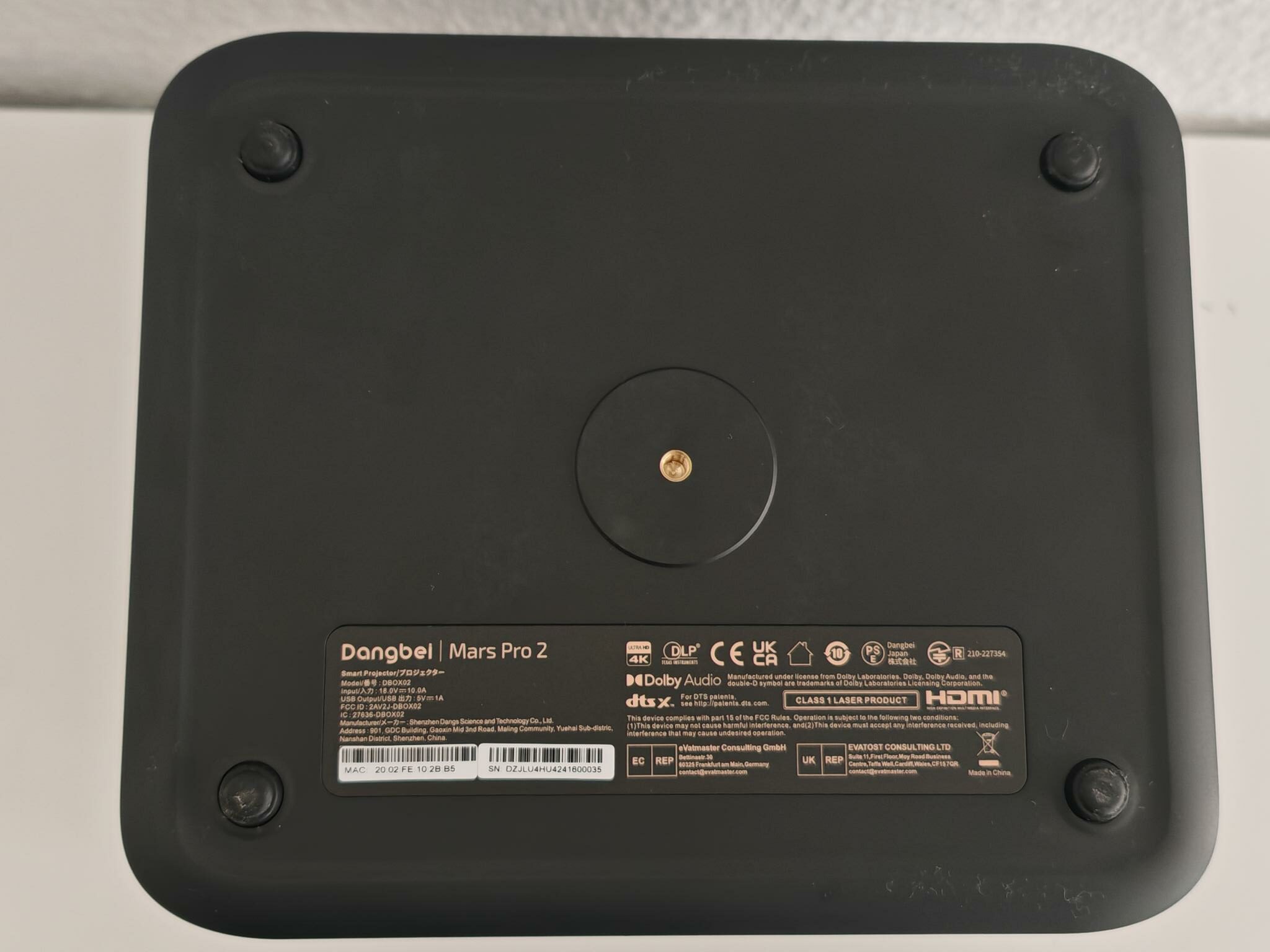 Die Anschlüsse verbaut Dangbei beim Mars Pro 2 auf der Rückseite. Dort befinden sich ein Kopfhörerausgang, zwei USB-A-2.0-Anschlüsse, ein LAN-Eingang, zwei HDMI-2.1-Anschlüsse (einer davon eARC-fähig) und sogar ein optischer Ausgang (S/PDIF). Letzteren habe ich bisher bei kaum einem Testgerät gefunden, obwohl er bei Soundsystemen der Heimtechnik noch häufig zum Einsatz kommt. Der obere und untere Bereich des Beamerkorpus bleibt unauffällig. Auf der Oberseite sitzt ein weiß beleuchteter Power-Button, auf der Unterseite ein ¼-Zoll-Gewinde und vier Gummifüße.