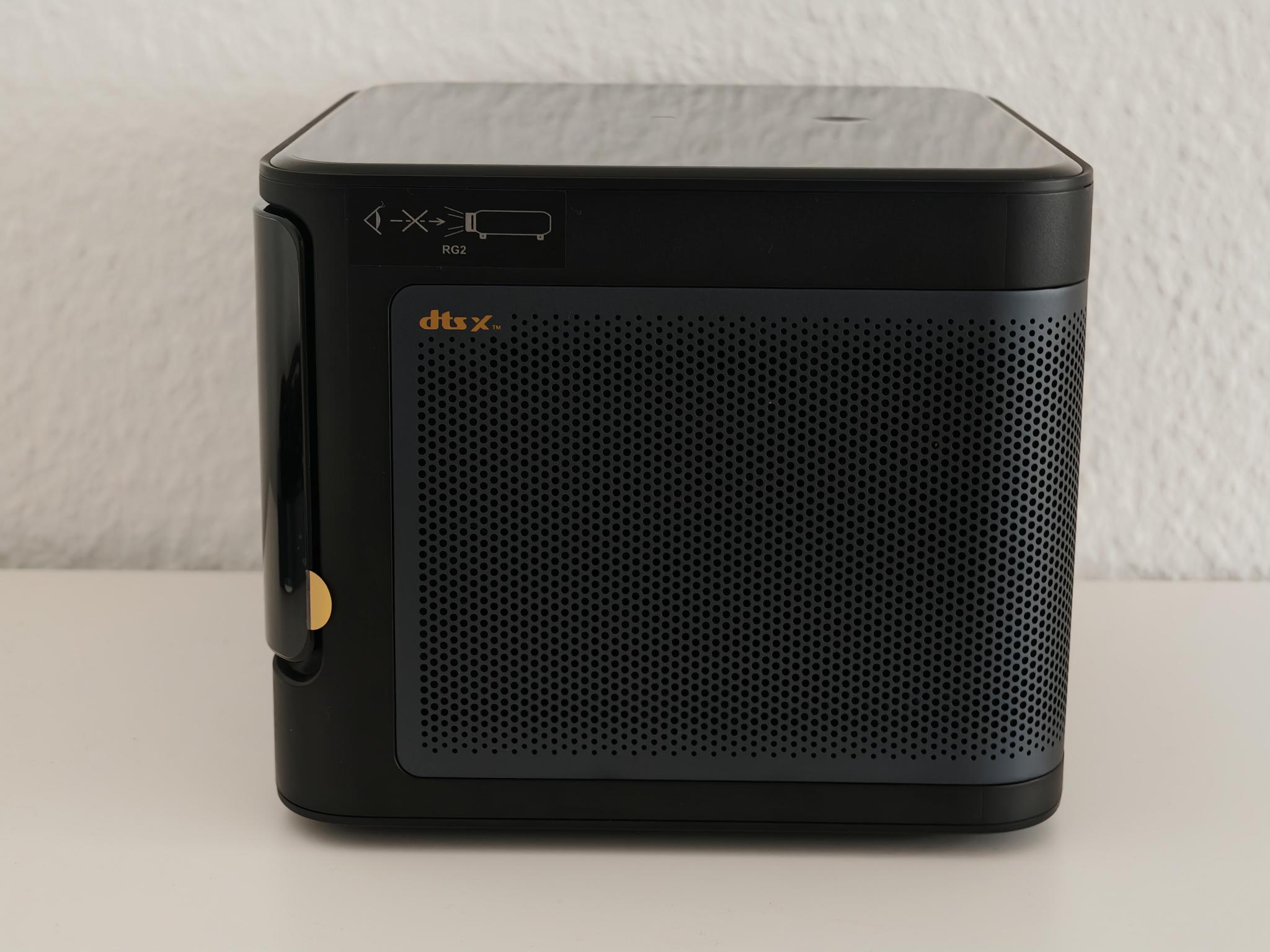 Die präsente Linse auf der Vorderseite verfügt über einen Anti-Staub-Linsenschutz (eine dünne Schicht). Auf der Seite befinden sich das Herstellerlogo, eine weitere Glasumrahmung und mehrere Sensoren zur Bildanpassung. Die Lautsprecher sitzen unter einem perforierten Rahmen auf der linken und rechten Seite. Die warme Abluft stößt das Gerät seitlich aus.