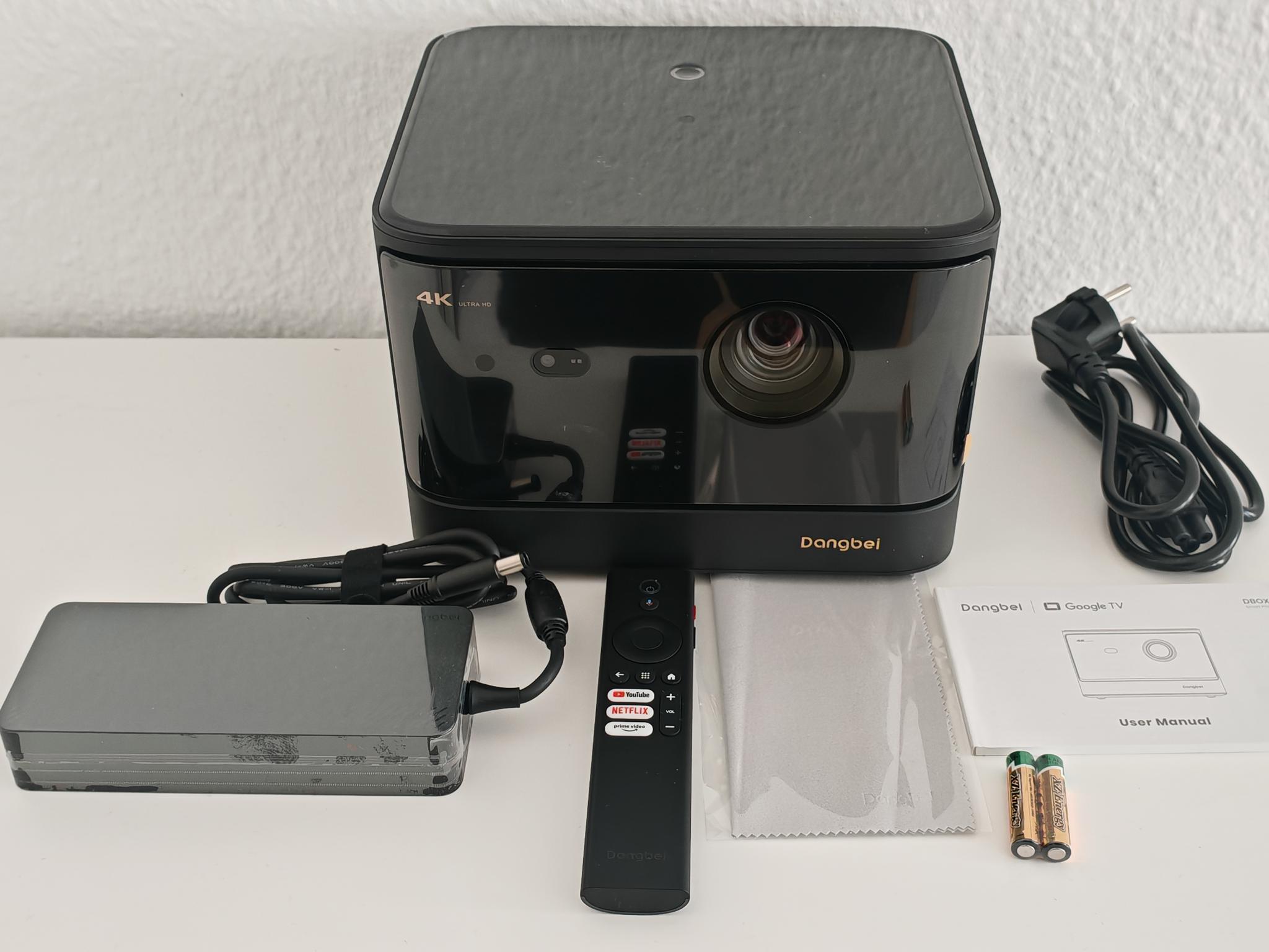 Der Dangbei Mars Pro 2 bietet einen durchschnittlichen Lieferumfang. Enthalten sind eine Bluetooth-Fernbedienung (inklusive zwei AAA-Batterien), ein Mikrofasertuch, ein 180-Watt-Netzteil mit Netzkabel und eine mehrsprachige Bedienungsanleitung.
