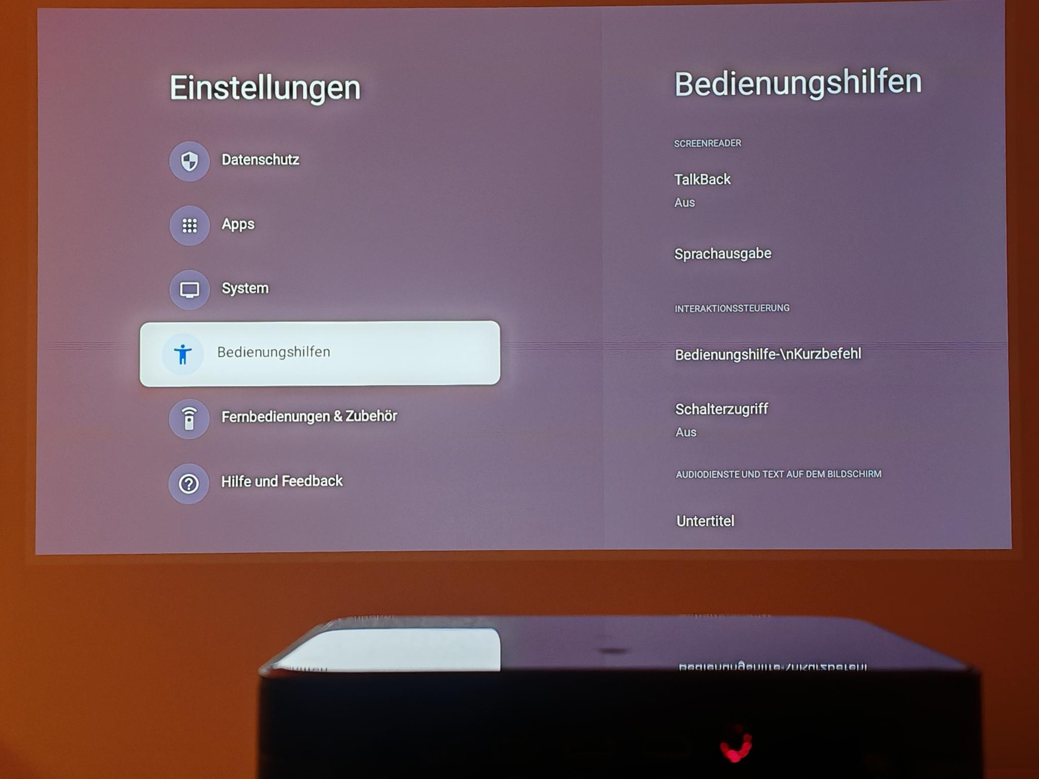 Ein häufiges Problem preiswerter Beamer und Fernseher ist die eher mäßige Bediengeschwindigkeit der Oberfläche unter Google TV. Das traf auch auf viele unserer Testgeräte mit dem Betriebssystem zu. Beim Dangbei Mars Pro 2 hingegen ist die Geschwindigkeit der Benutzeroberfläche wirklich schnell – einer der schnellsten, die ich bisher unter Google TV bei Beamern erlebte. Alle Eingaben setzt das System zügig um, sodass ihr euch nicht erst mit der Eingabe der Benutzerdaten bei den Pay-to-Watch-Anbietern herumärgert, bevor ihr die erste Folge der Serie über den Beamer genießt. Auch die Spracheingabe über Google funktioniert problemlos. Praktisch bei der Bedienung sind zudem die seitlichen Tasten der Fernbedienung. Mit der schwarzen Taste öffnet ihr die Schnelleinstellung, die orangefarbene Taste fokussiert den Beamer.
