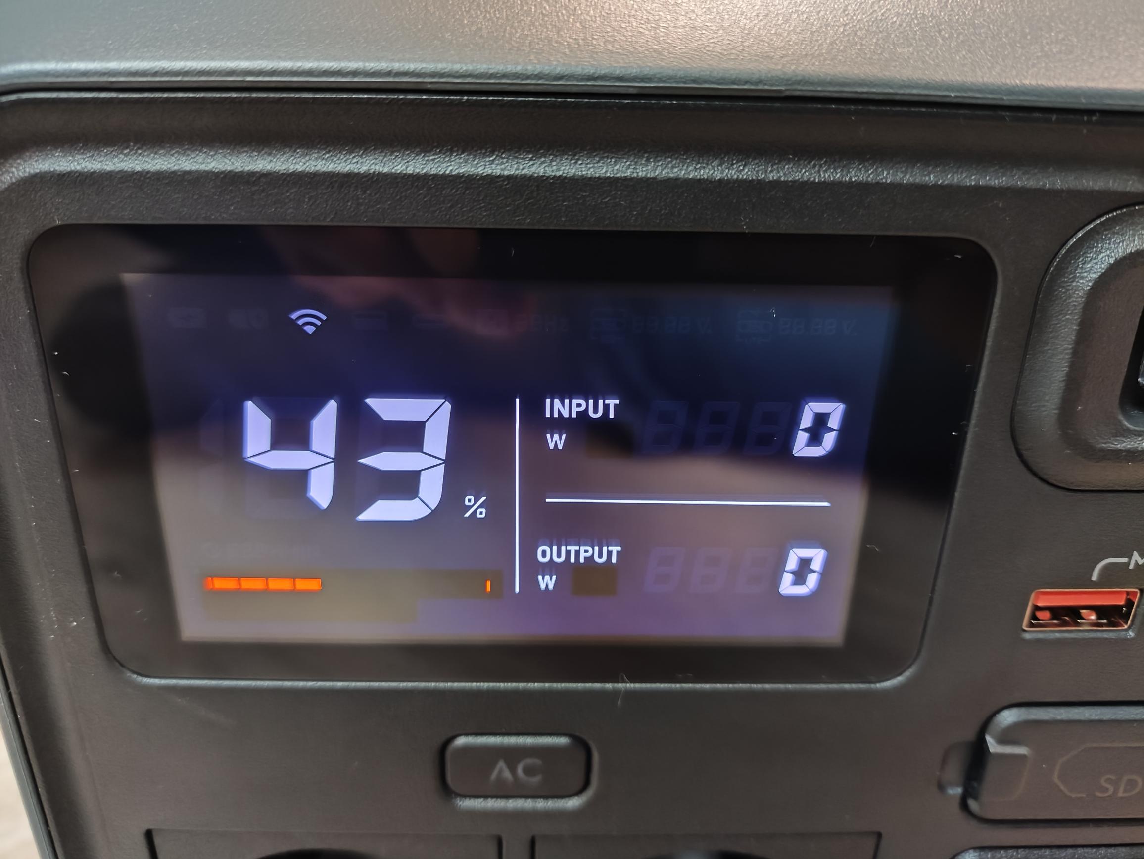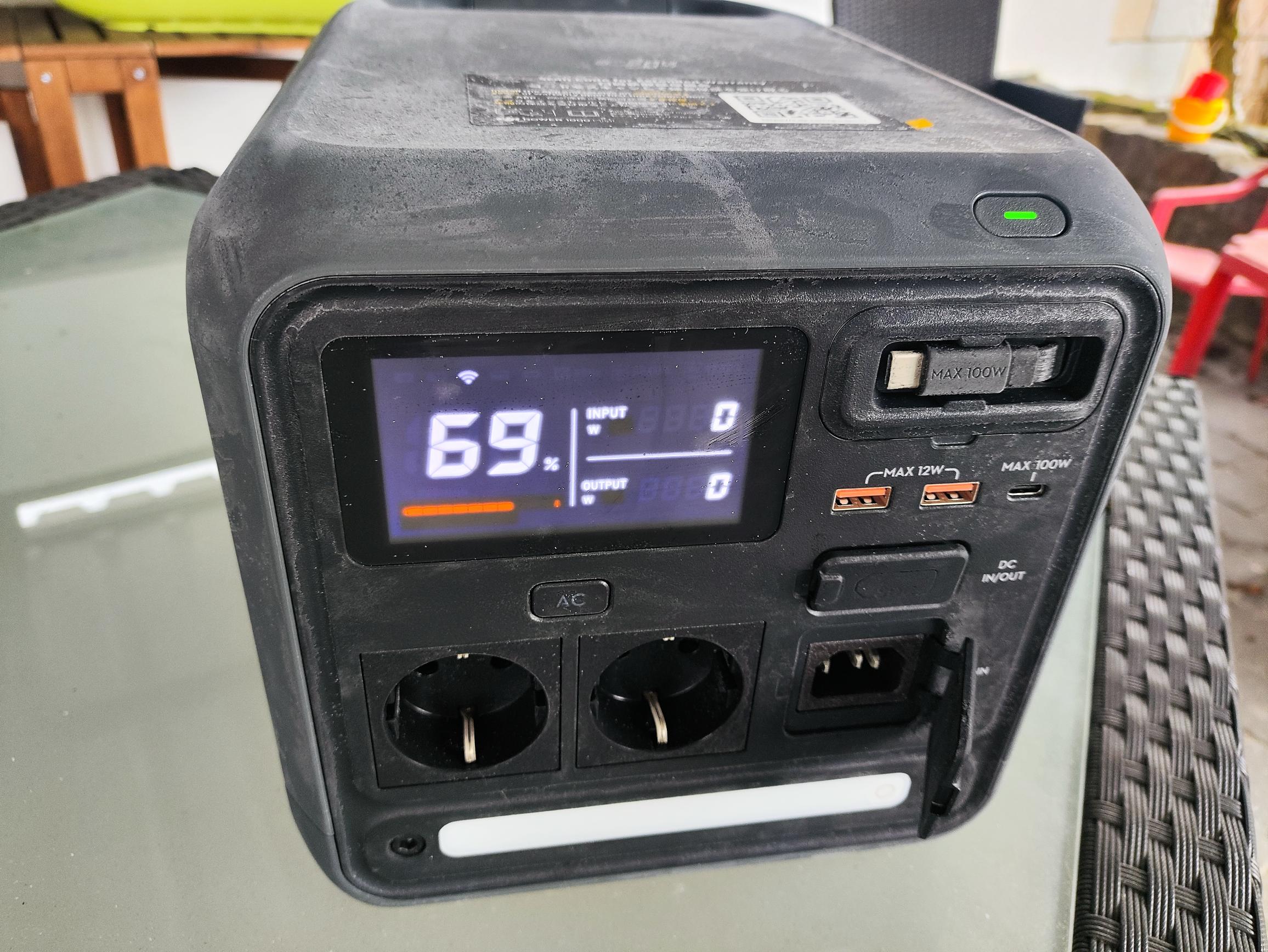 Das Display kennen wir bereits aus dem Test der DJI Power 2000. Es bietet eine gestochen scharfe Darstellung und eine ausgezeichnete Ablesbarkeit auch bei direkter Sonneneinstrahlung. Neben der verbleibenden Akkukapazität informiert euch die Anzeige über die Eingangs- und Ausgangsleistung, Restlaufzeit und Betriebszustände (aktivierte Ausgänge, Fehlermeldungen, WLAN) der Powerstation.
